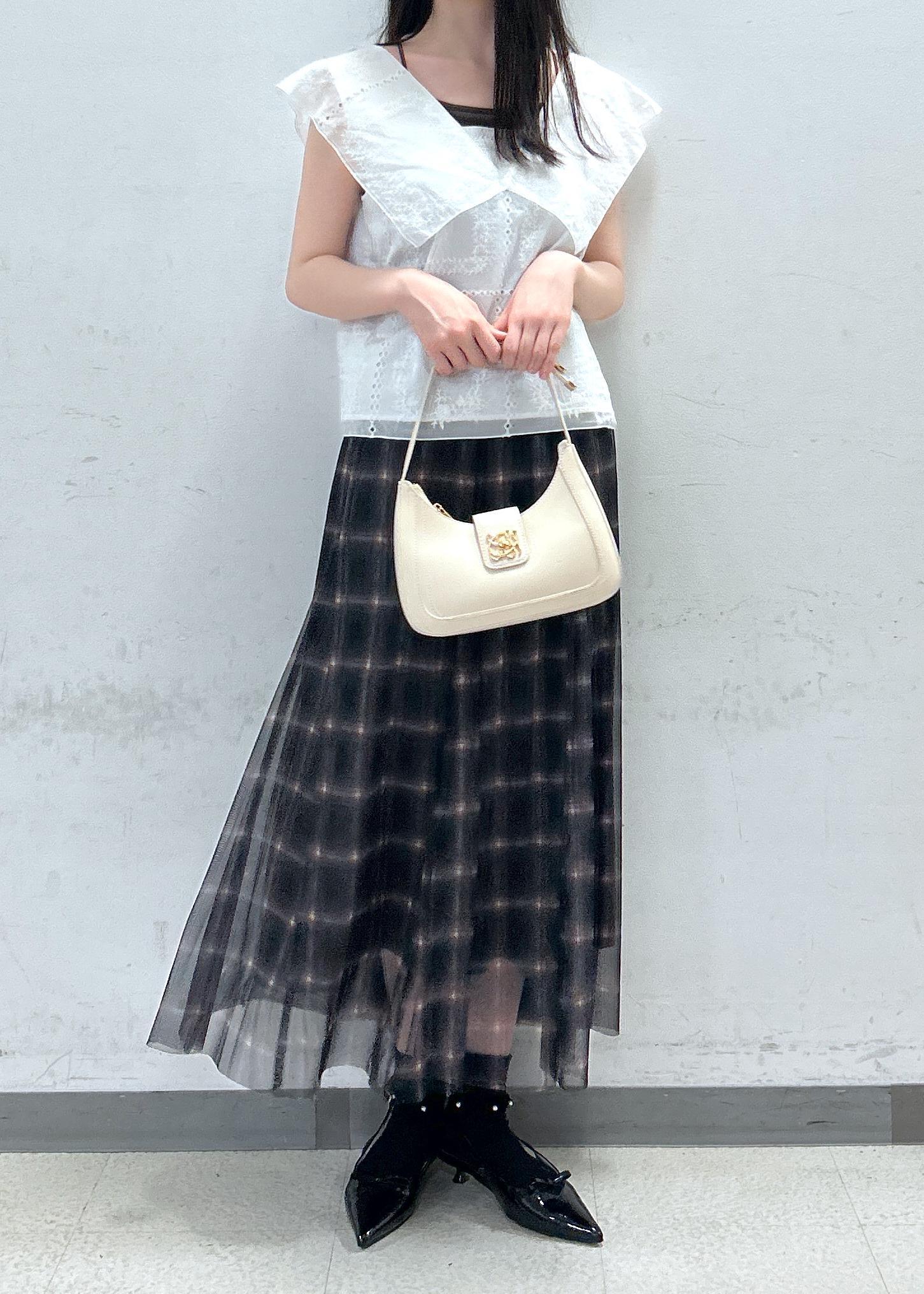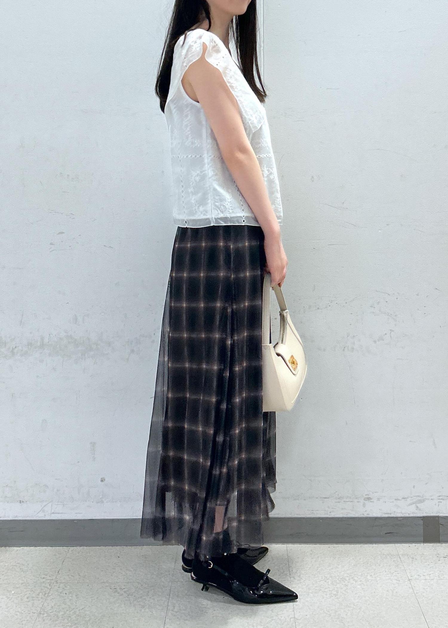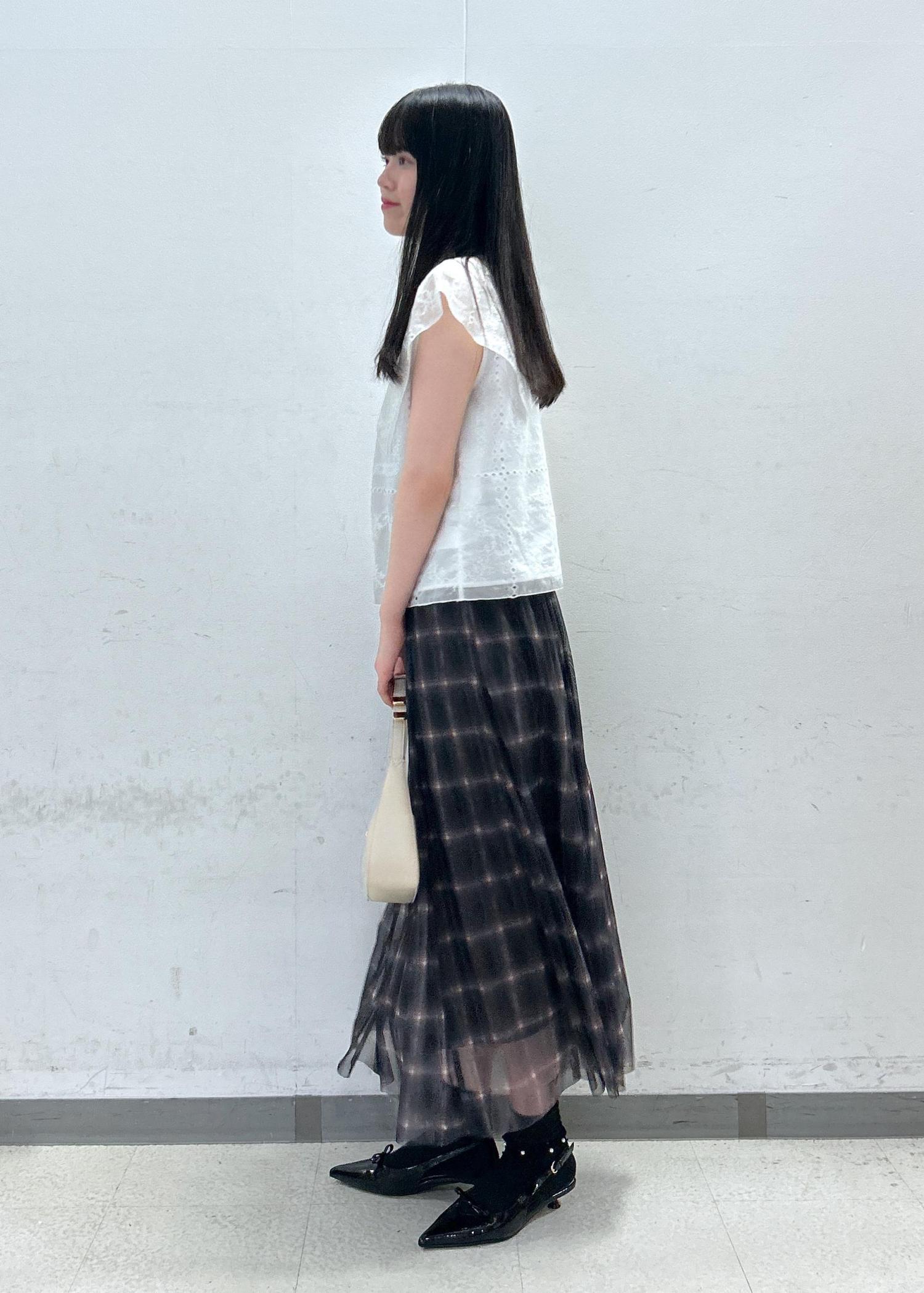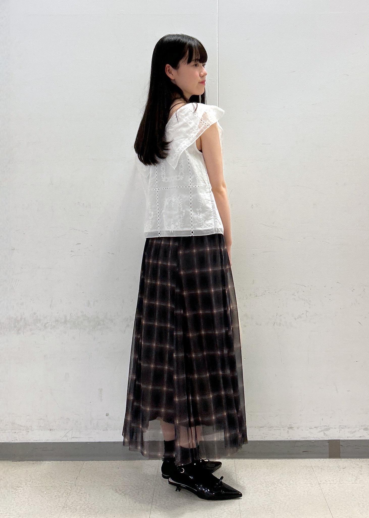 VIS【洗える】チュールプリントチェックスカートダークブラウン系 / F¥4,612レビューチュールがふわっと風に揺れるフェミニンなスカート。裾に向かって3角のマチが入っているので腰周りはスッキリ、蹴回しは広めの女性らしいシルエットです♡柔らかい素材&ウエストがゴムなので窮屈感無く楽に着用していただけます。