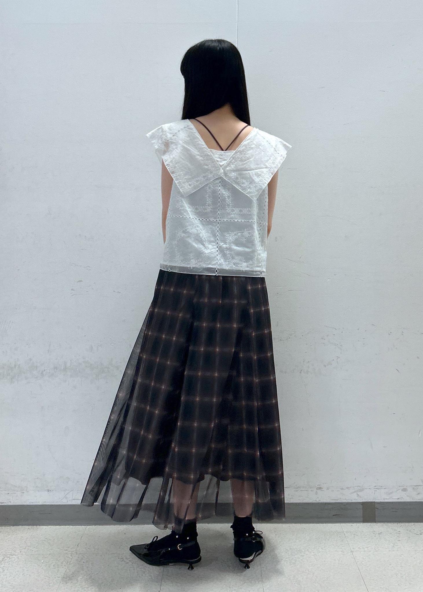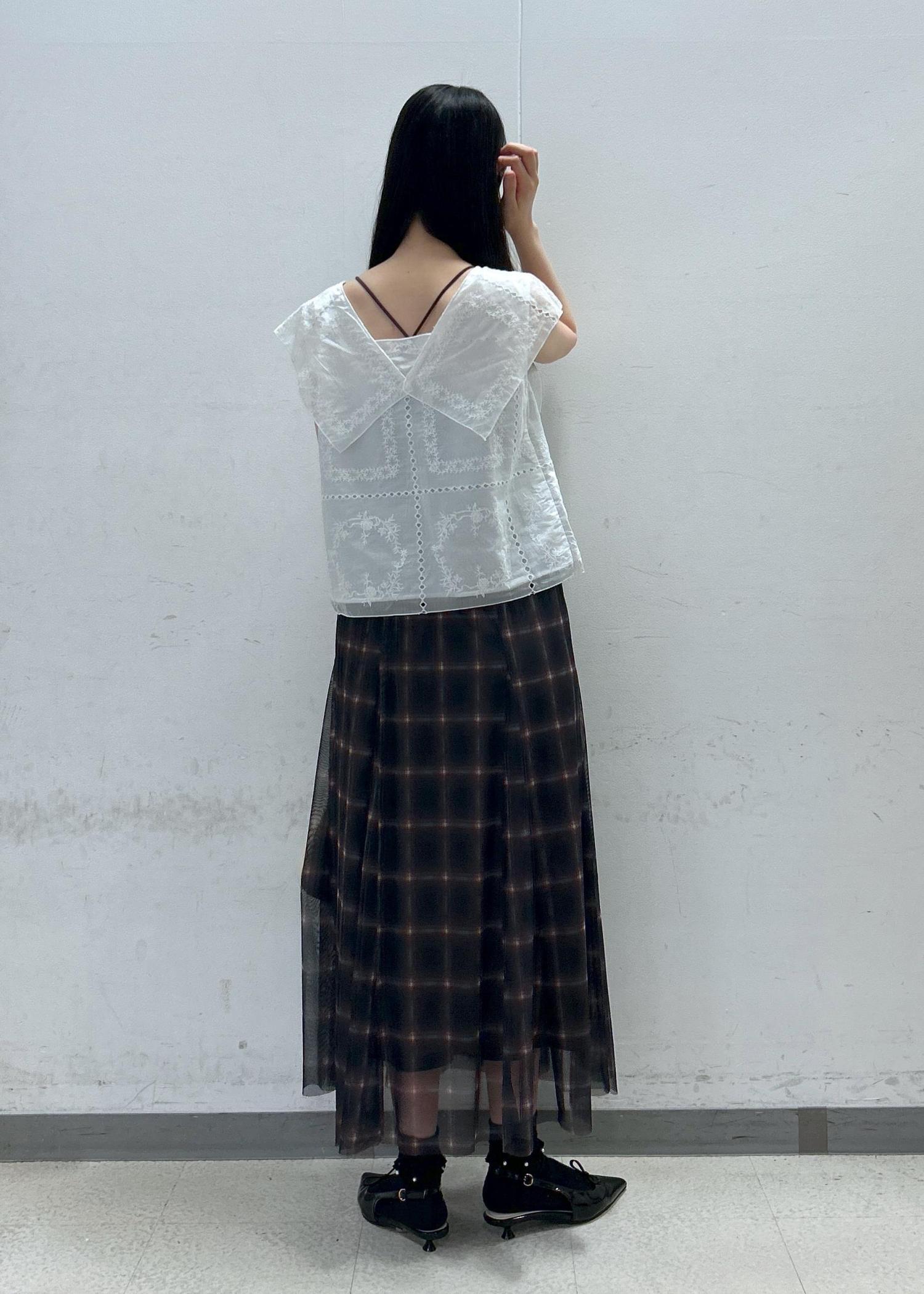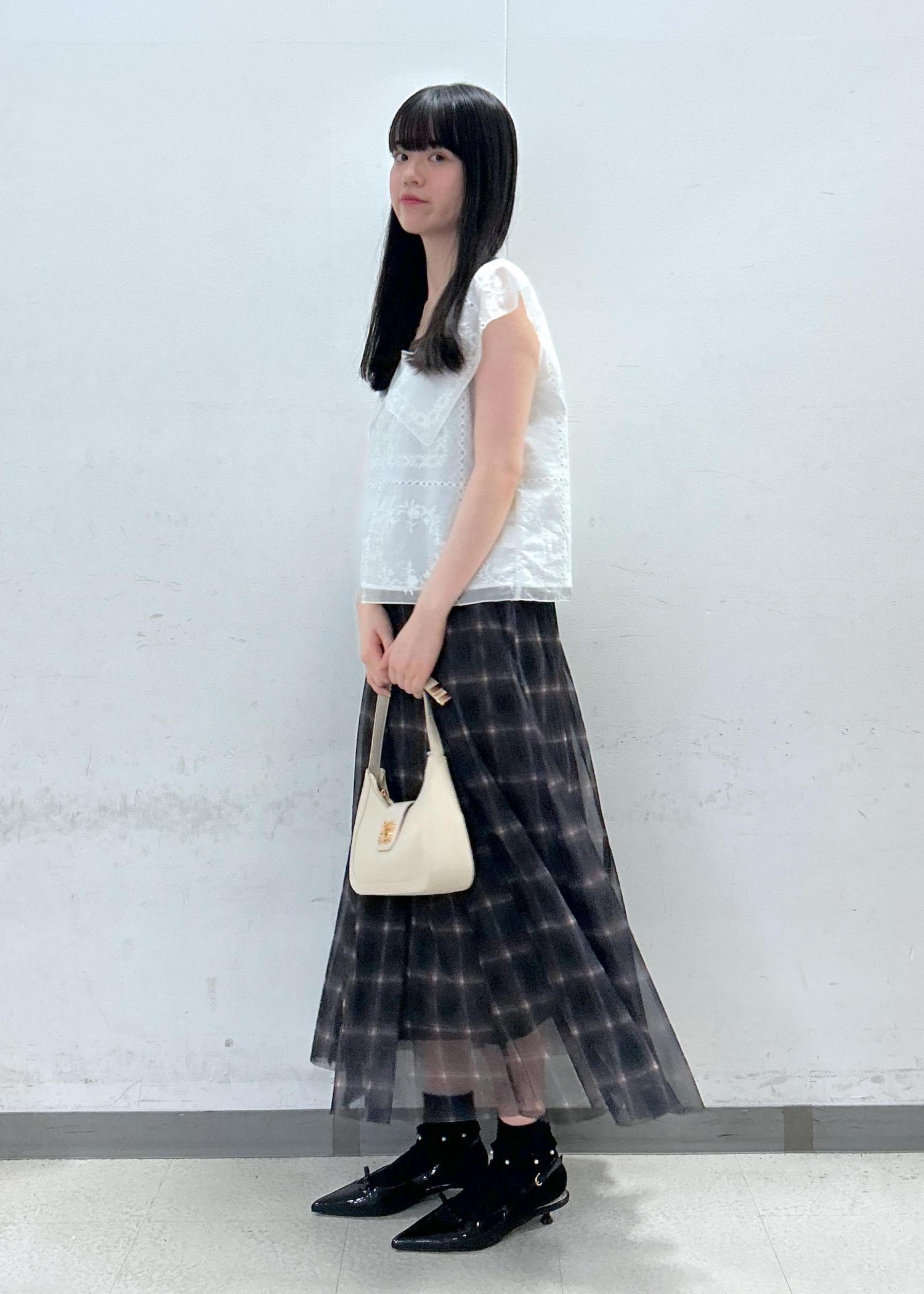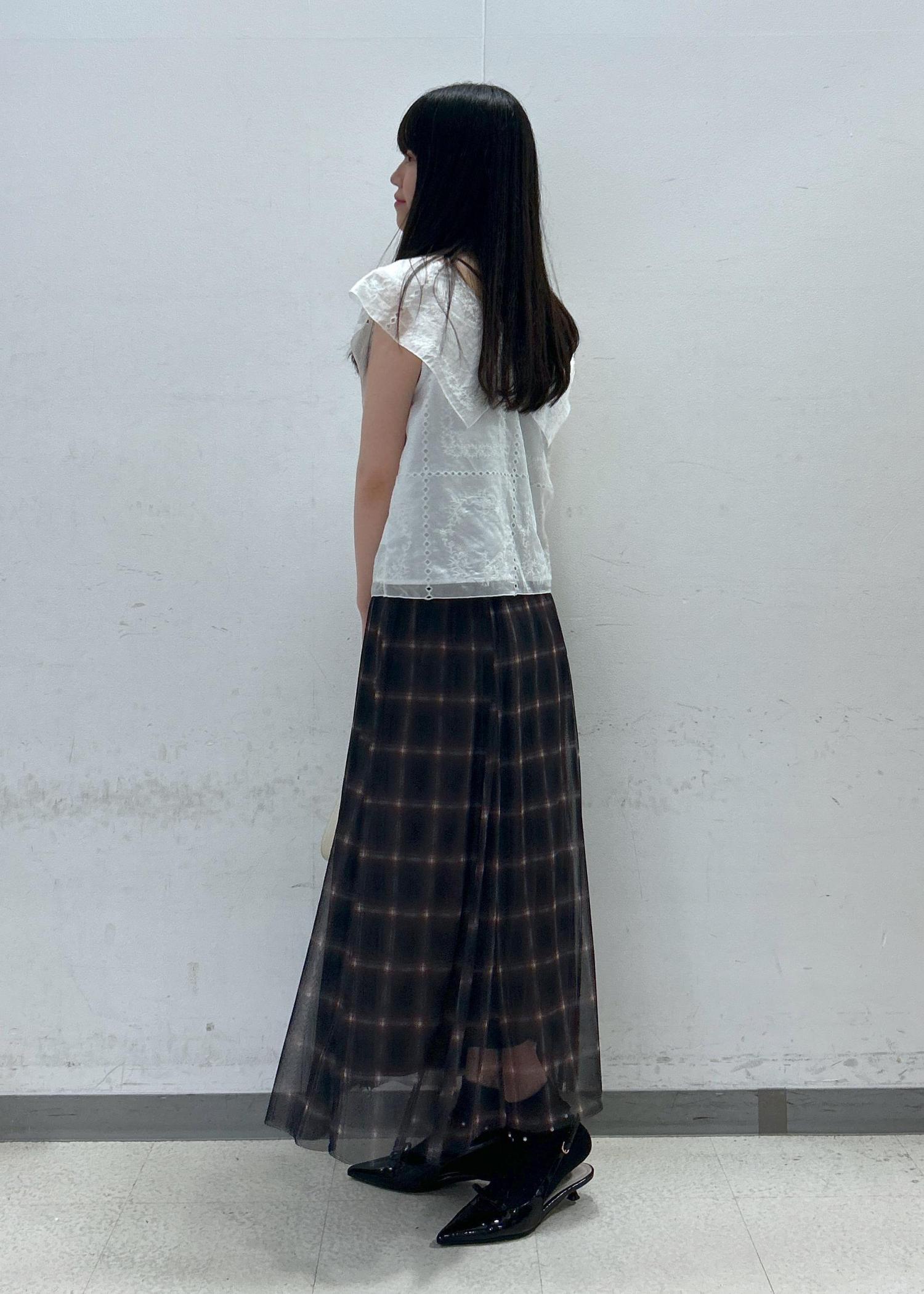 VIS【洗える】チュールプリントチェックスカートダークブラウン系 / F¥4,612レビューチュールがふわっと風に揺れるフェミニンなスカート。裾に向かって3角のマチが入っているので腰周りはスッキリ、蹴回しは広めの女性らしいシルエットです♡柔らかい素材&ウエストがゴムなので窮屈感無く楽に着用していただけます。