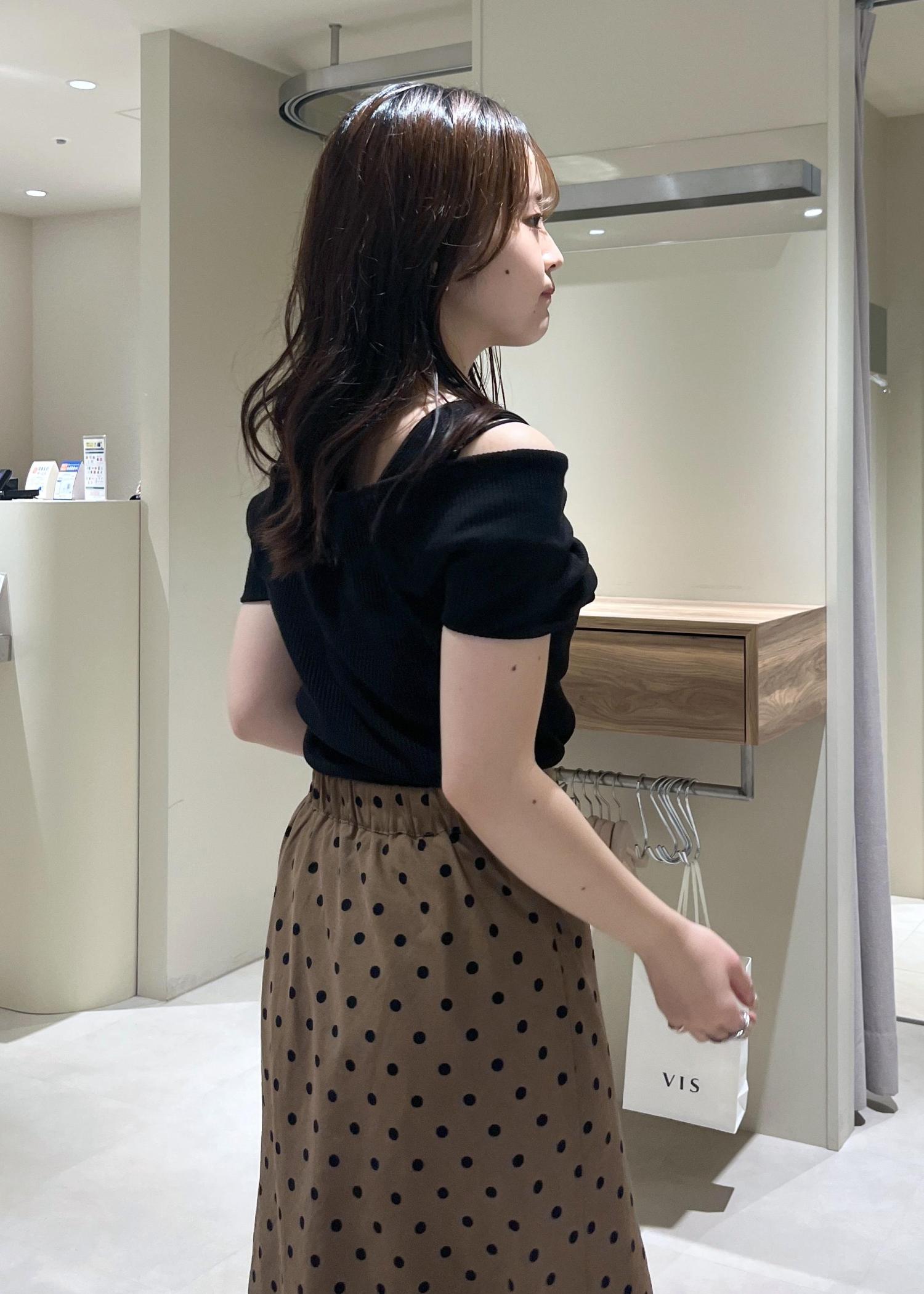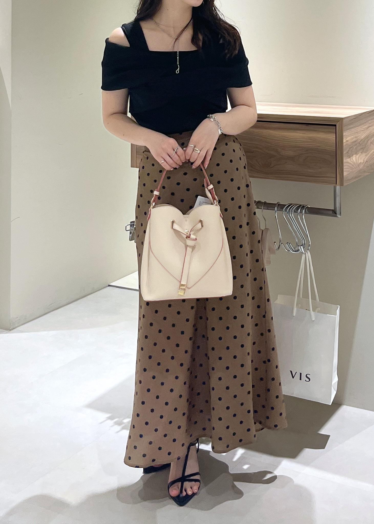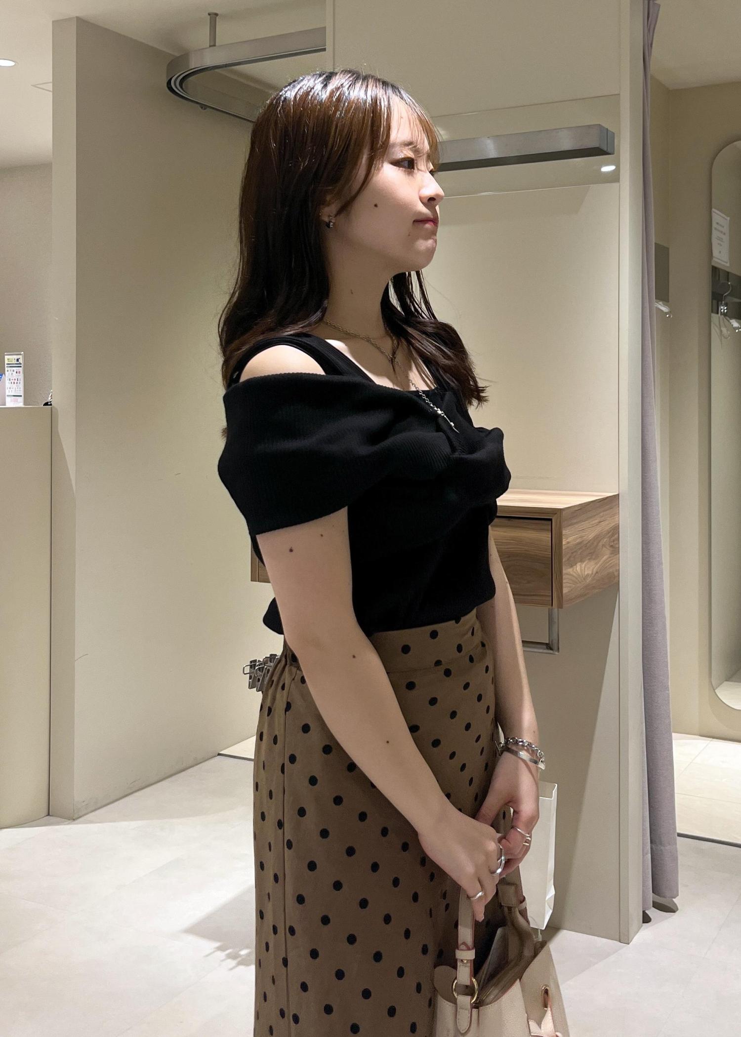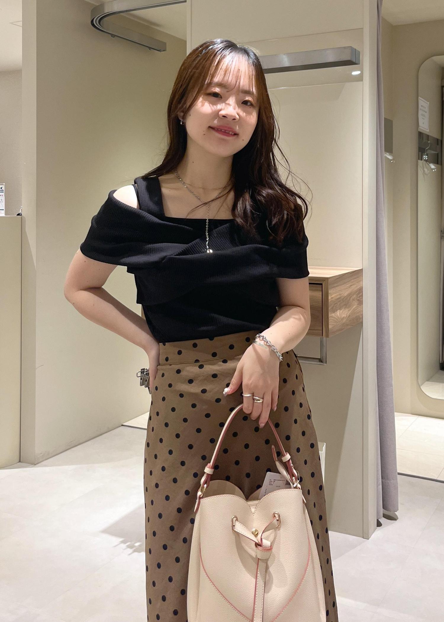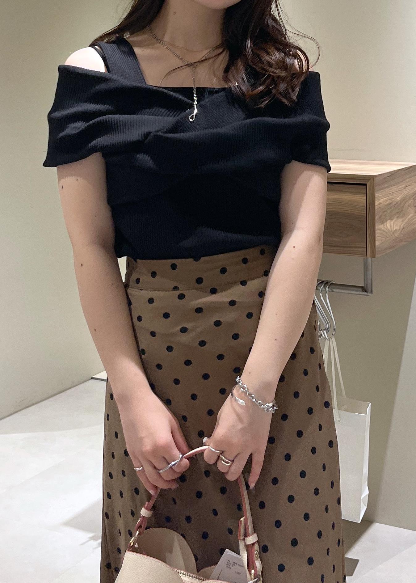 紐部分がアシンメトリーなデザインになるので、デコルテ周りがあいているトップスを着ても可愛いなと思いました☺︎ -
