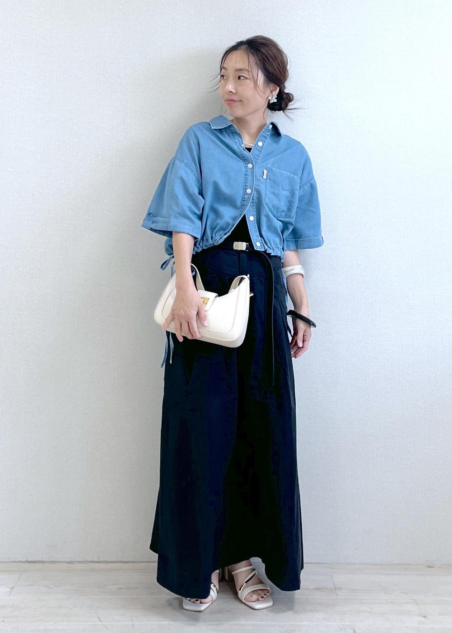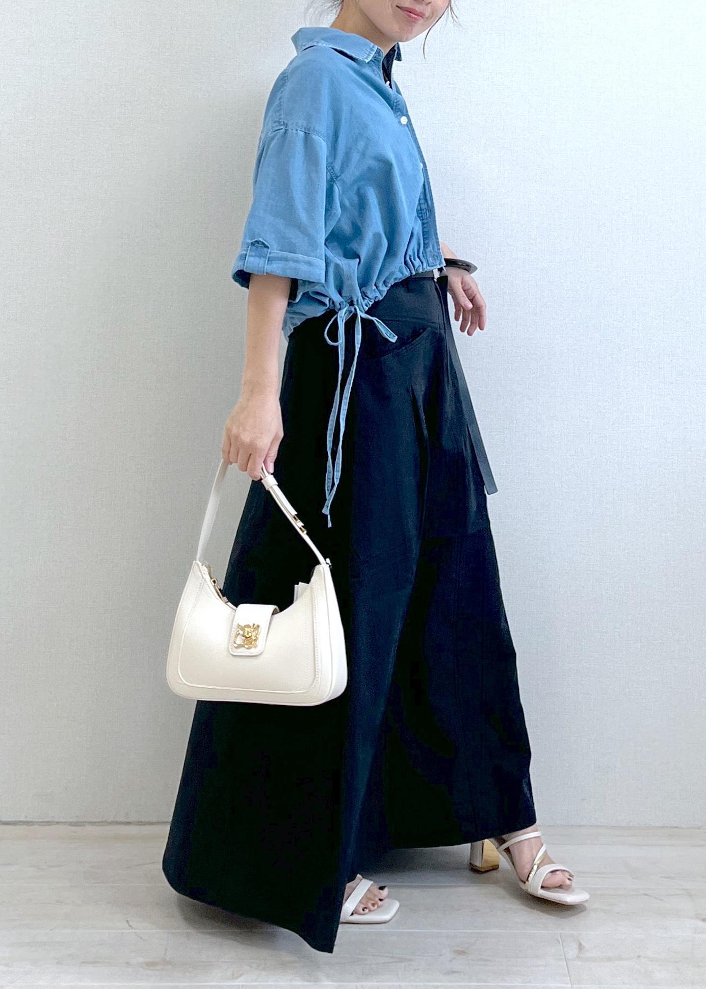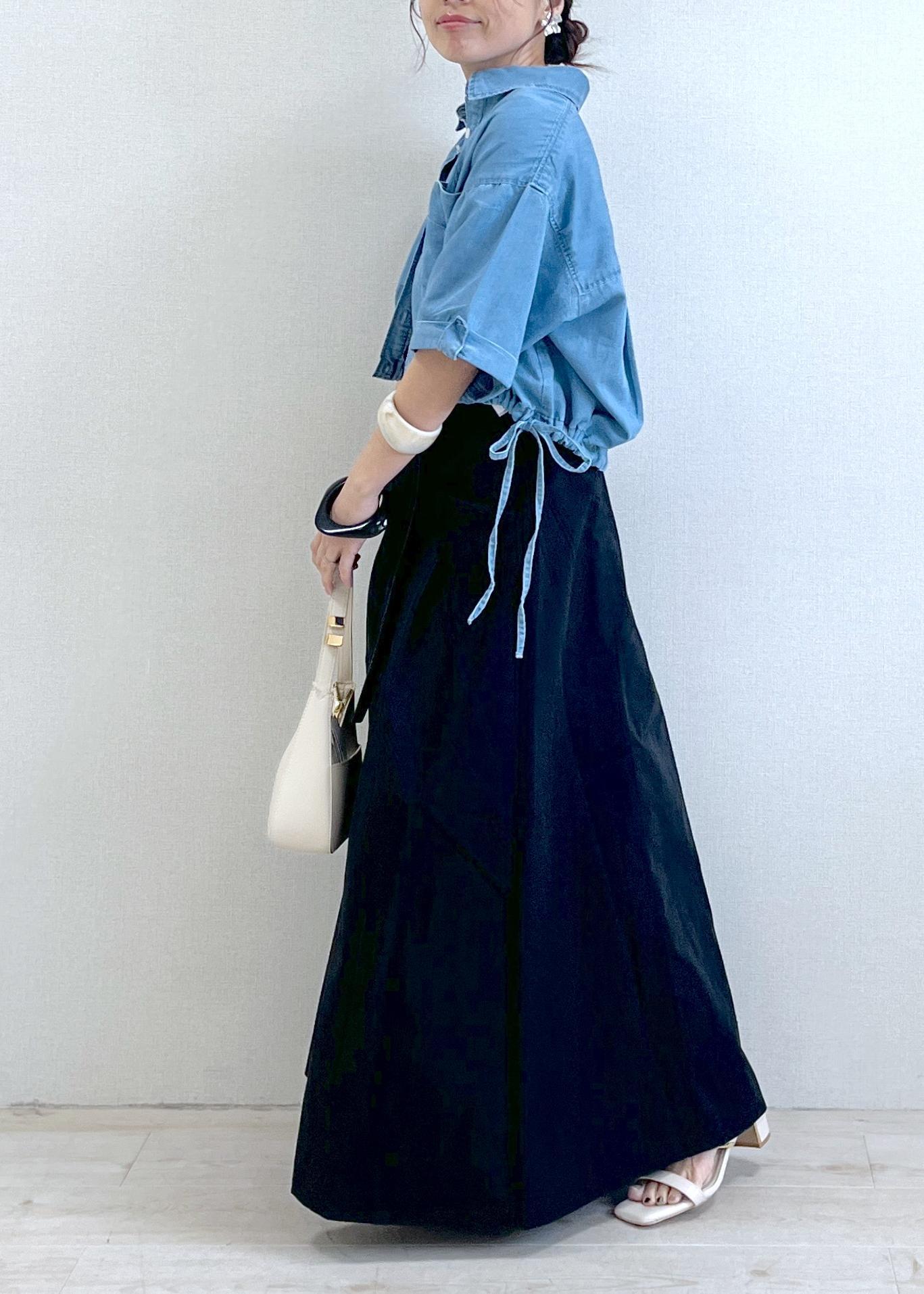 店舗限定のシャカスカートは、程よいハリ感でカジュアルでもきちんと見え。