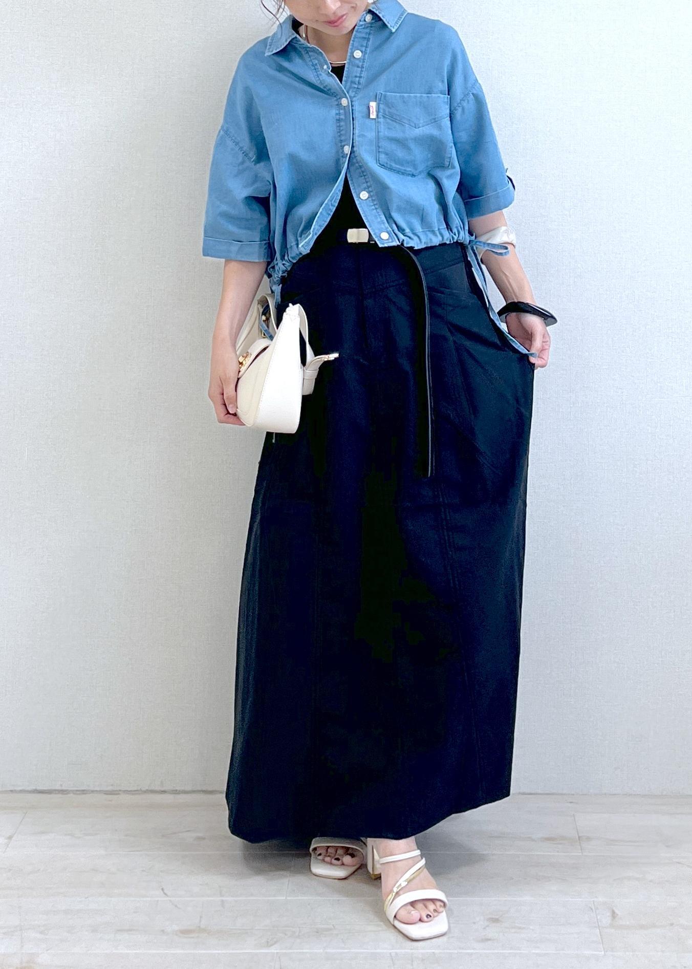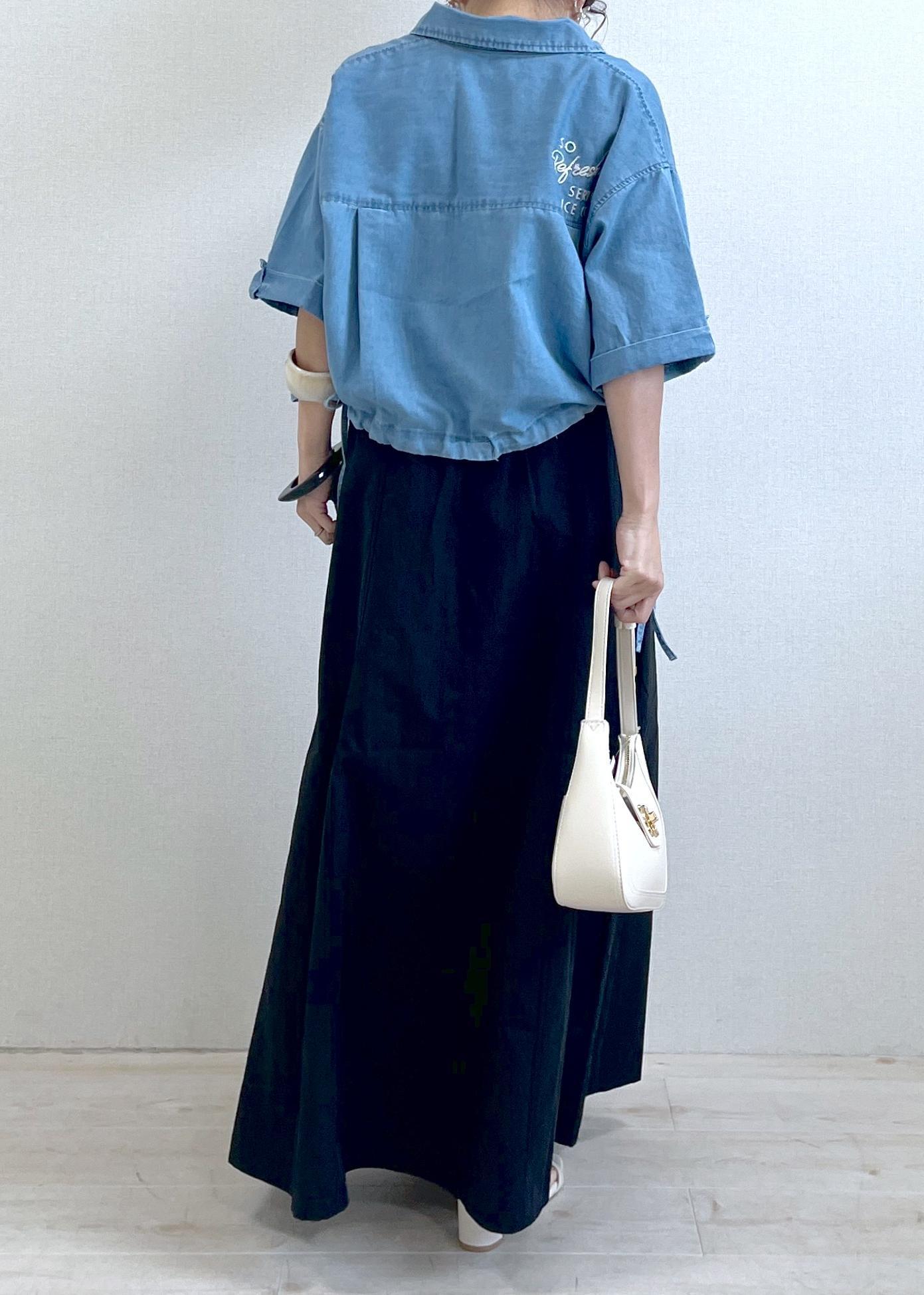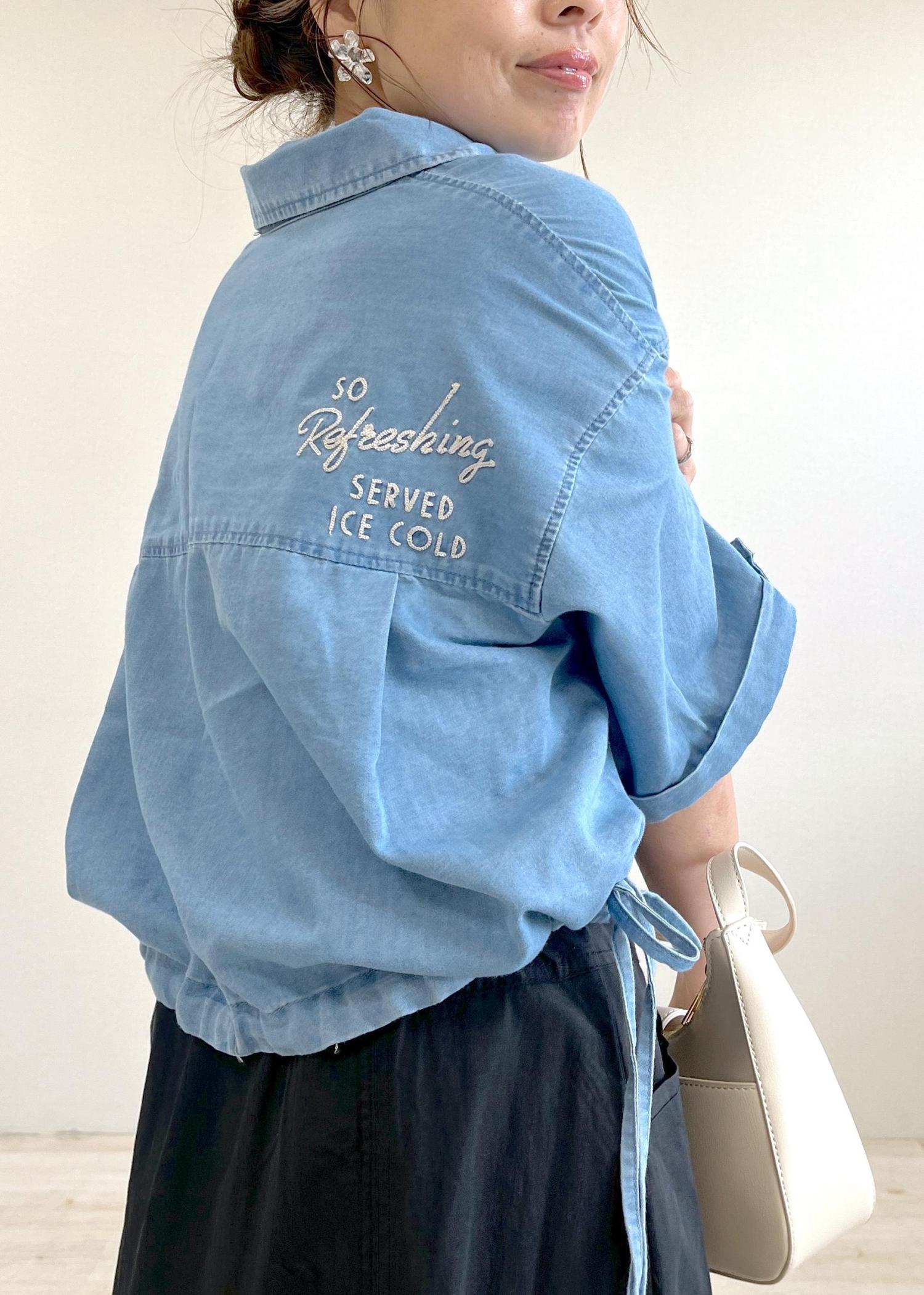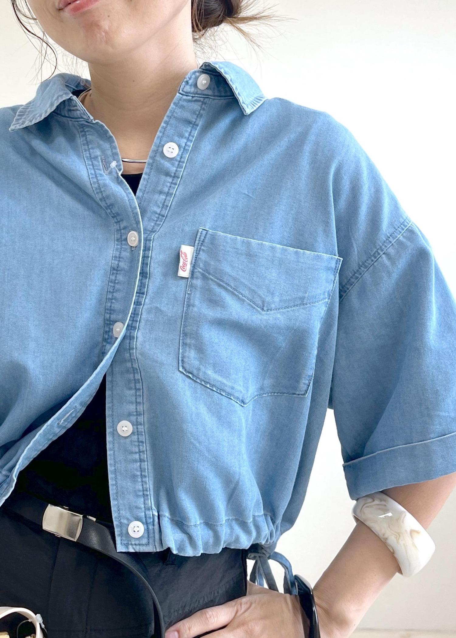 VIS【Coca-Cola】VIS別注バックエンブロイダリークロップドシャツブルー系 / F¥5,390レビューCoca-Colaとのスペシャルアイテム!152cmで腰に少しかかるくらいの着丈。裾は絞りのデザインなので、着丈の調節ができます。コンパクトなサイズ感なのでパンツ、スカートどちらのスタイリングにも◎とても柔らかいデニム素材でゴワゴワ感が全くなくお召しいただけます。バックスタイルまで抜かりなし!