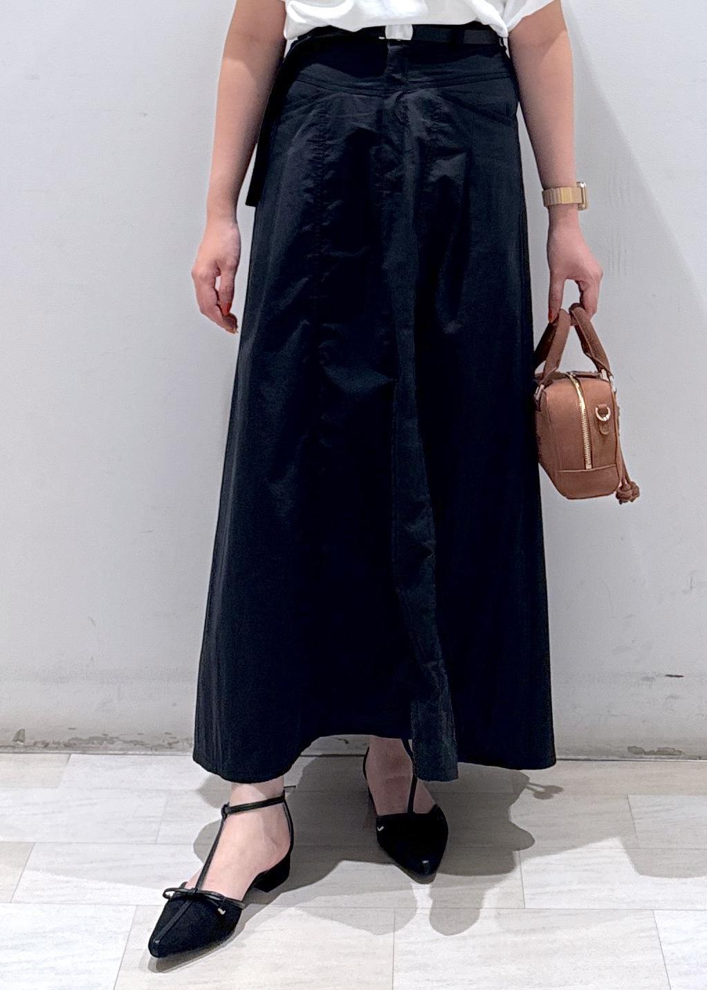 Aラインのブラックのスカートにベルトでウエストマーク。