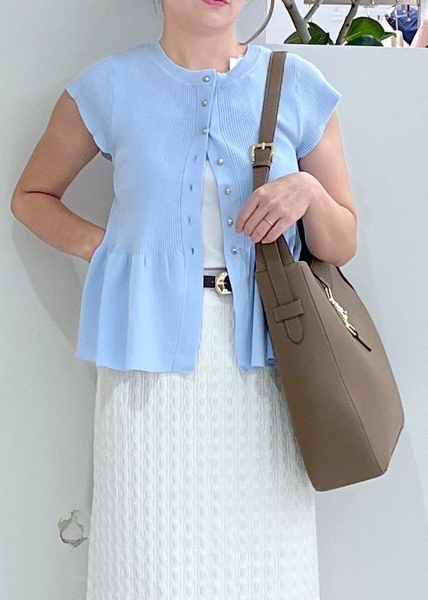 VIS【アンチピリング/洗える】美SMARTショートスリーブペプラムニットサックス / F¥5,489レビュー大人気のペプラムカーディガンが袖がコンパクトになり夏バージョンになりました。発色もキレイで合わせやすく、大人気です。カーディガンで羽織りとしても便利で、ペプラムのデザインがウエストもカバーしてくれます。モチモチサラサラの生地で着心地がとても良いです。