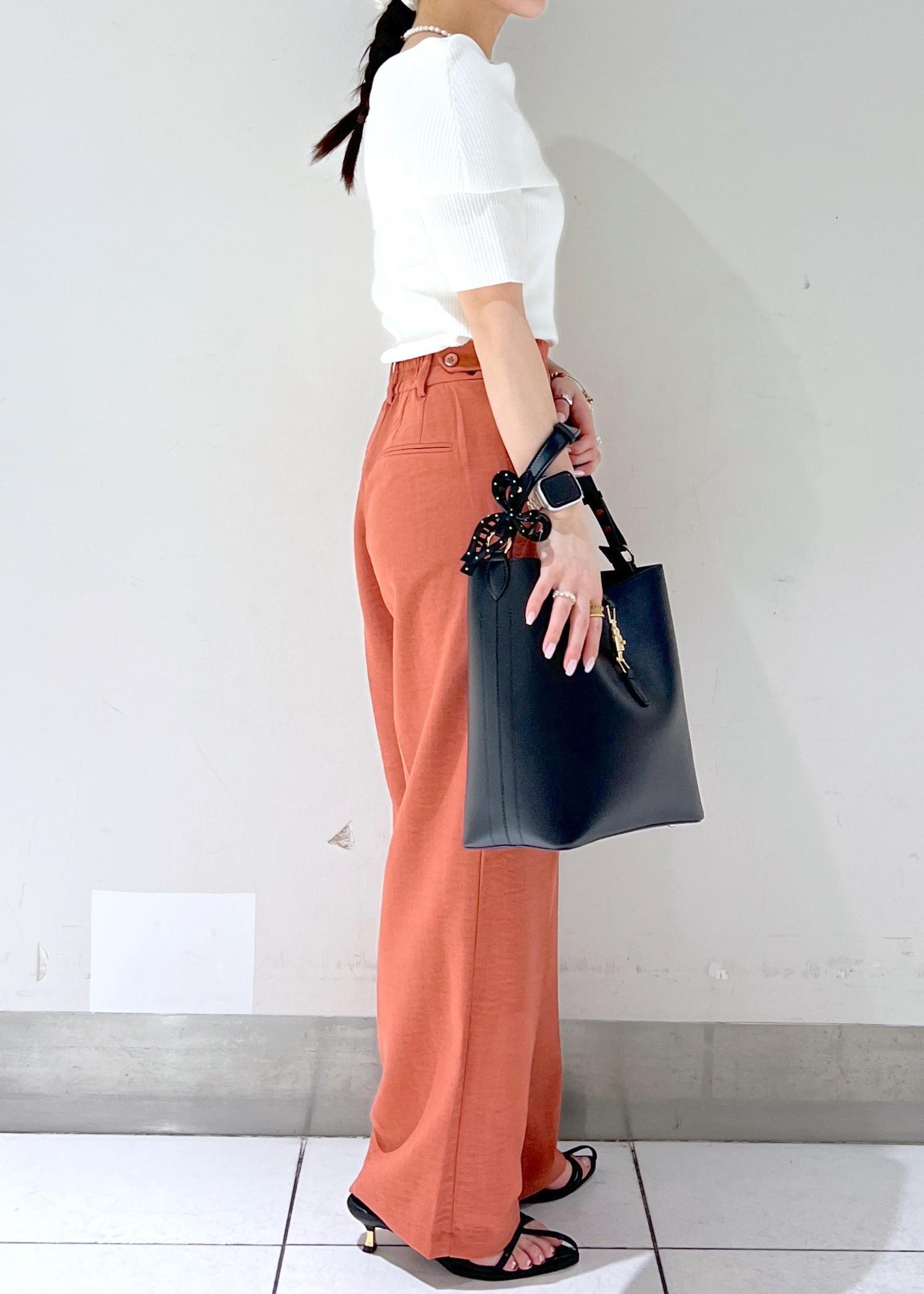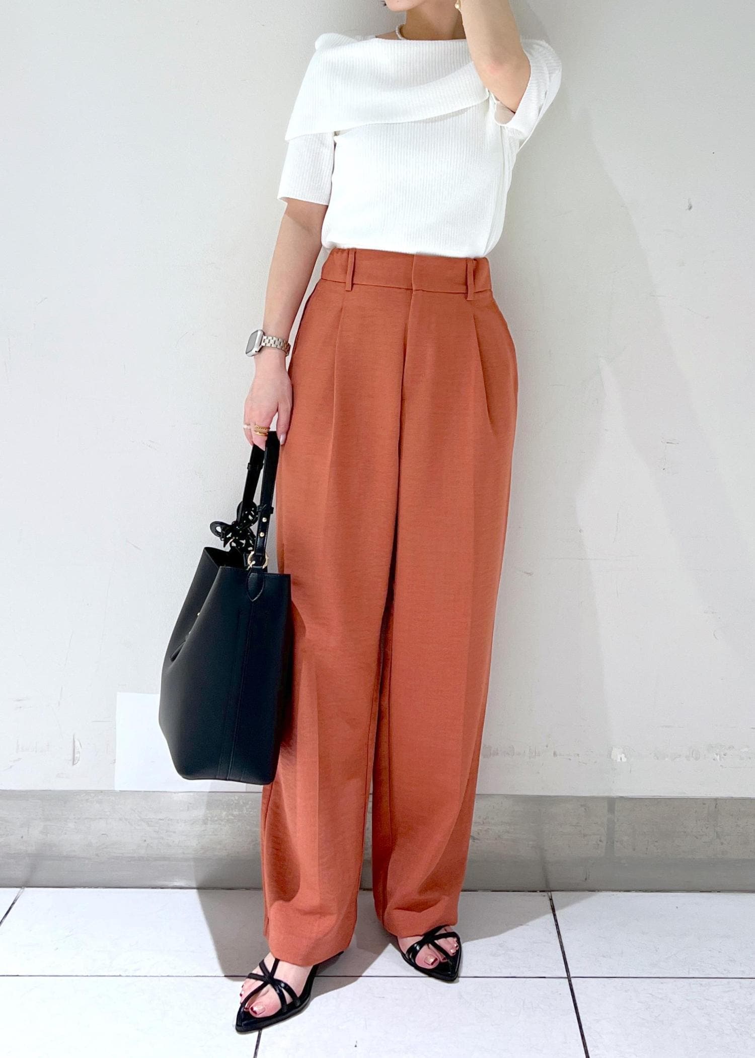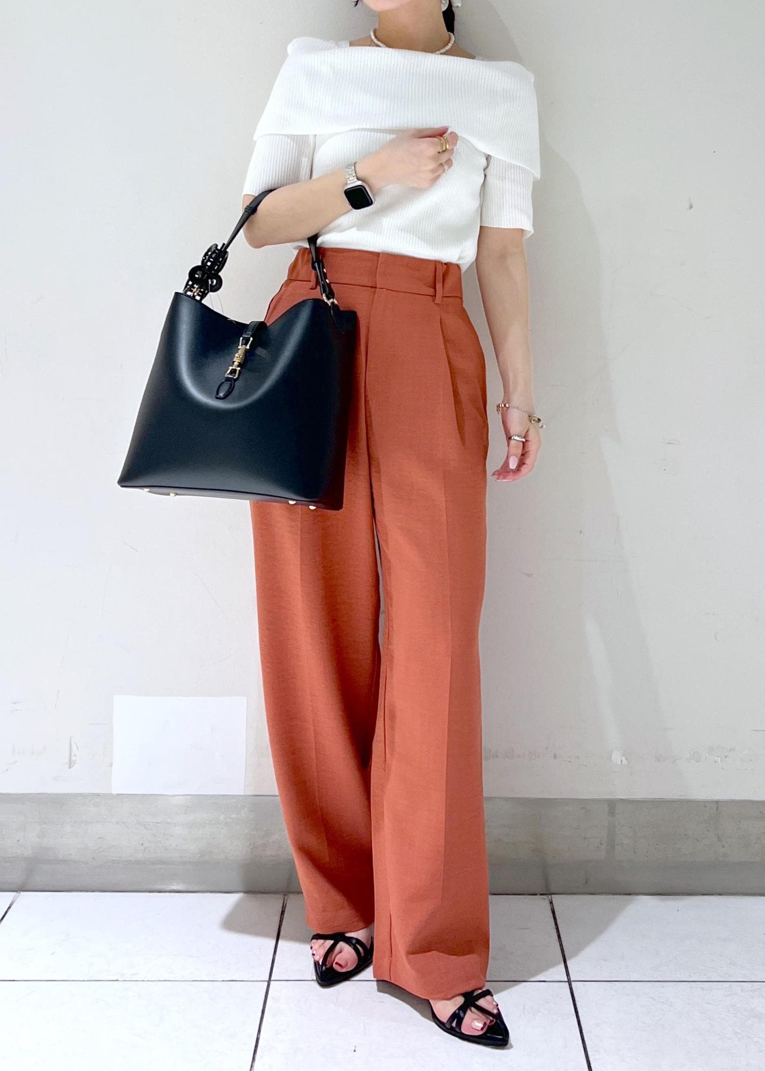 可愛いけど大人っぽさもあるオレンジ系のパンツをメインに、オフショルだと露出が気になるという方にもオススメなオフショル風トップスで気分の上がるオフィスコーデを組んでみました✨