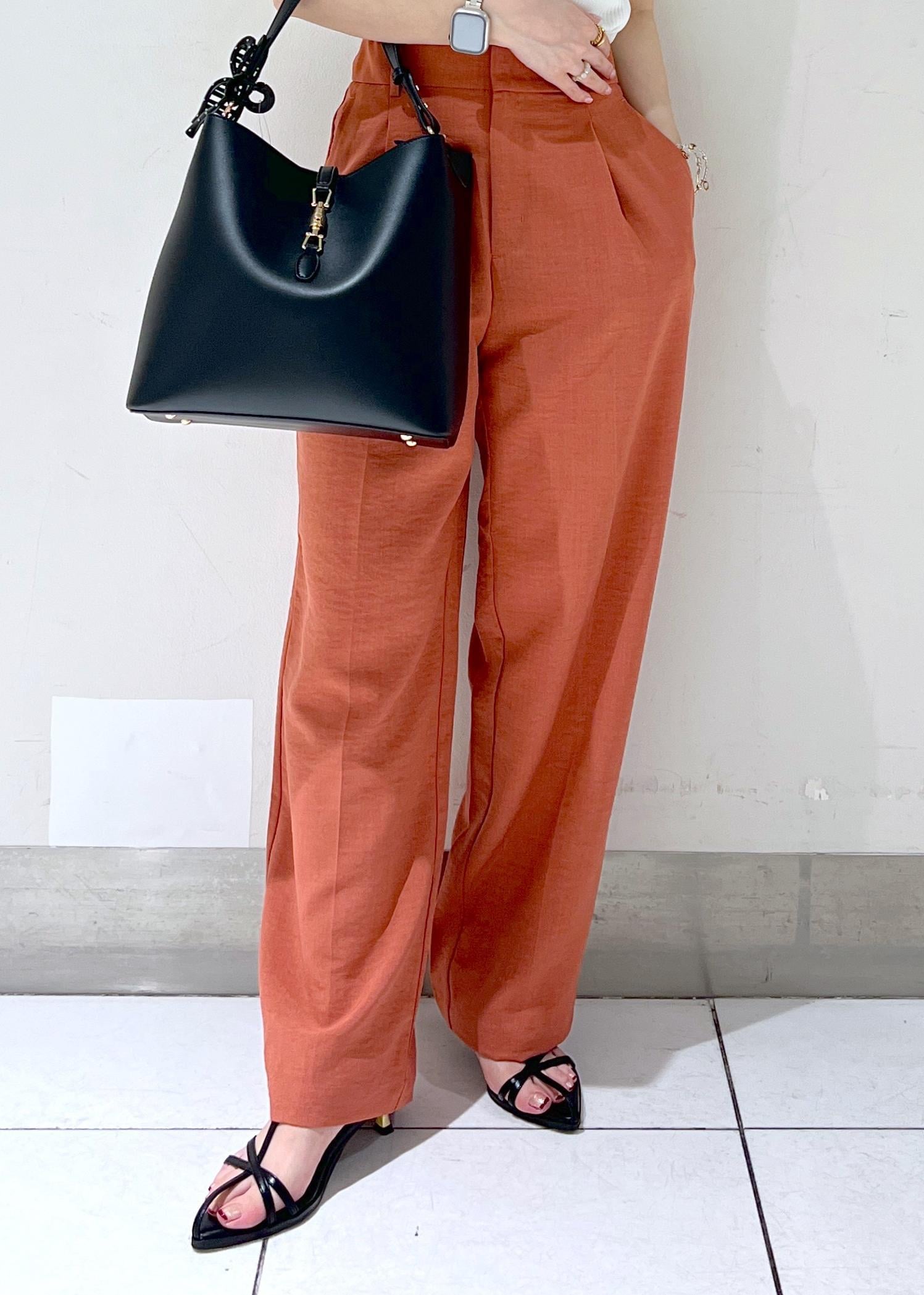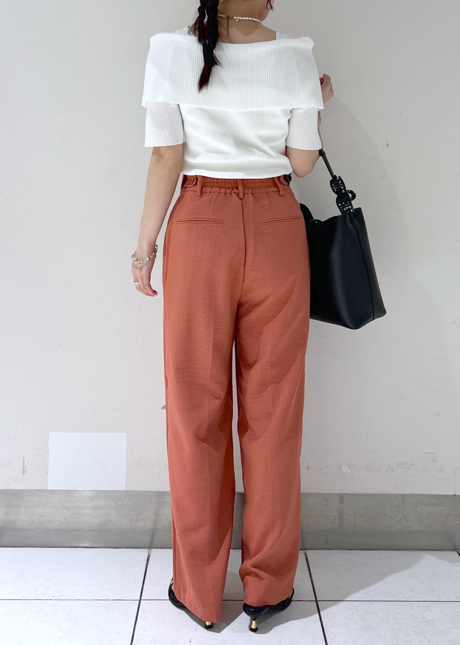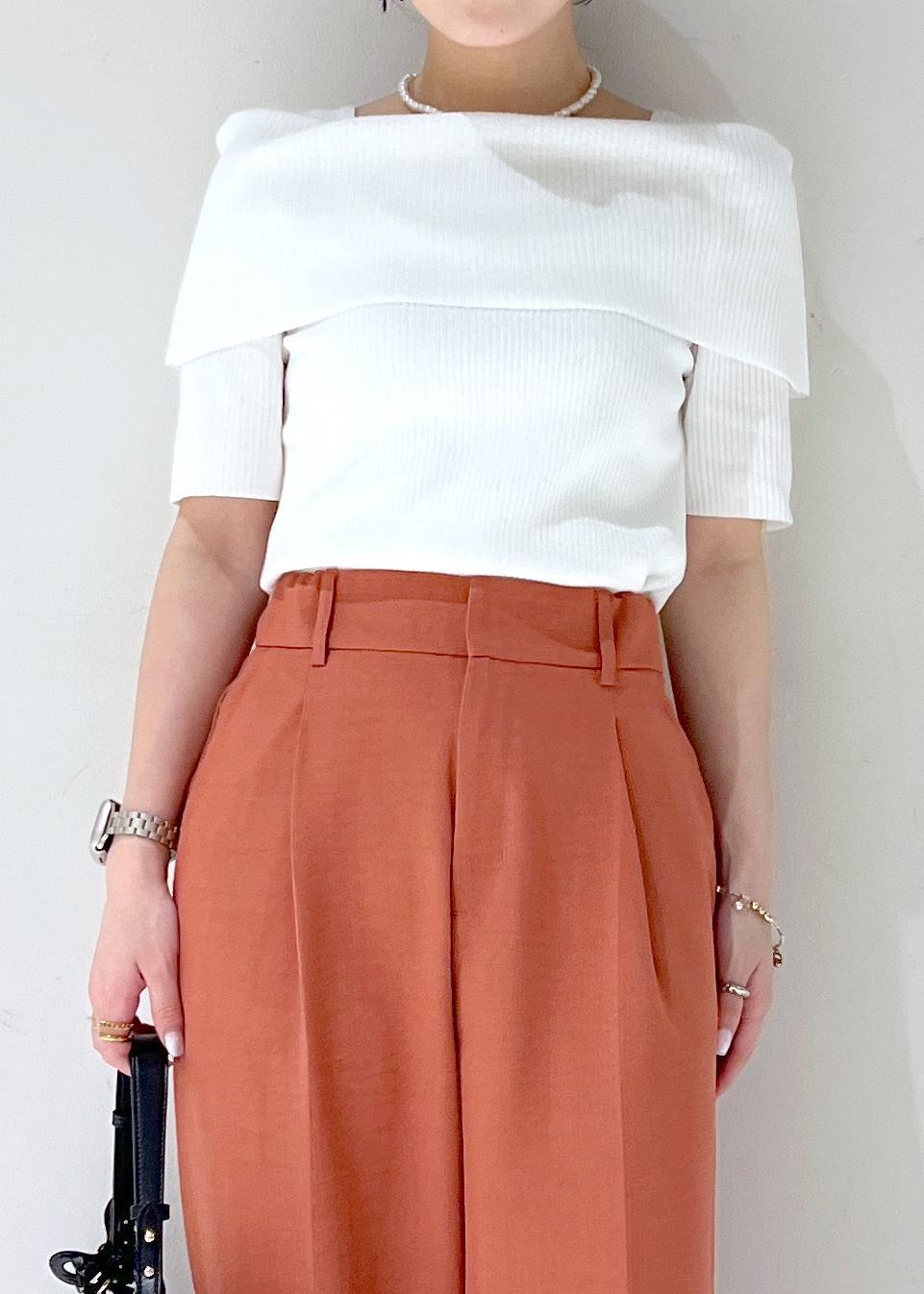 可愛いけど大人っぽさもあるオレンジ系のパンツをメインに、オフショルだと露出が気になるという方にもオススメなオフショル風トップスで気分の上がるオフィスコーデを組んでみました✨