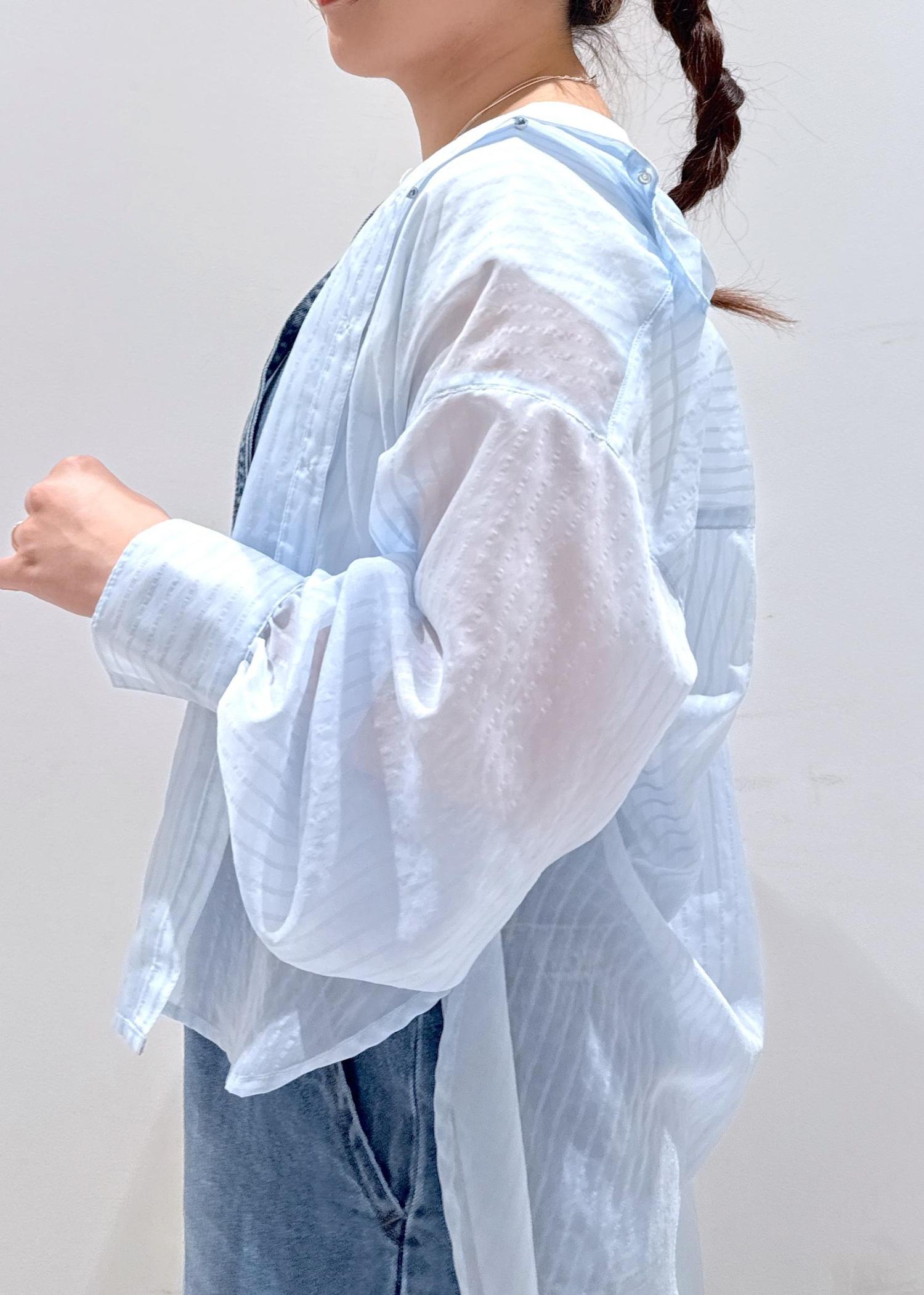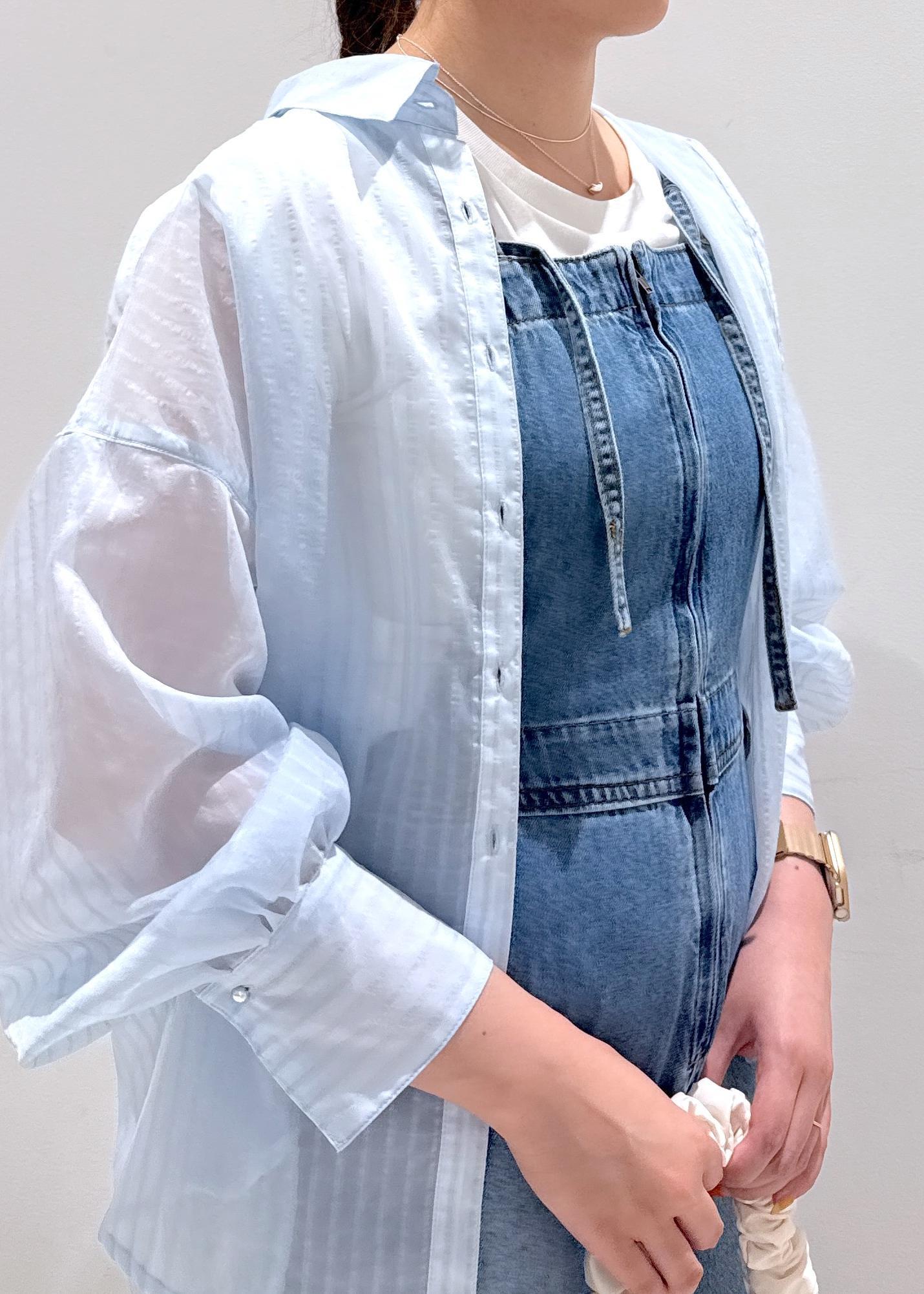 VISシアーストライプオーバーサイズシャツ/イージーケアサックス / F¥2,745レビューストライプ柄の模様が入ったシアーシャツ。透け感があるので中のインナー次第で見え方や色が変わります。またシャツになるので腰に巻いたり、肩掛けしたりとアレンジ可能◎さらっとした素材感なので涼しげですが、ダークブラウンカラーが秋までも使えるカラーなのでオススメ◎着丈がヒップがかかるぐらいの長さになるので、気になる部分もカバーできちゃいます。