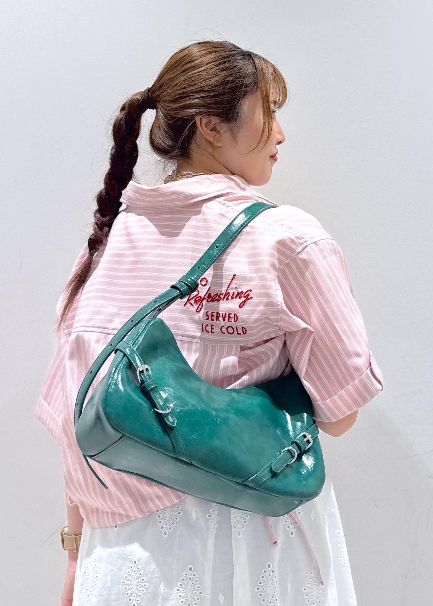アウトレットVISフロントベルトショルダーバッグダークグリーン / F¥2,768レビュー合皮のエナメルのような素材感で見た目はツルッとしています!ベルトのようなデザインがお洒落で私はグリーンの色が可愛くておすすめしています♡待ち手の部分は長さが調節できるので気分によって変えることができます!バッグの容量してはお財布、携帯、タオル、ポーチ、お化粧ポーチ、ミラー、500mlのペットボトルなど荷物がたくさんある方でも使いやすいと思います。