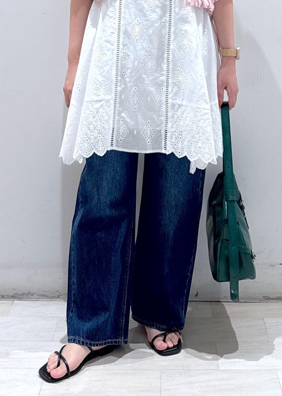 ハイウエストなので高めに着ていただき、足長効果抜群◎少し太めの形ですが、ストレートに落ちていくので骨格ストレートが得意なデニムです。