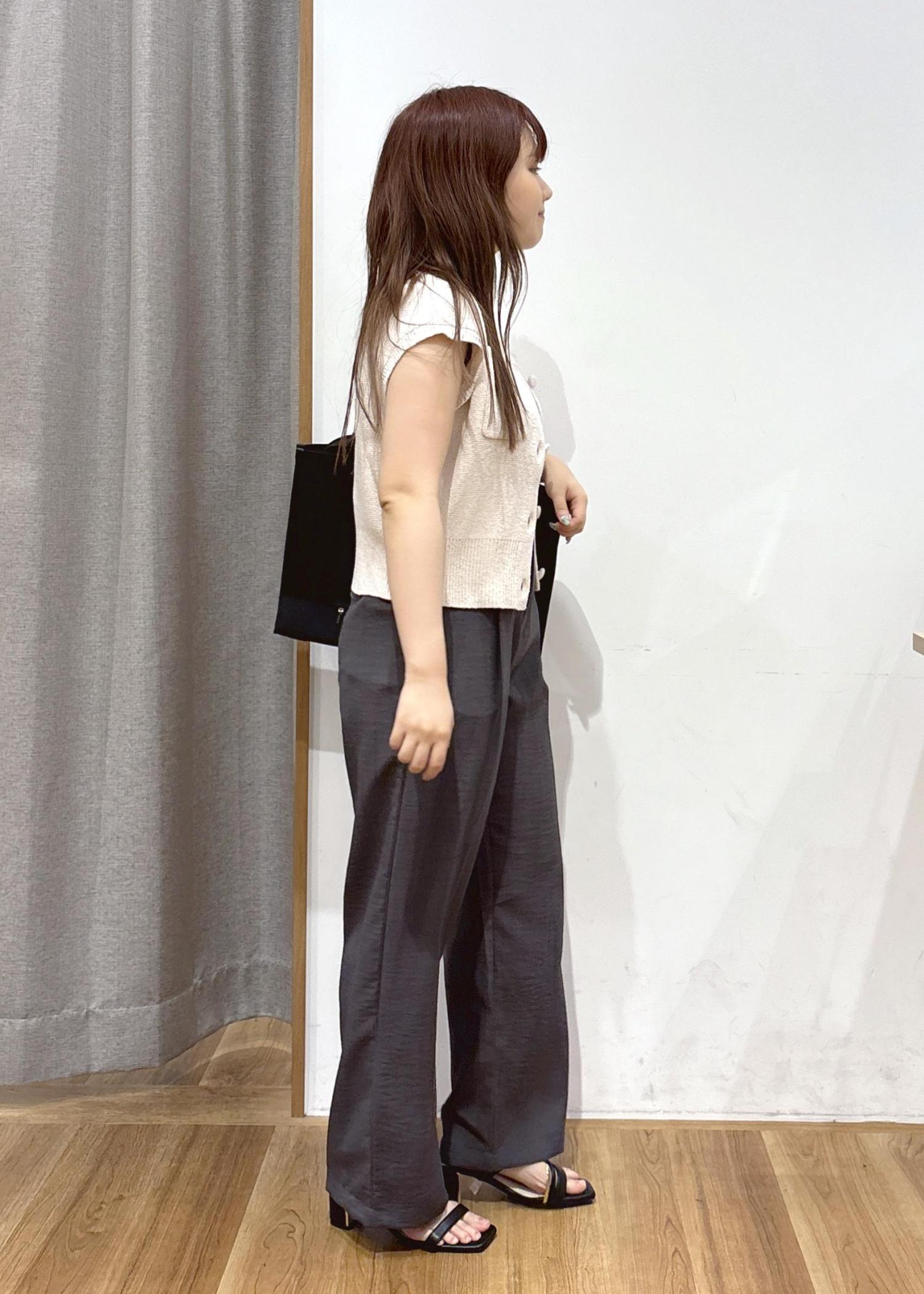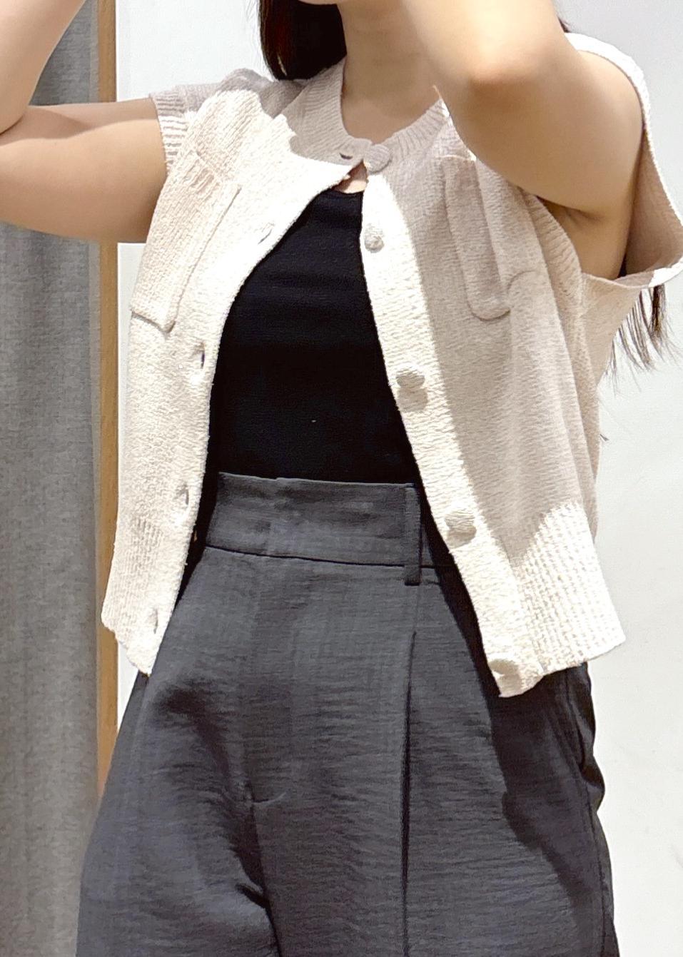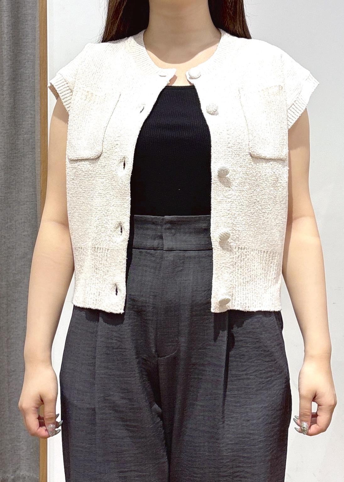 もっちりとした素材感のかわいいノースリーブニットカーディガンをメインで組んだコーディネートです。