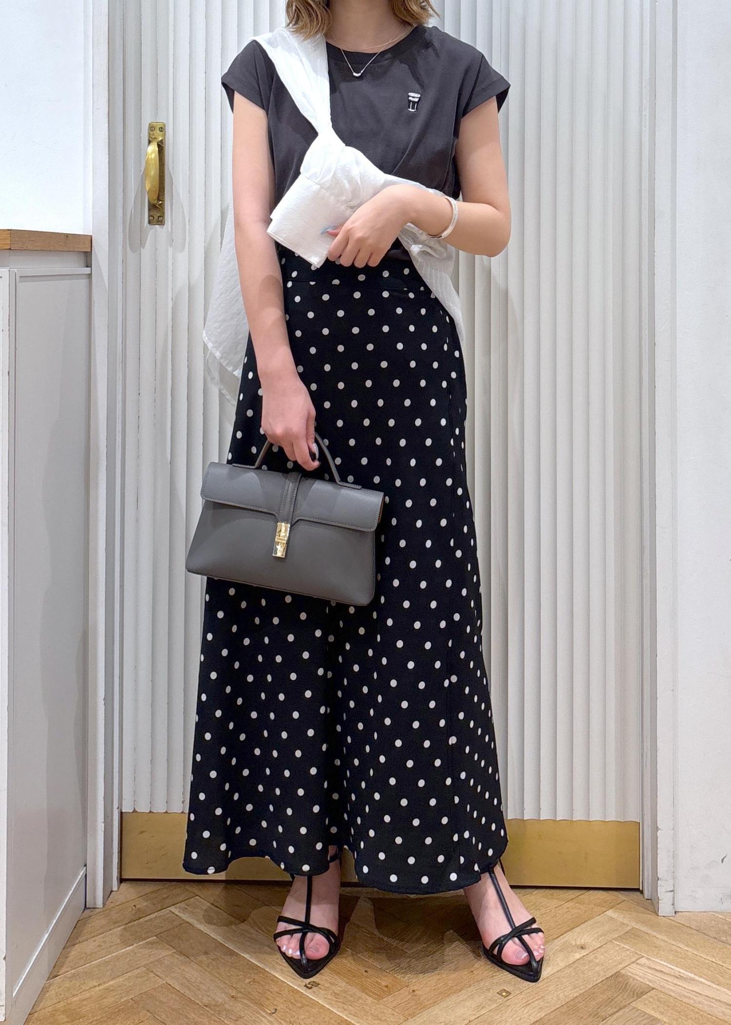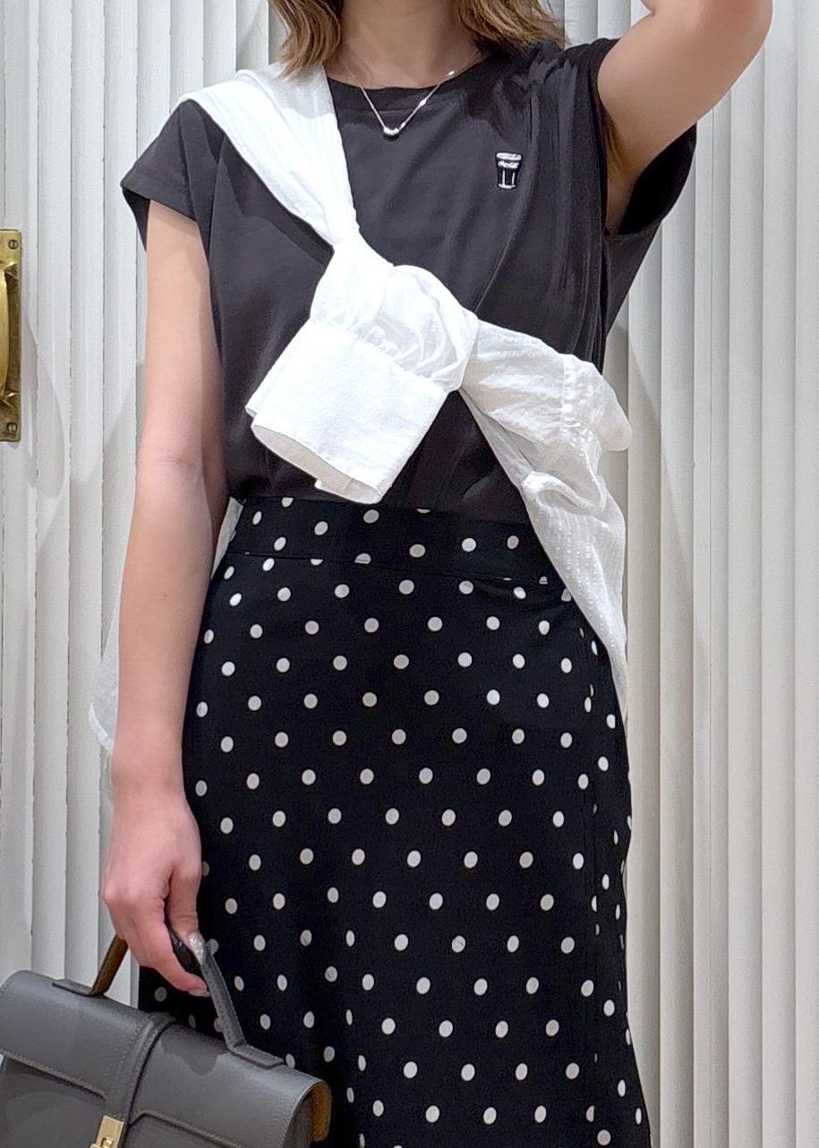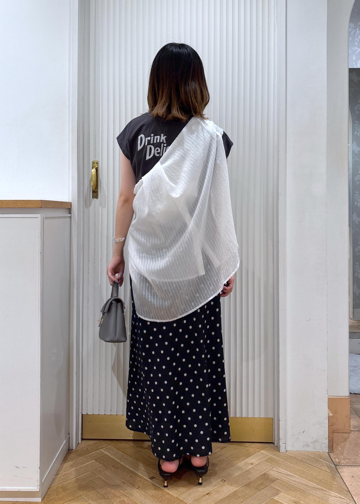 Tシャツとスカートだけでは全体が重くシンプルになってしまいますが、白のブラウスをたすき掛けするだけでこなれ感がアップし、明るさ華やかさも出ます!