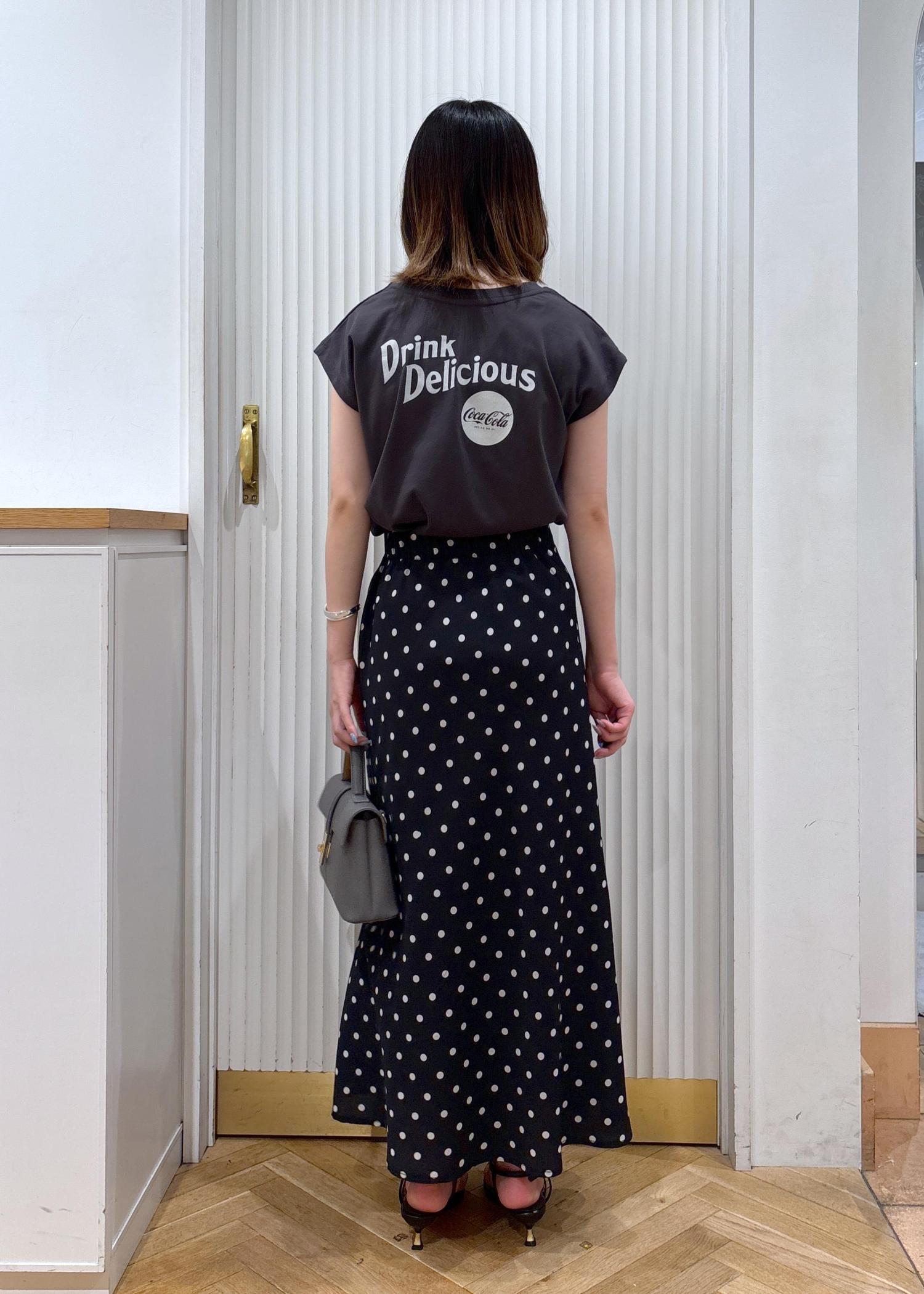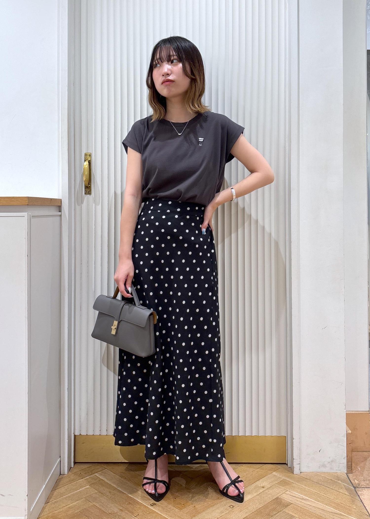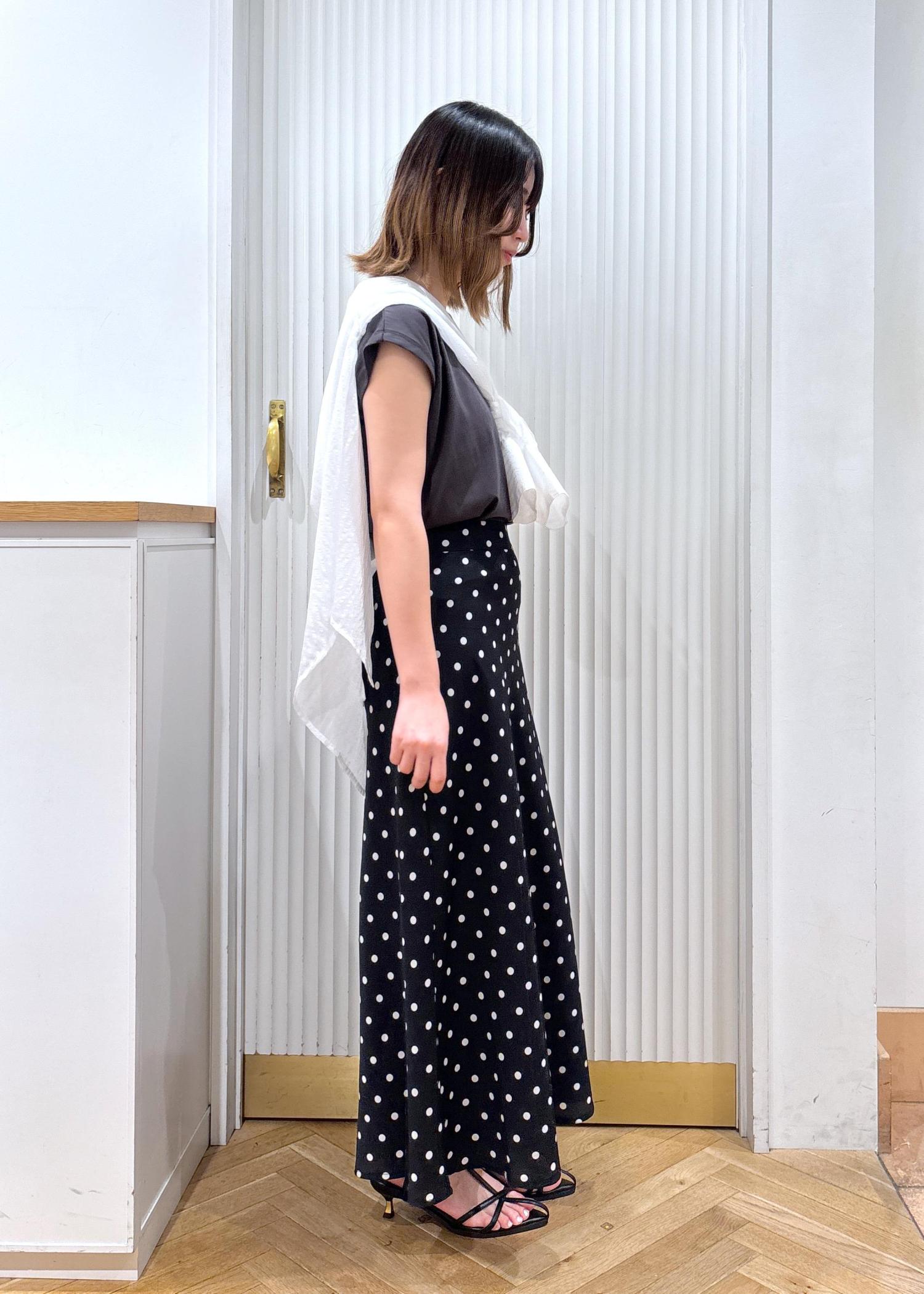 Tシャツとスカートだけでは全体が重くシンプルになってしまいますが、白のブラウスをたすき掛けするだけでこなれ感がアップし、明るさ華やかさも出ます!