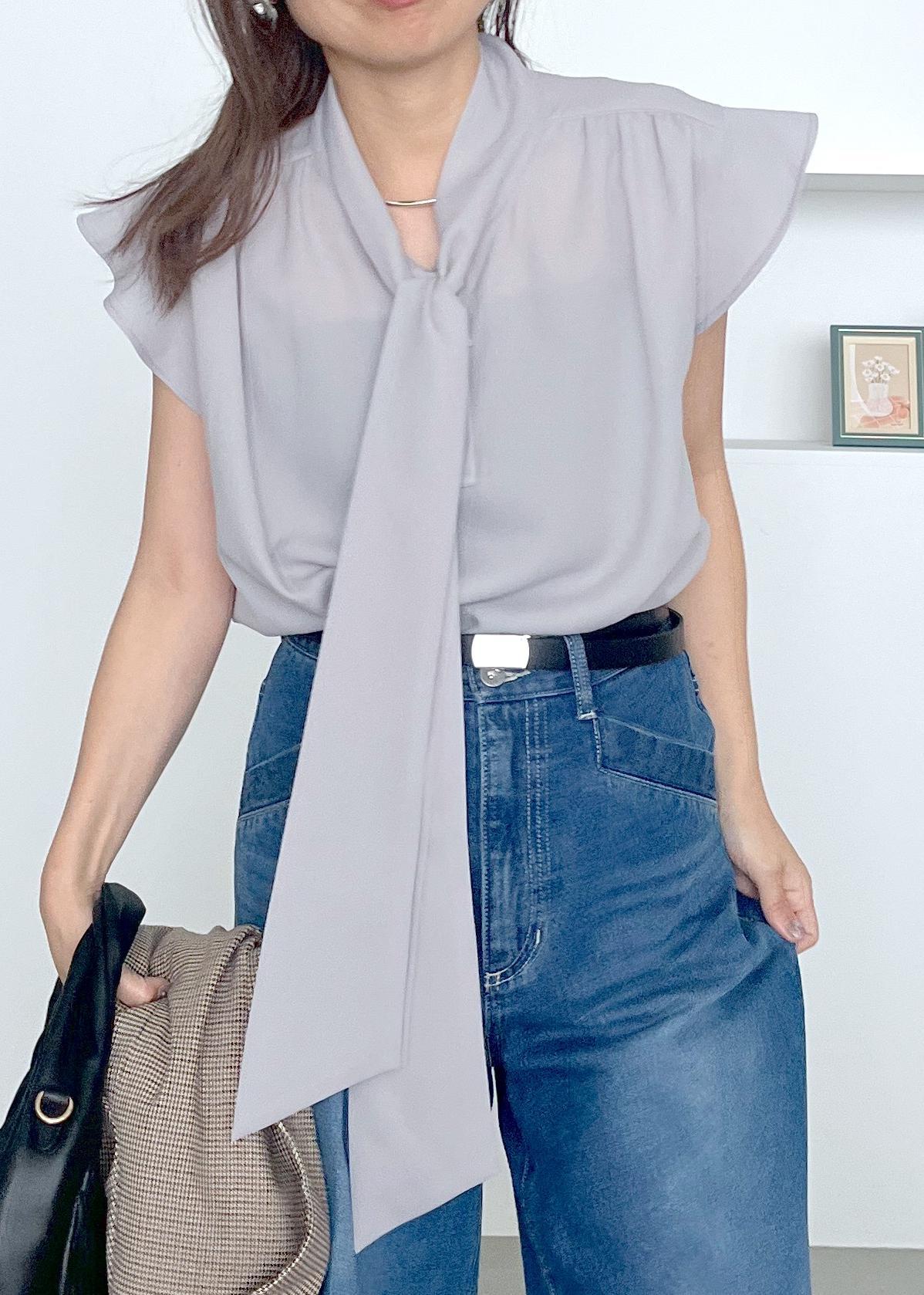 フレンチ袖のボウタイブラウスは、涼しげで上品な印象。