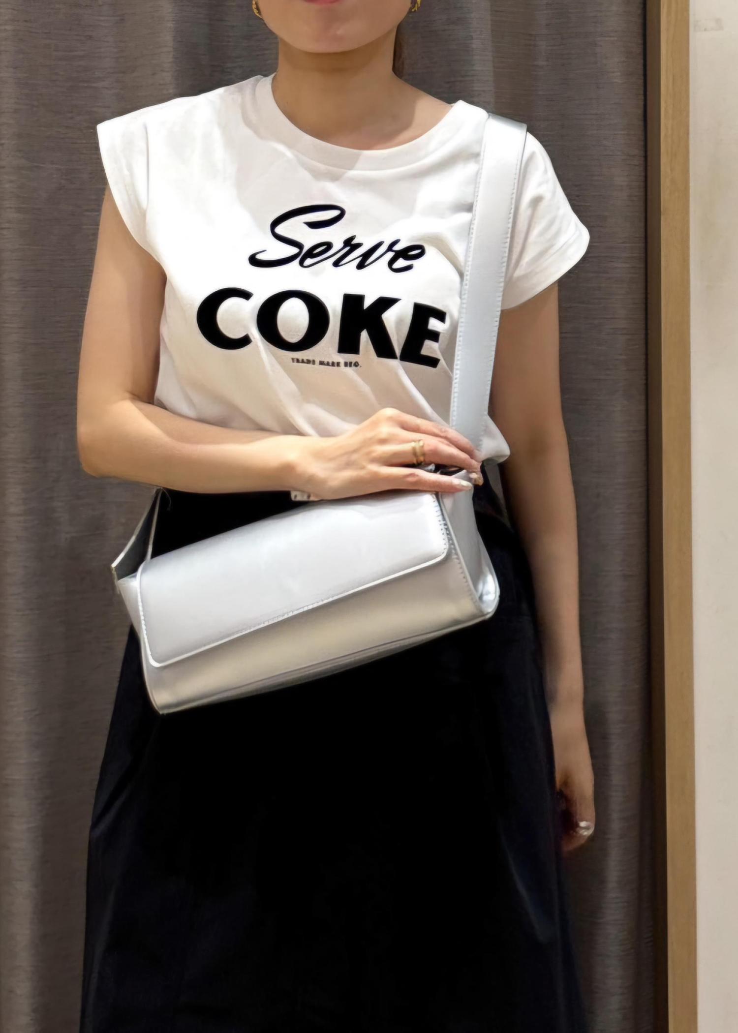 VIS【Coca-Cola】VIS別注ロゴプリントフレンチTシャツホワイト / F¥3,850レビュー身長154cmでFサイズ着用。