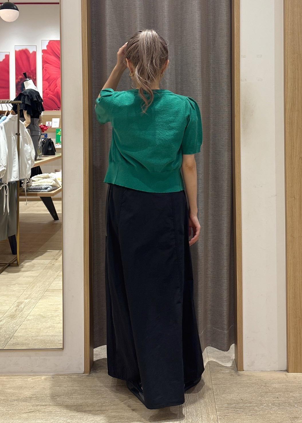 アクセントになるボタンとパフスリーブが女性らしさを引き立て、上品で優しい印象に。