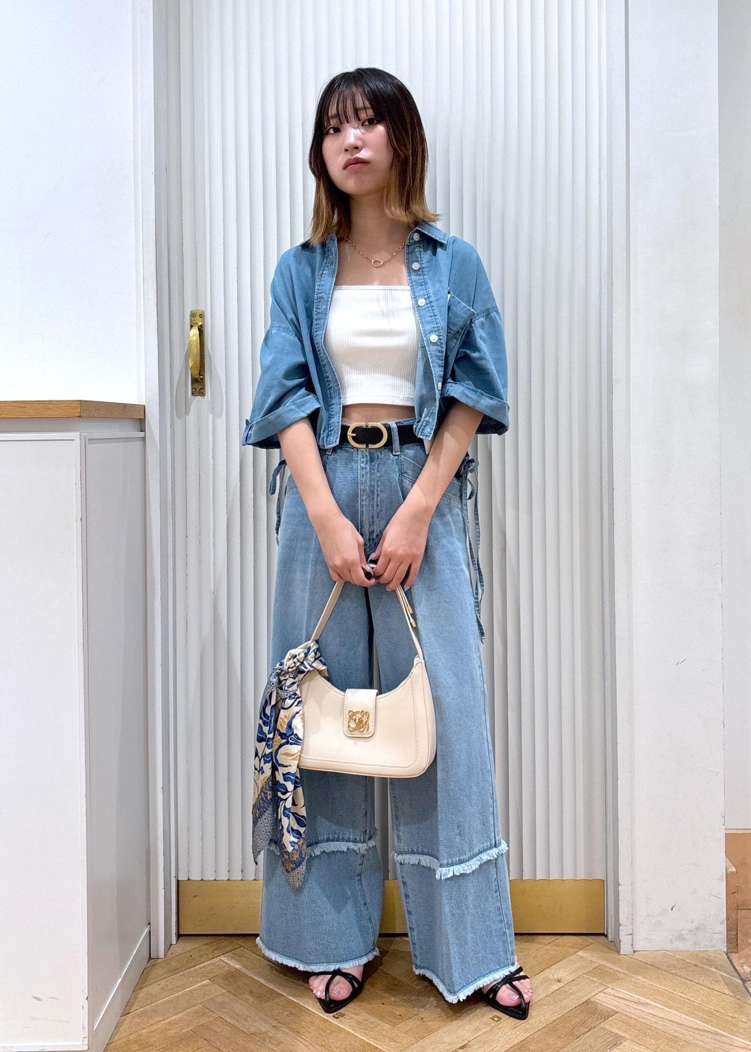 上下デニムを合わせるちょっと上級者向けコーディネートです!合わせ方によっては地味になったりしてしまいますが、ベルトをつけることで上下の境目がしっかり見え、コーディネートが締まります!また白をインナーにすることで顔周りが明るく見え夏らしさアップします!