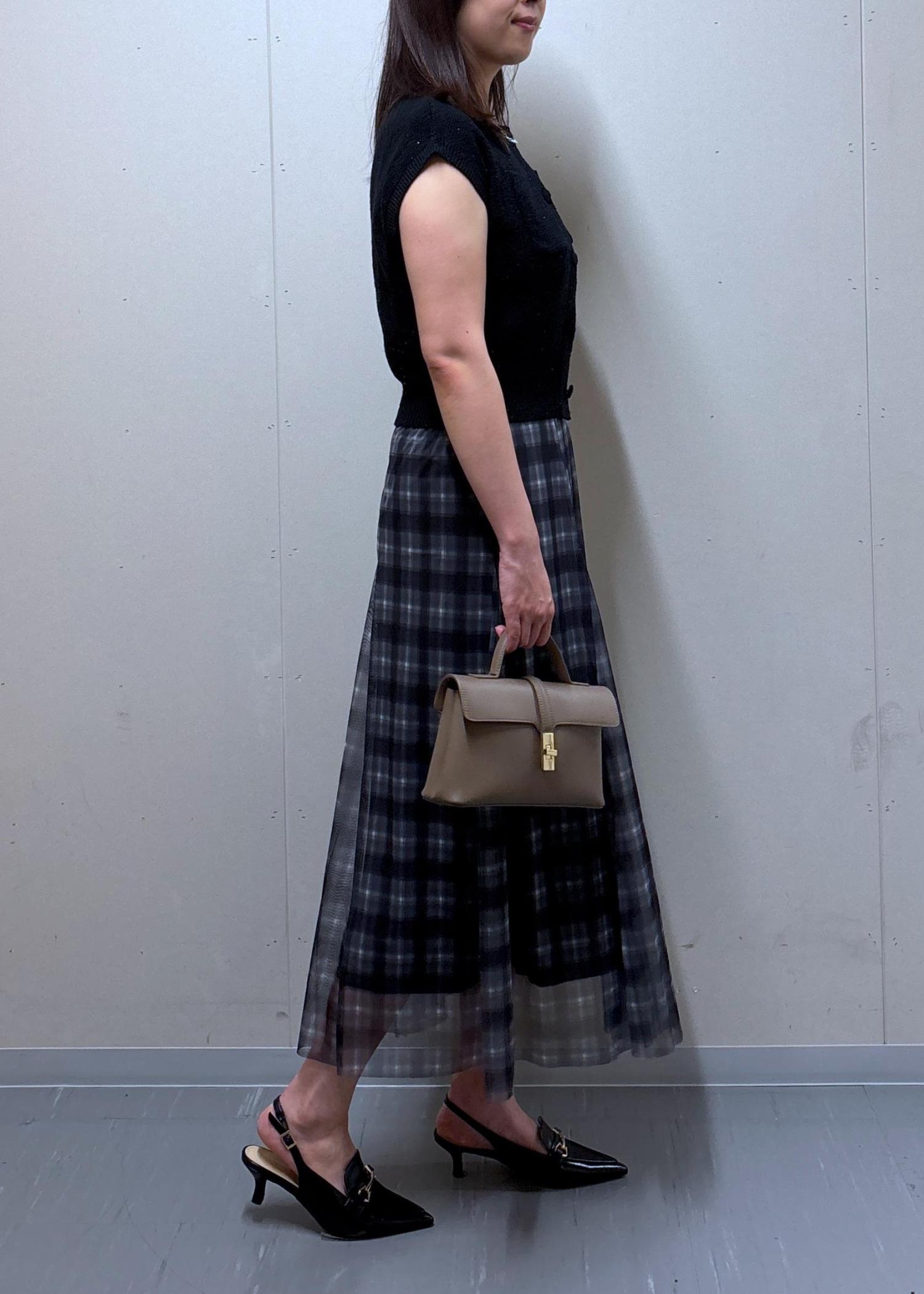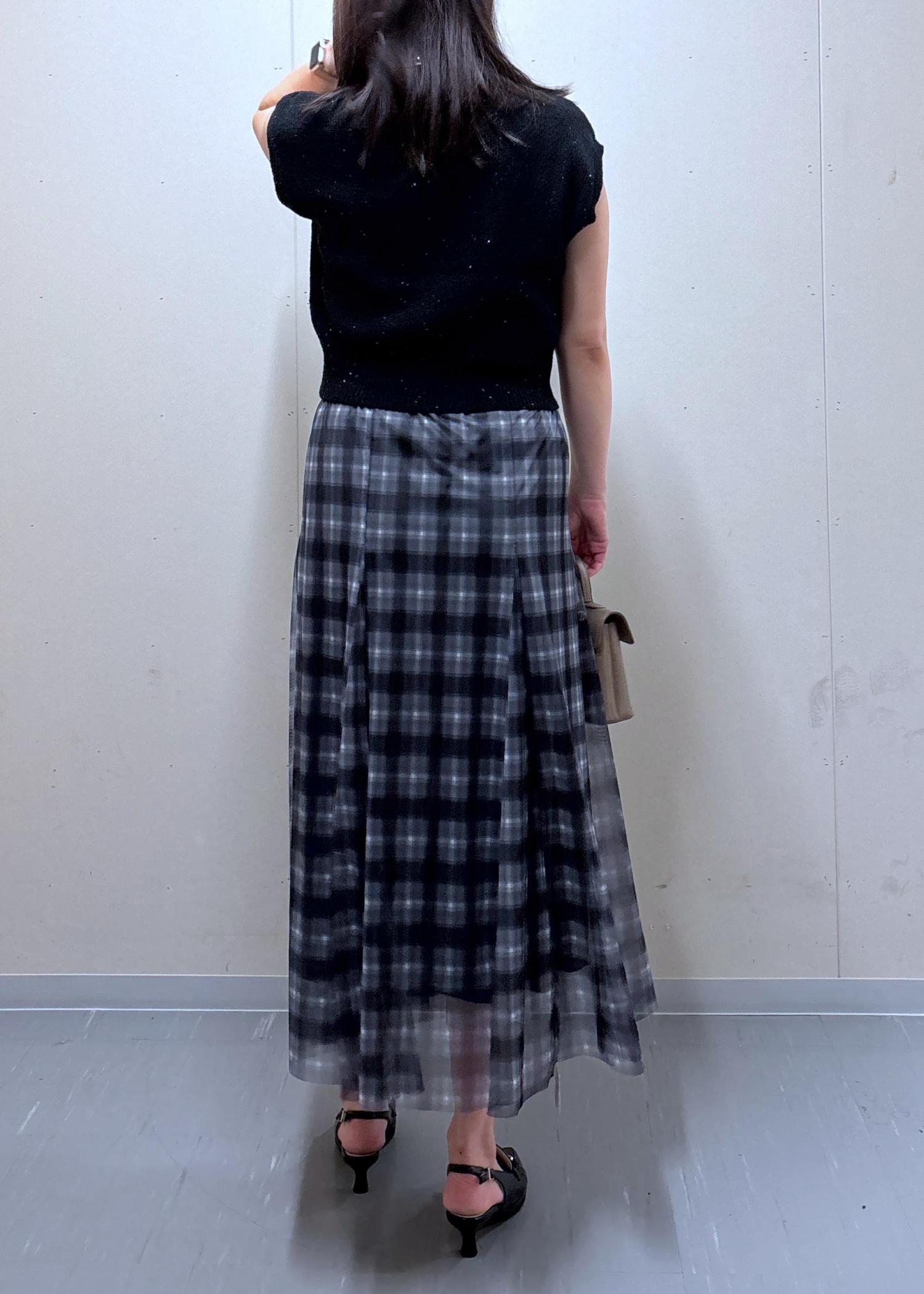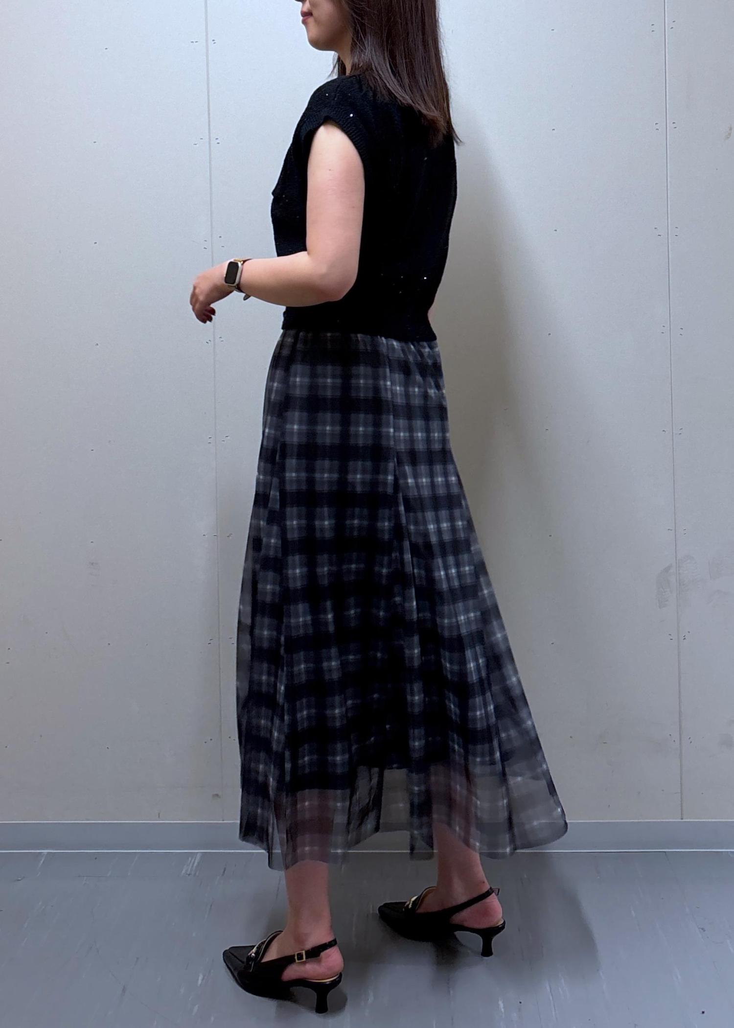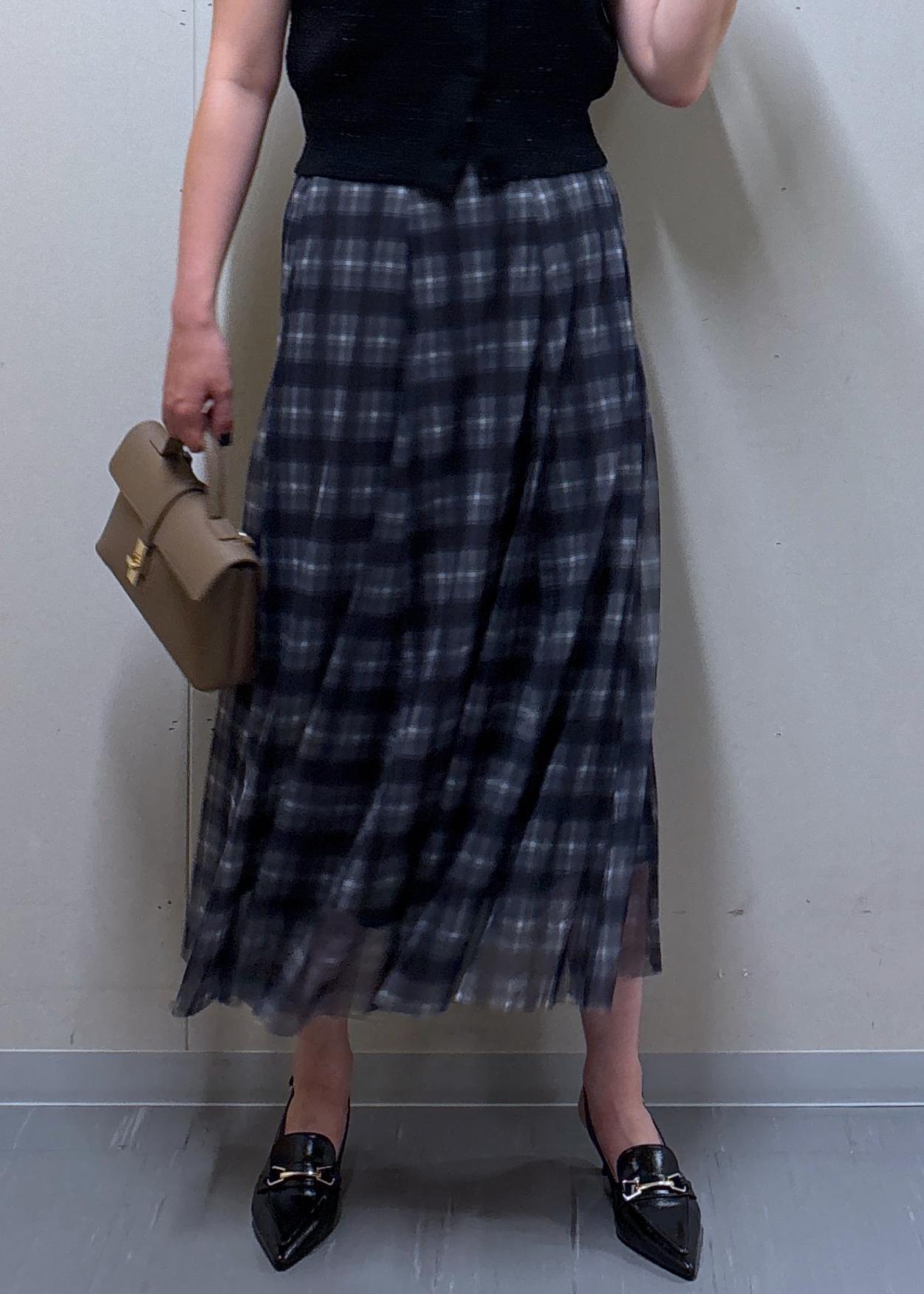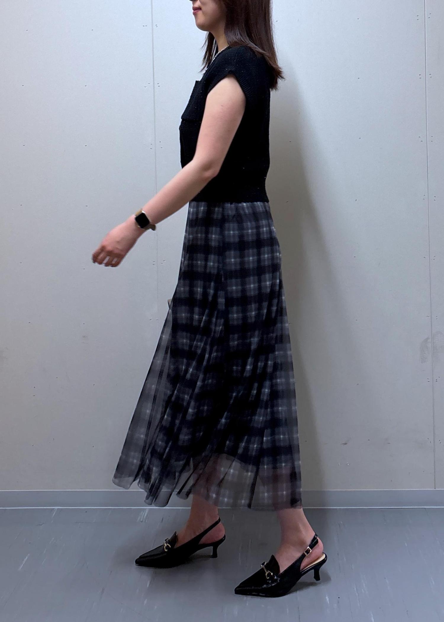 VIS【洗える】チュールプリントチェックスカートブラック系 / F¥4,612レビューウエストのゴムがかなり伸縮性あるので履き脱ぎしやすいです。シルエットもピッタリしすぎないのが◯