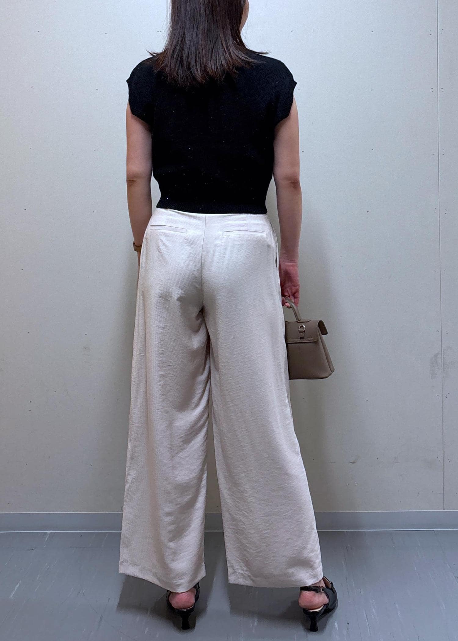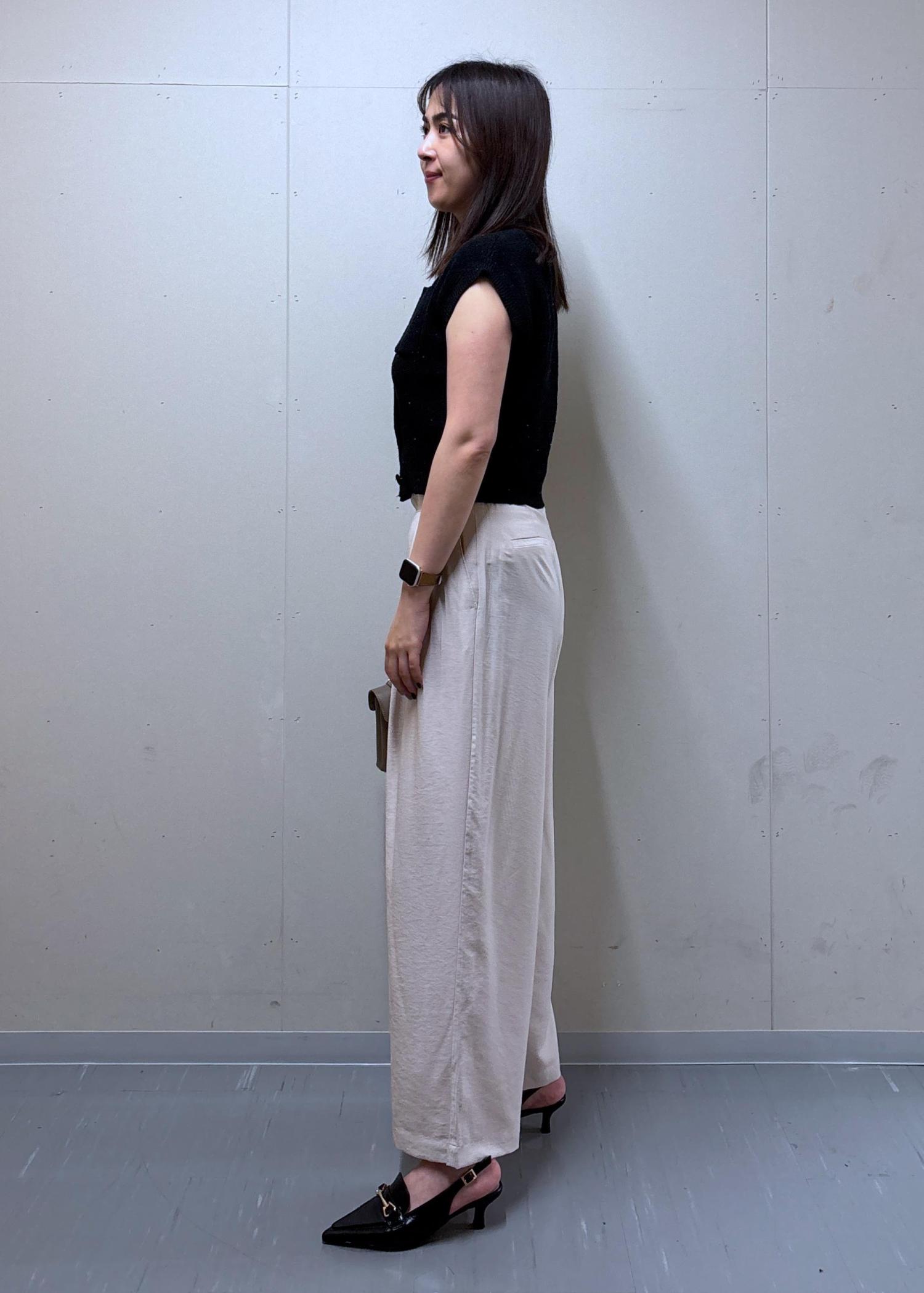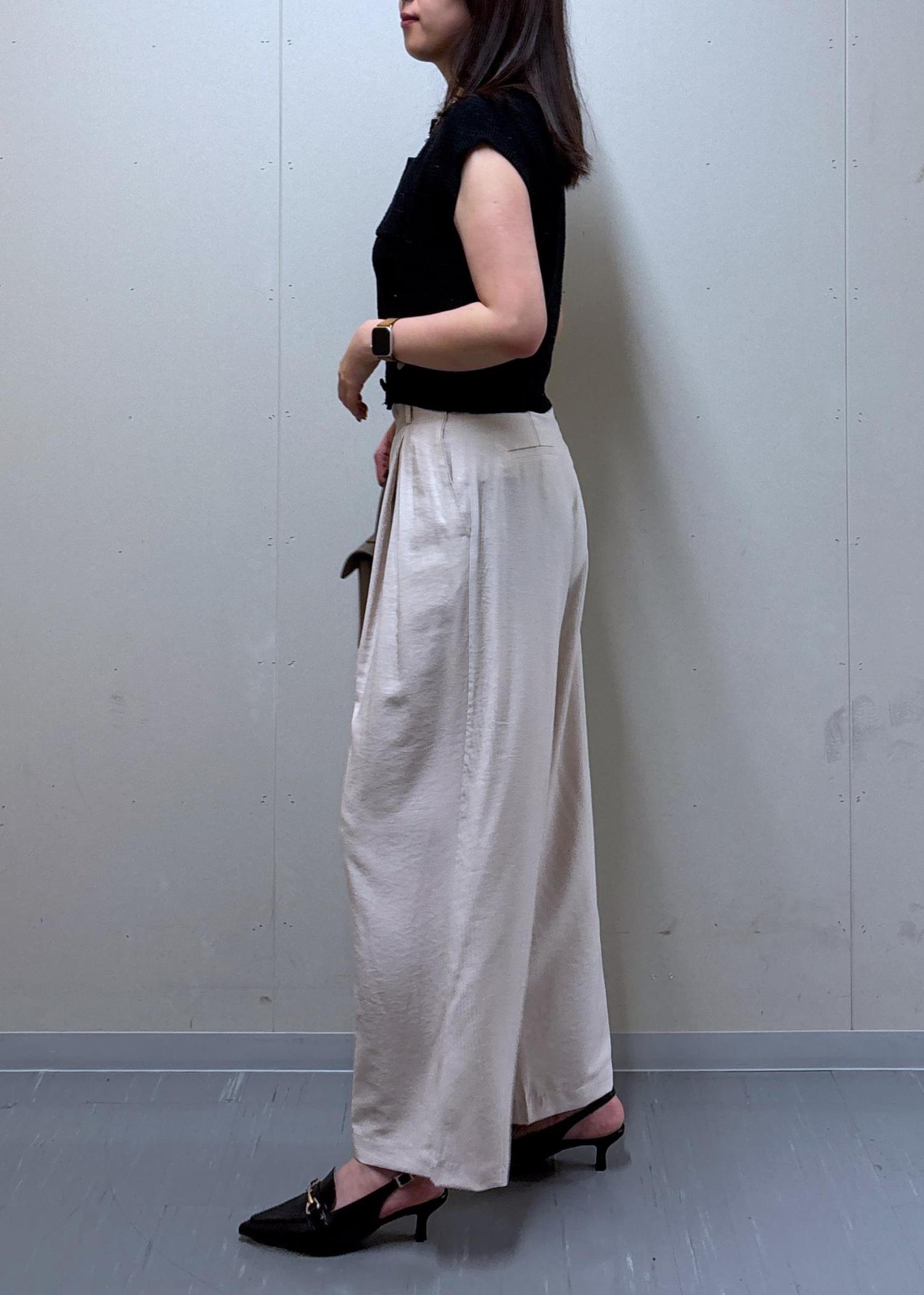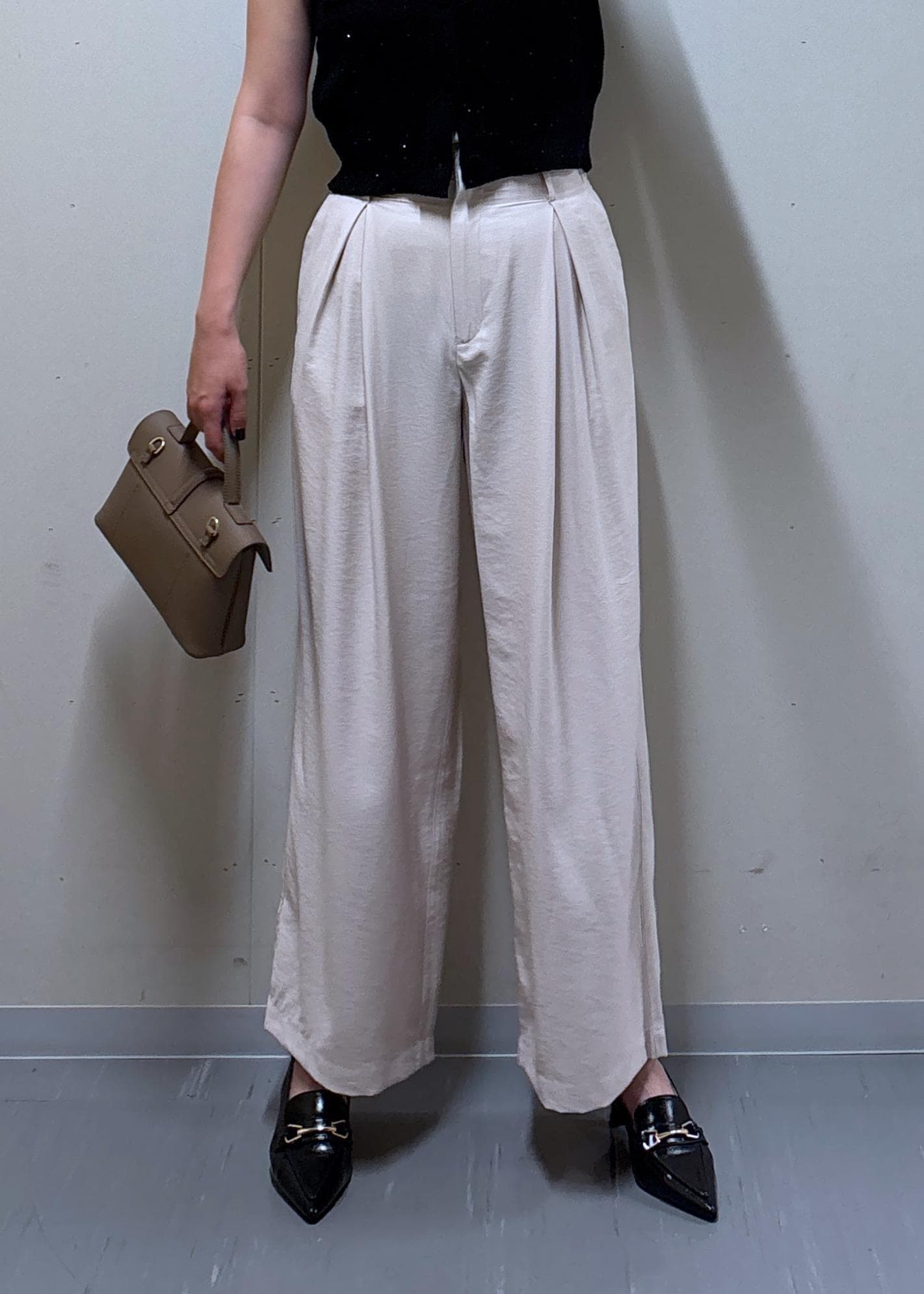 アウトレットVISボックスタックリラックスパンツベージュ / F¥2,965レビューくたっとかんのある生地です。柔らかいので動きやすく、通気性良いです。タックがしっかりあるので、短い丈のトップスと合わせるのがオススメ。着丈はくるぶしくらいでした。