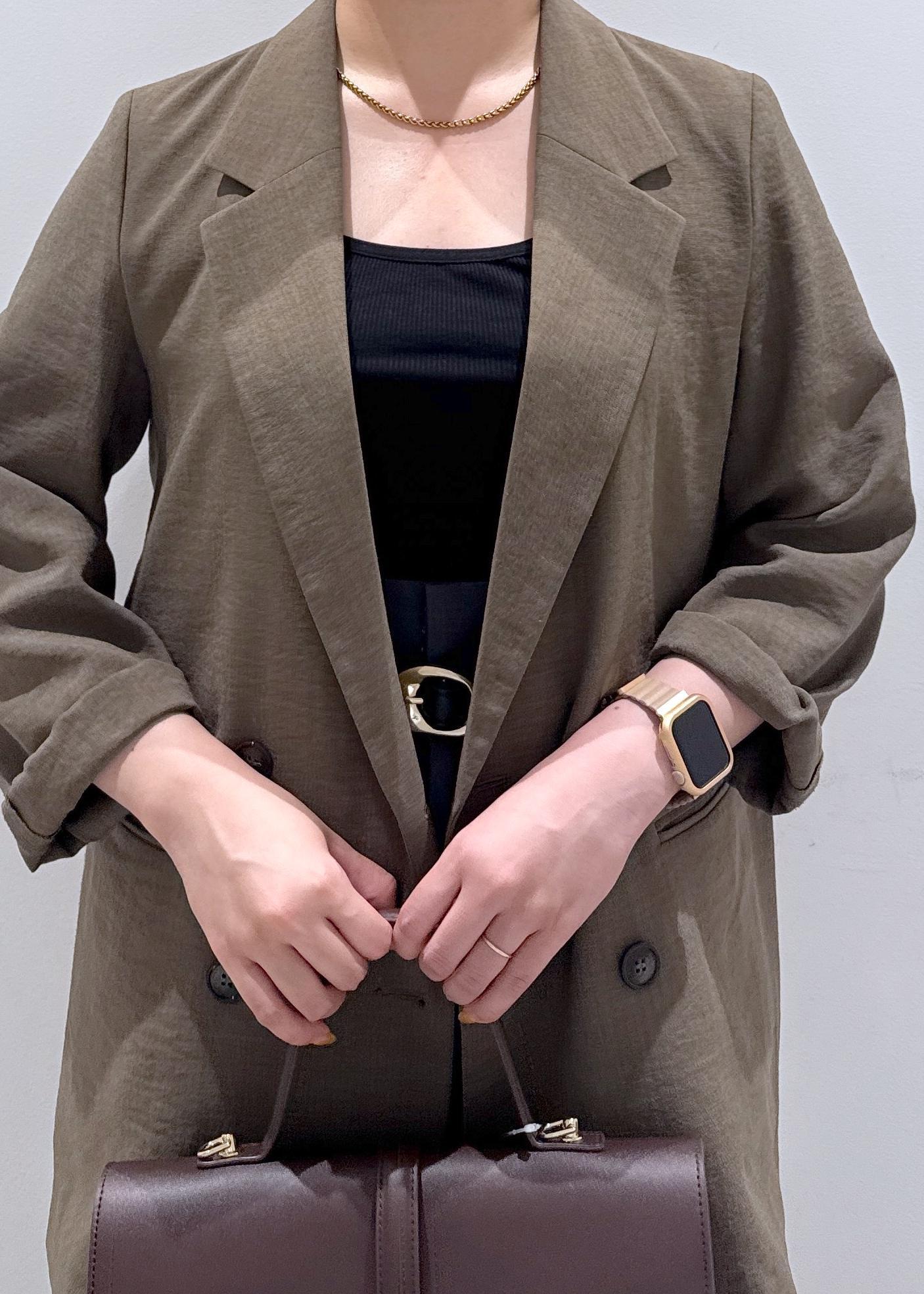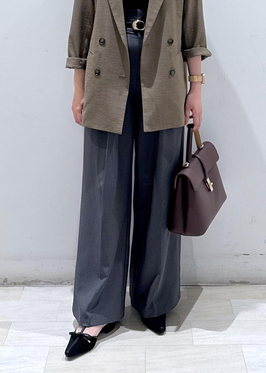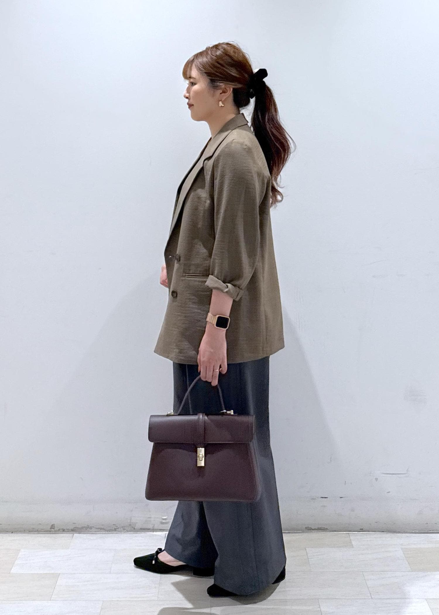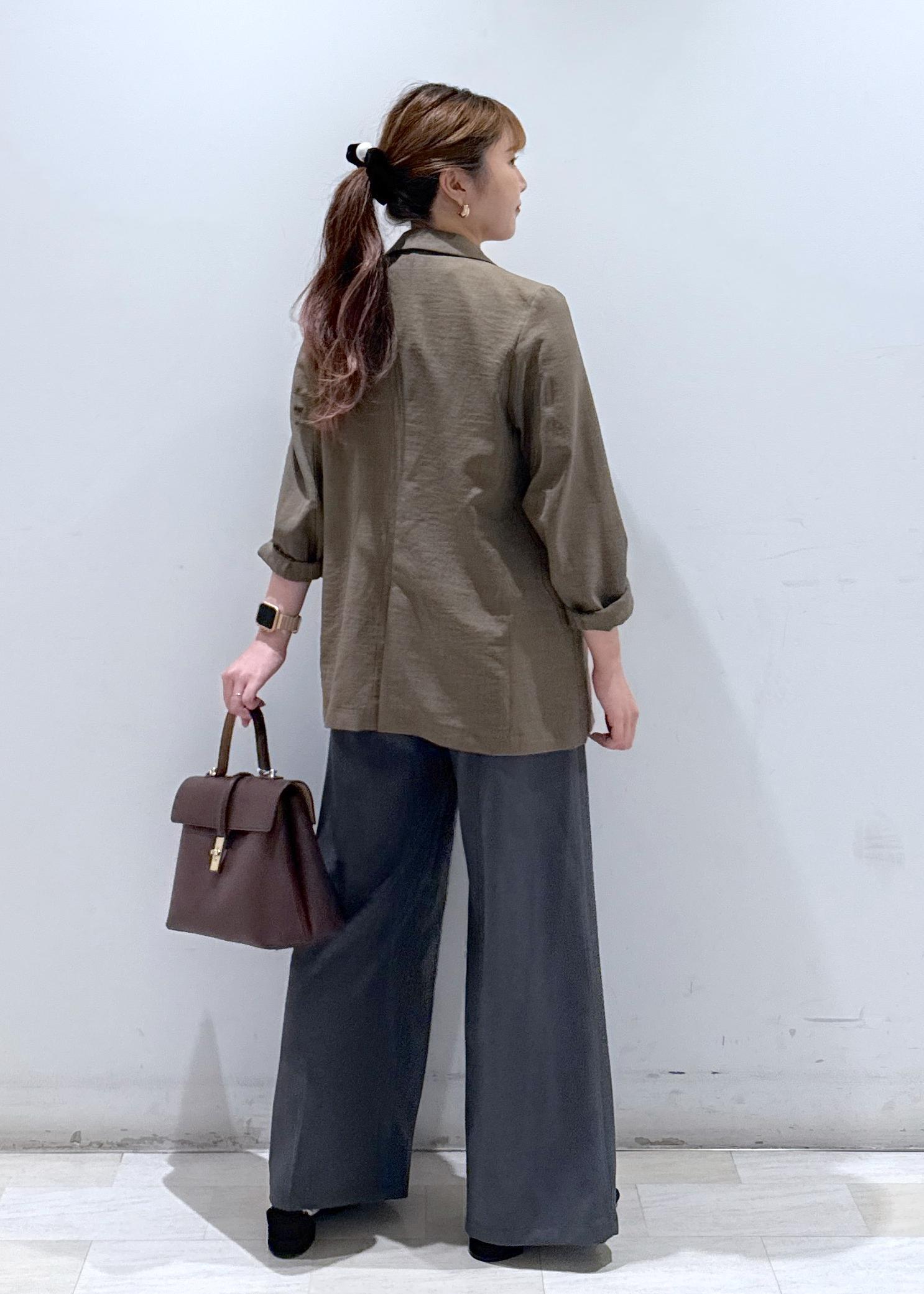 カーキの美easyジャケットにアイラインワイドパンツと合わせて、お仕事でも使える綺麗めなスタイリングに。