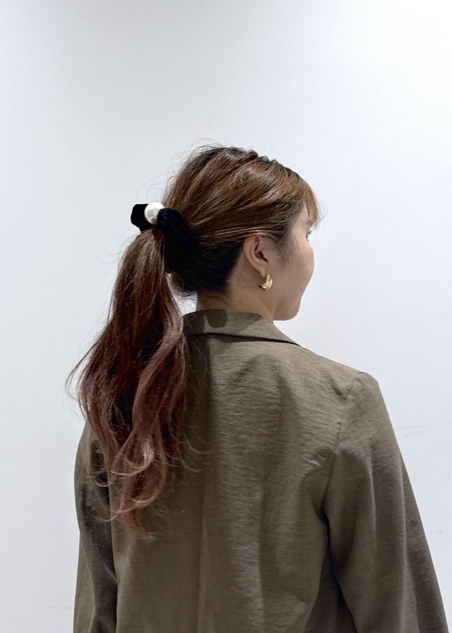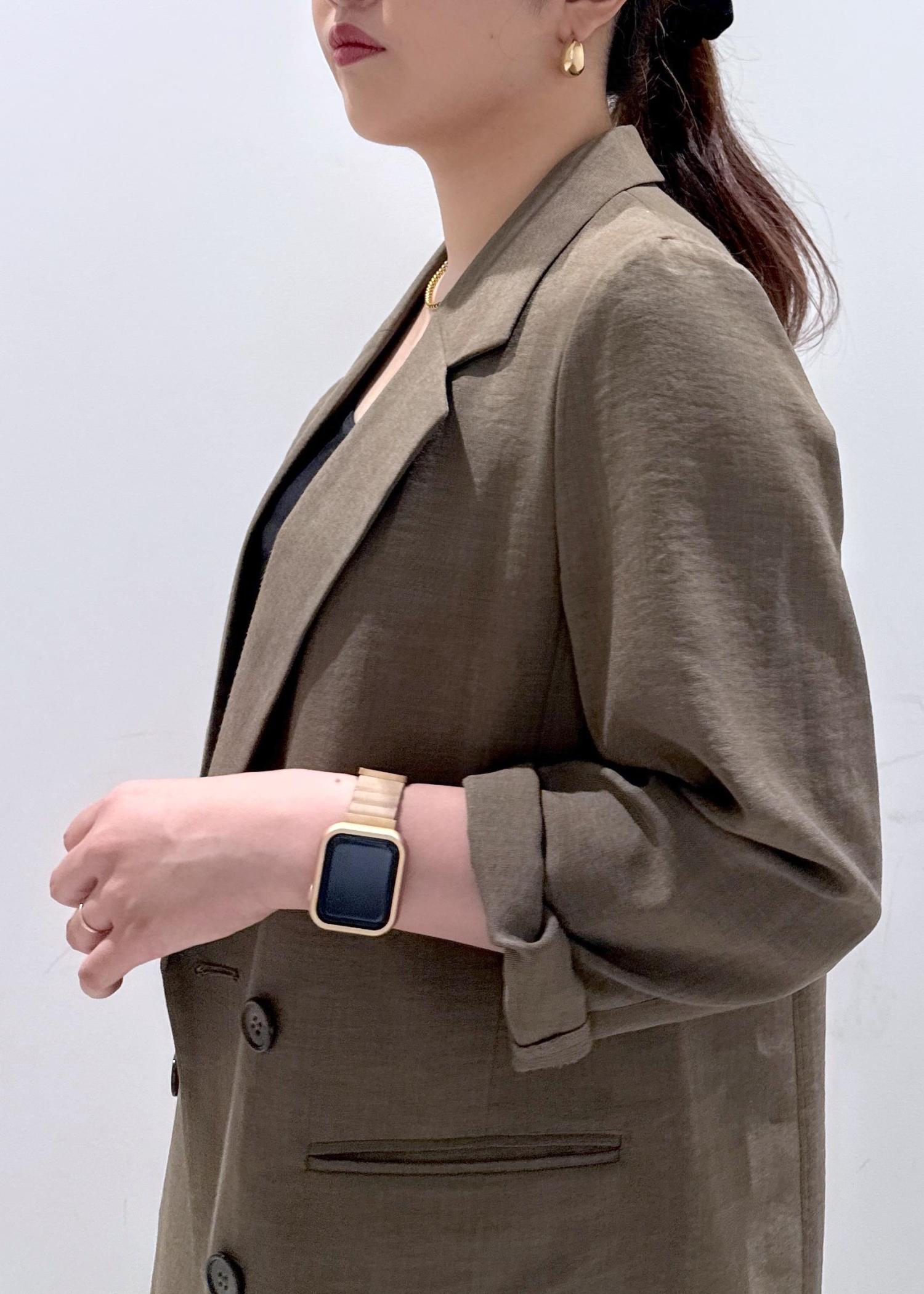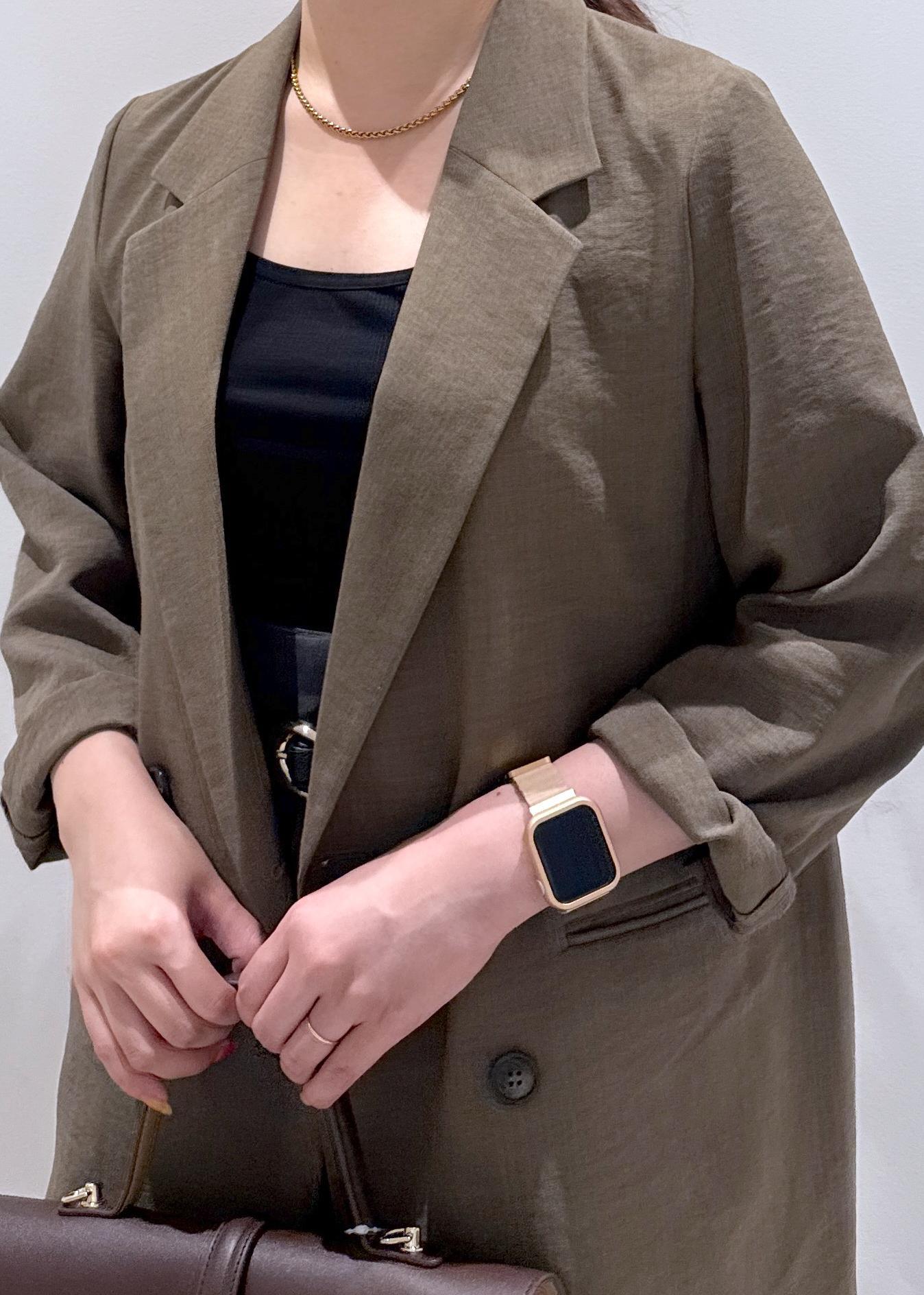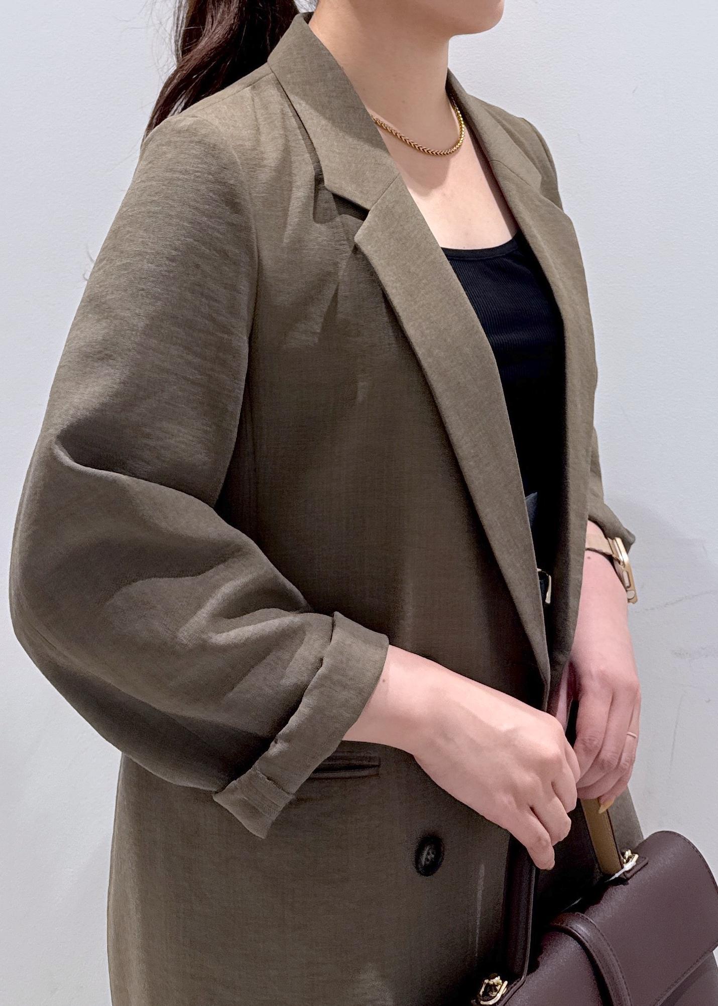 カーキの美easyジャケットにアイラインワイドパンツと合わせて、お仕事でも使える綺麗めなスタイリングに。