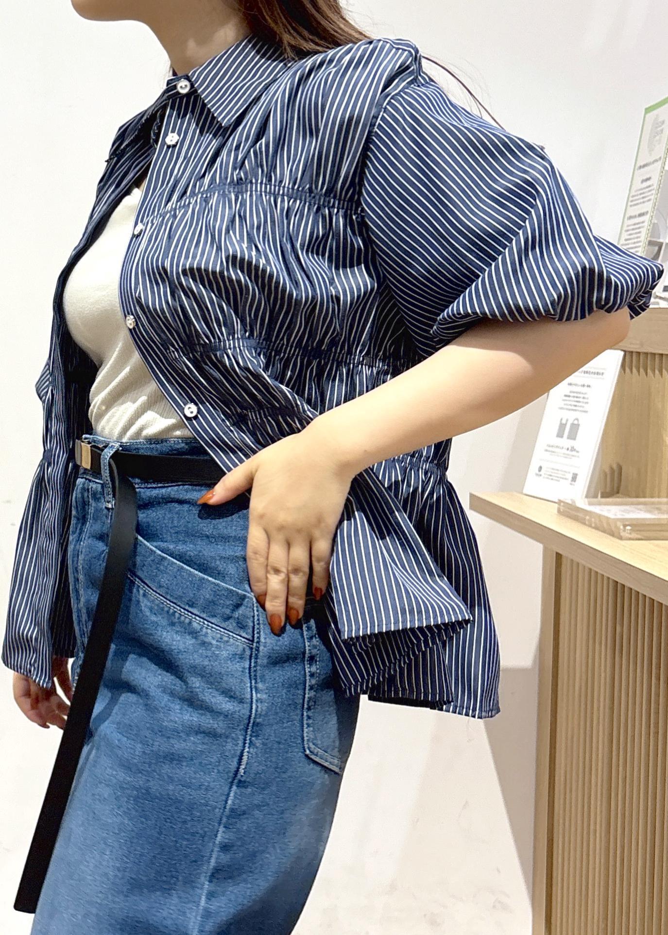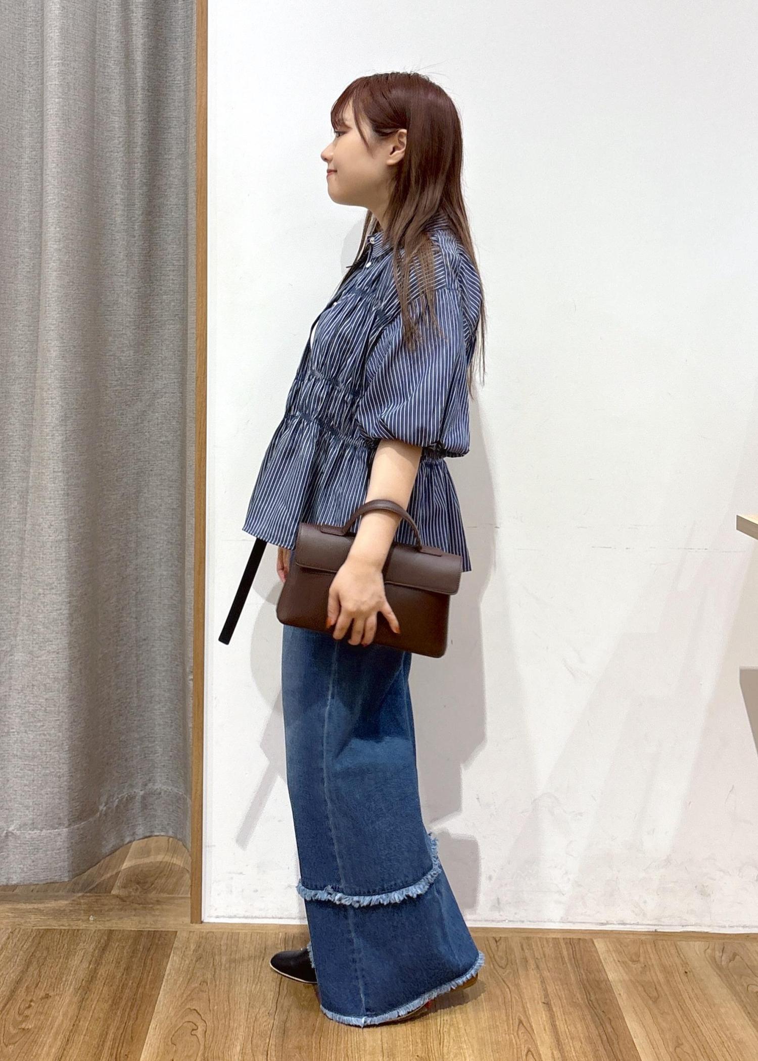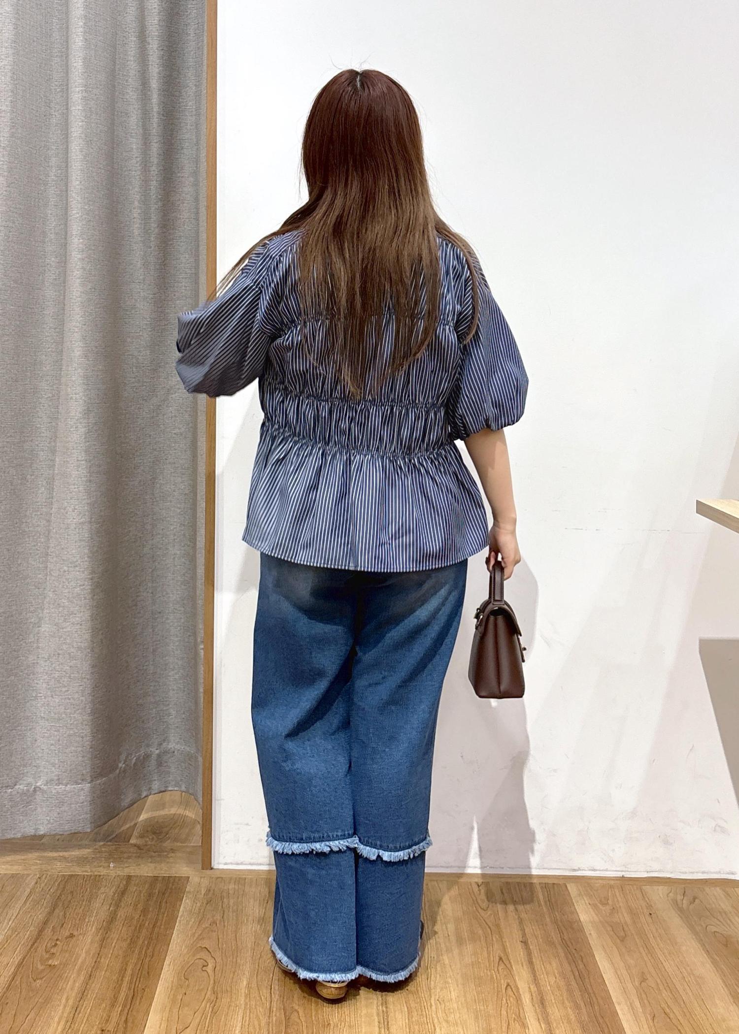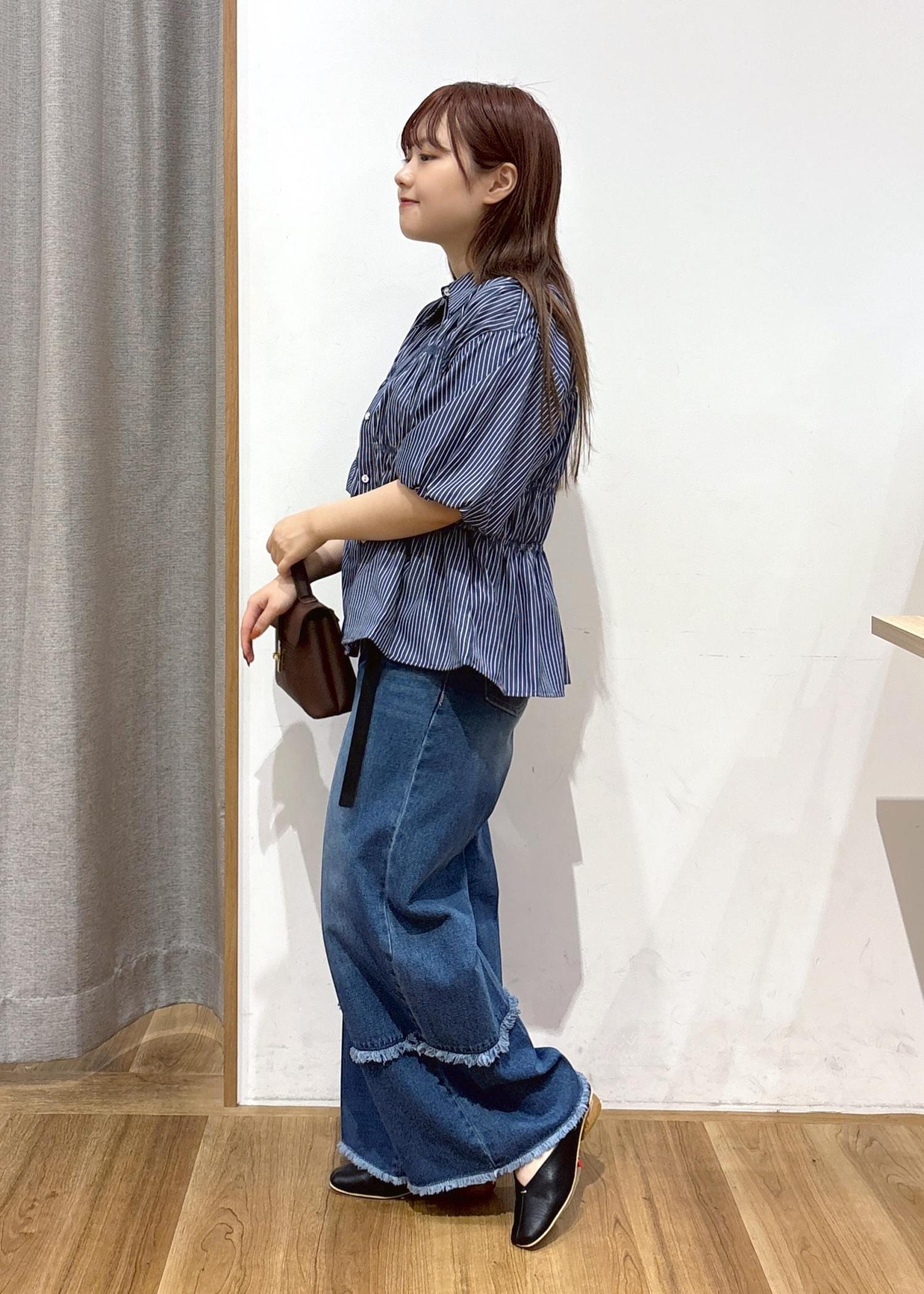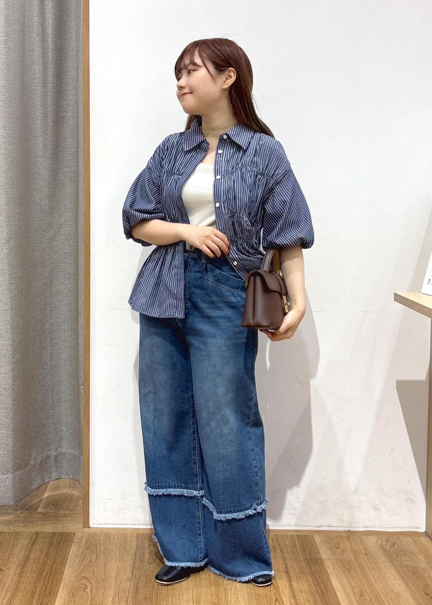 まだまだ暑い秋手前から秋の入口まで長く使える、シャーリングシャツ×フリンジデニムのコーディネートです。