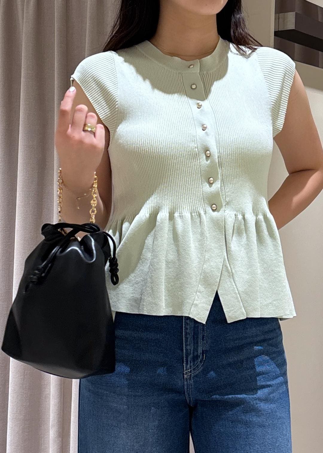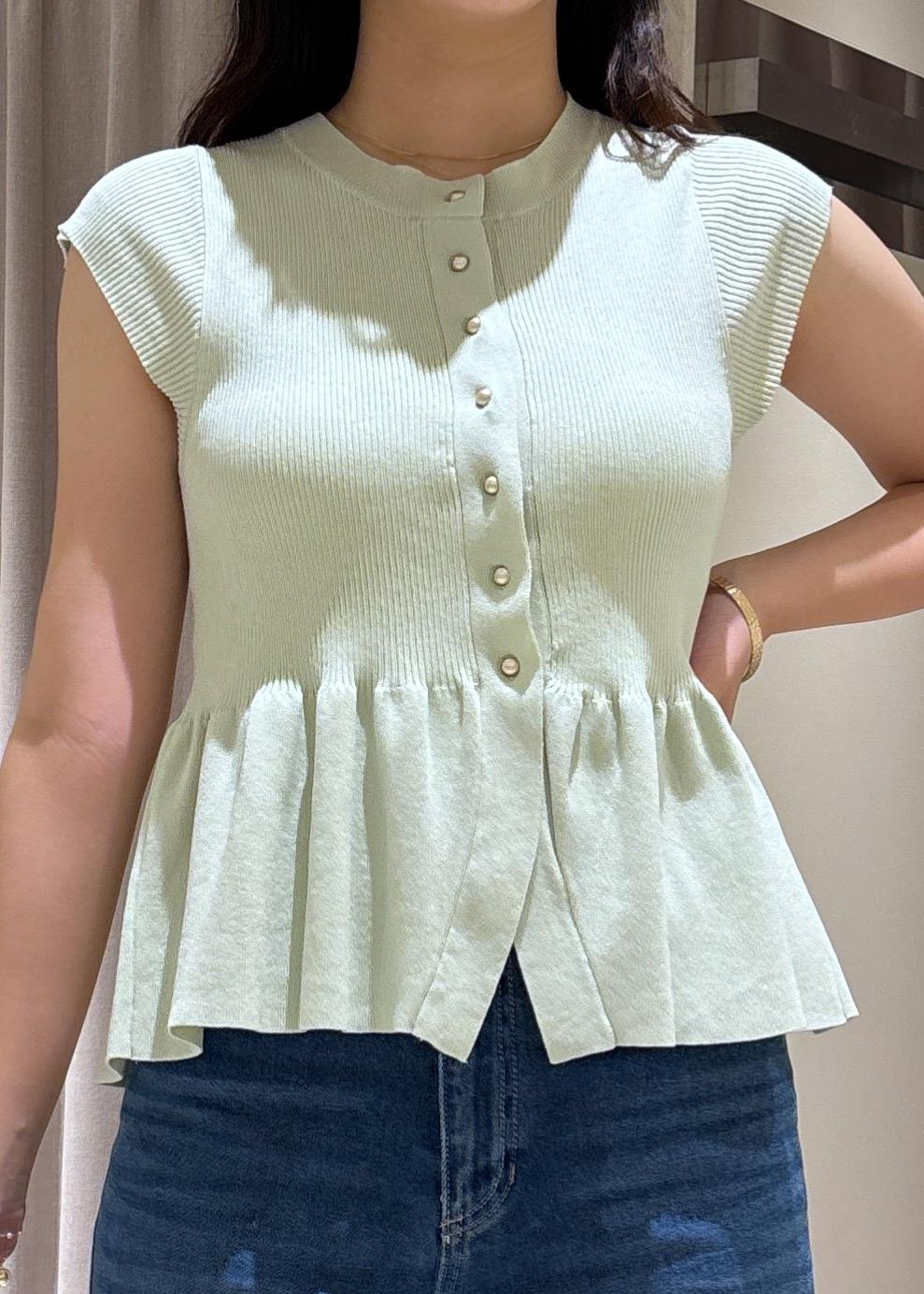 VIS【アンチピリング/洗える】美SMARTショートスリーブペプラムニットライトグリーン / F¥5,489レビュー165cmで腰が隠れるくらいの丈感です!