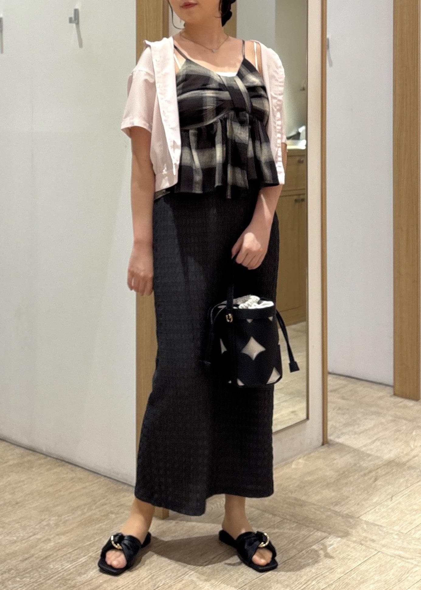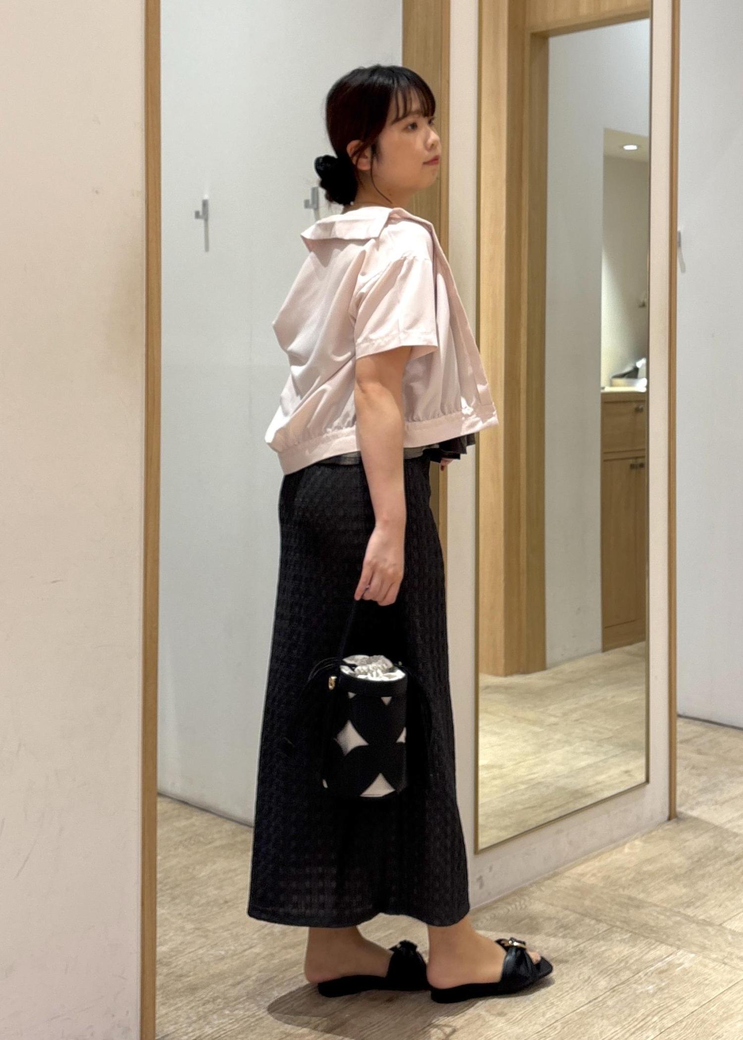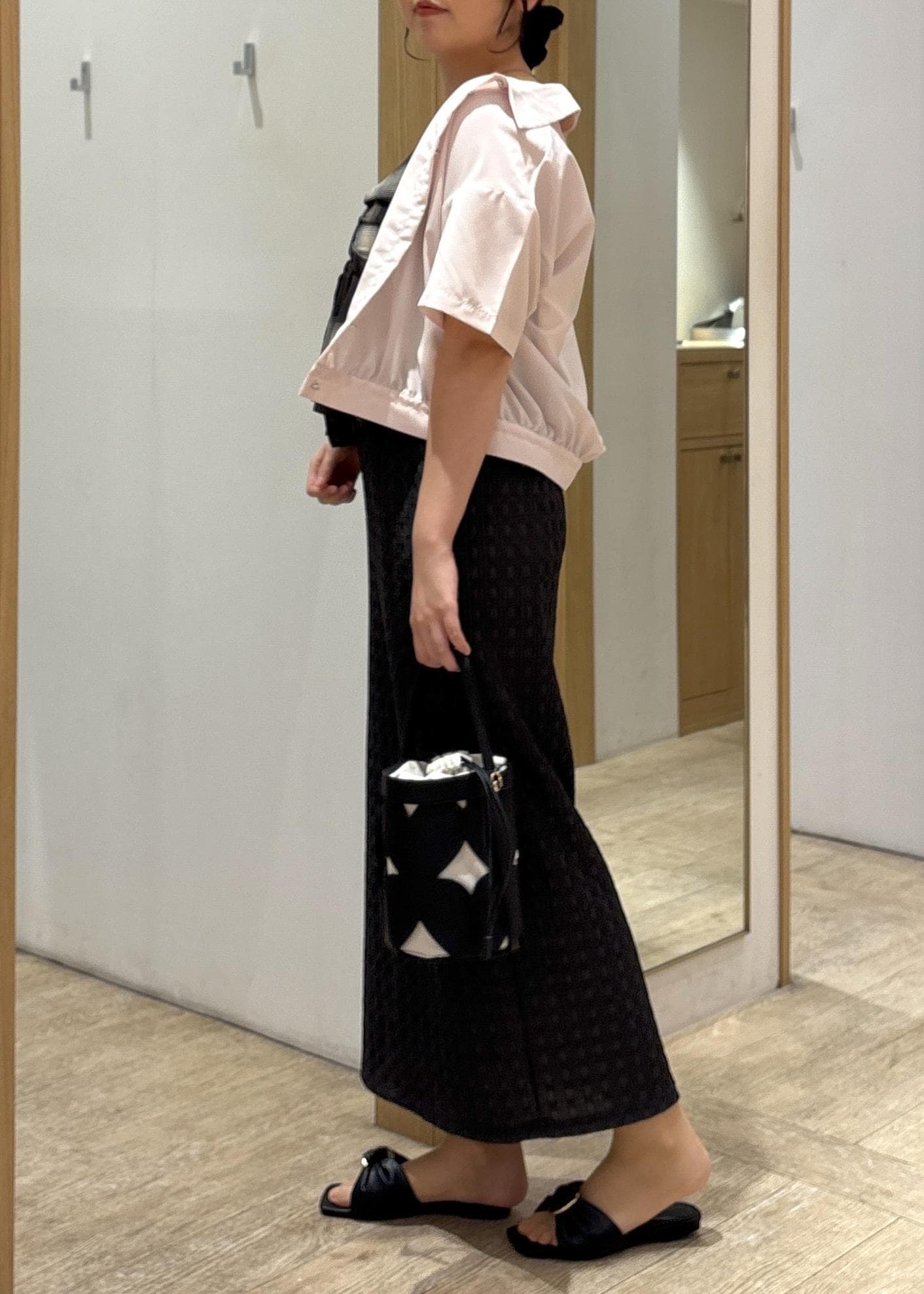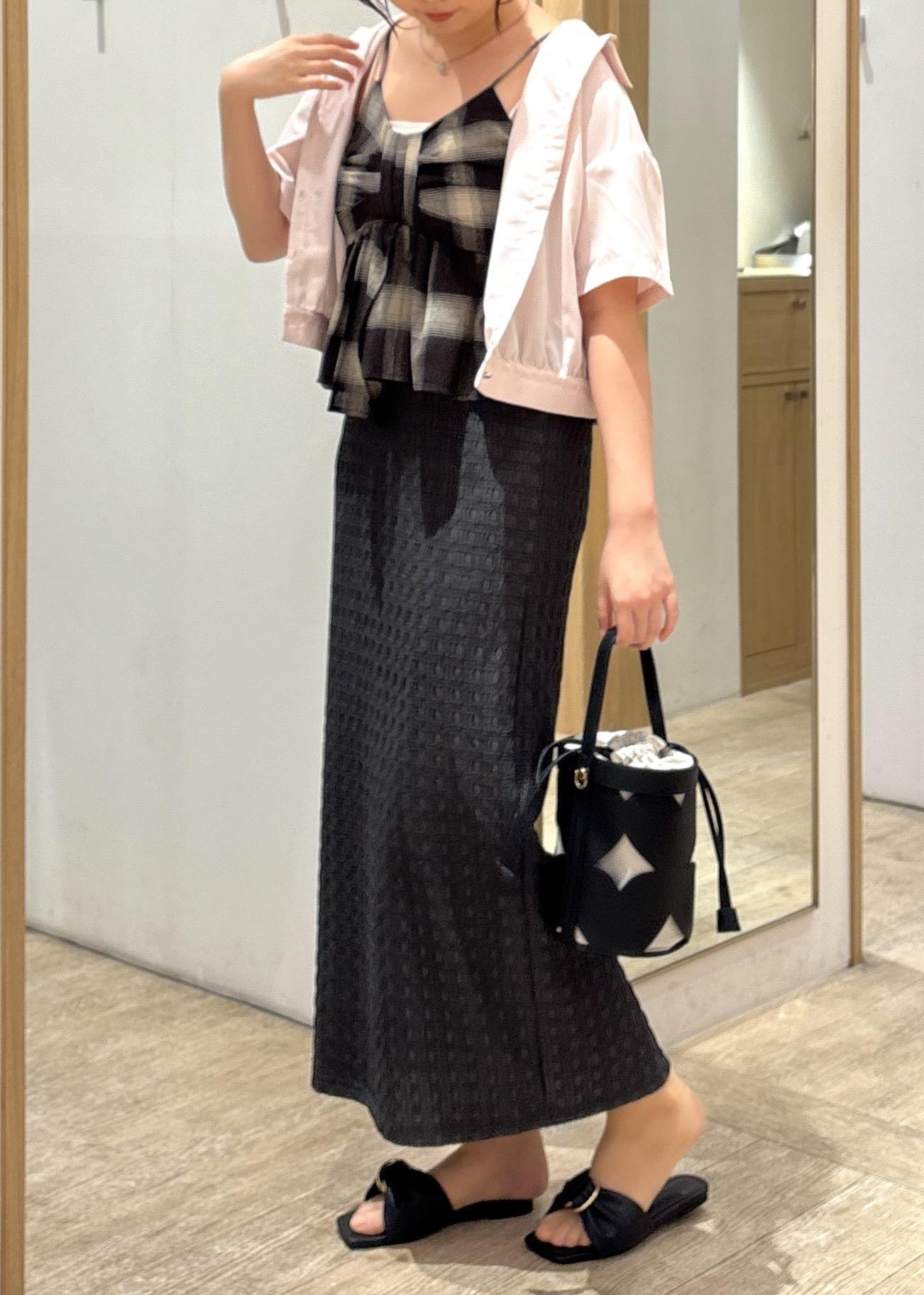 小物も黒で揃え、柄やリボンの甘さを上品にまとめた着こなしです♪