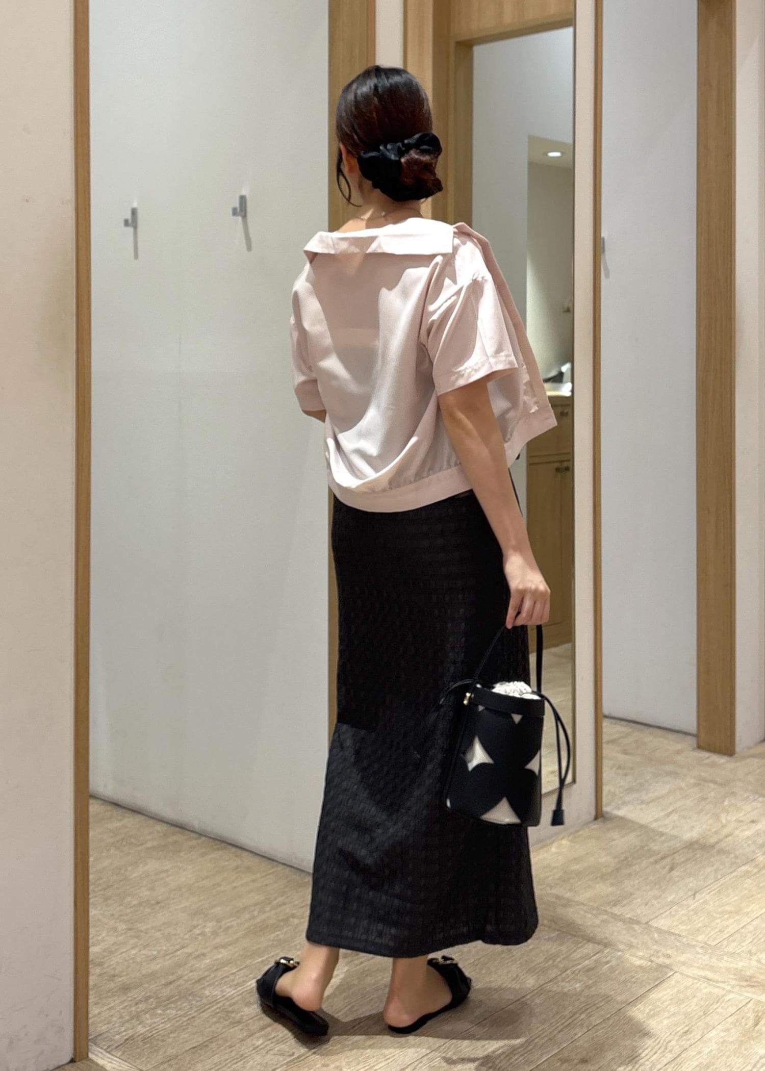襟を抜いて着ることにより縦ラインを邪魔せず、抜け感を演出 -