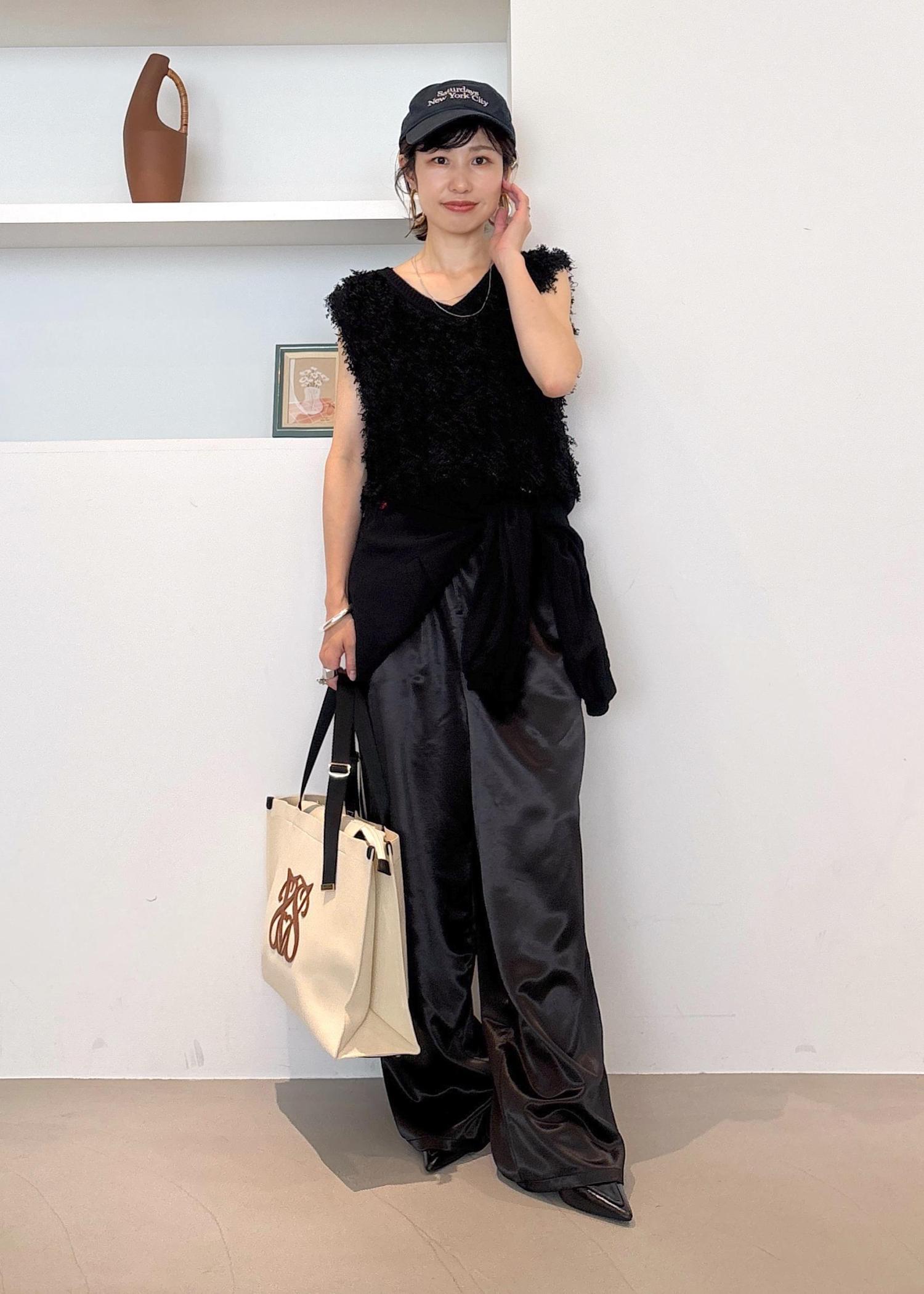 好みのブラックコーデが完成しました♪フリンジベストとサテンパンツとそれぞれデザイン性のあるアイテム同士も、同系色にすることでカッコよくまとまります◎またブルゾンを腰巻きでこなれ感をプラス。夏から秋にオススメの大人カジュアルコーデ。