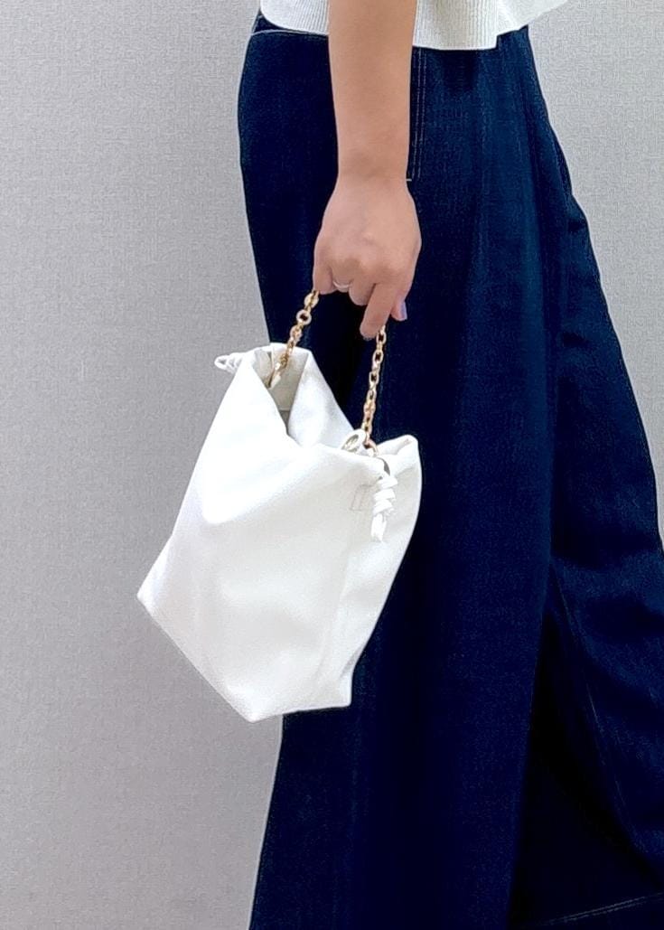 手持ちと肩掛けどちらでも使っていただけます!ハンドルがチェーンになっておりシンプルすぎず高見えするようなデザインです◎