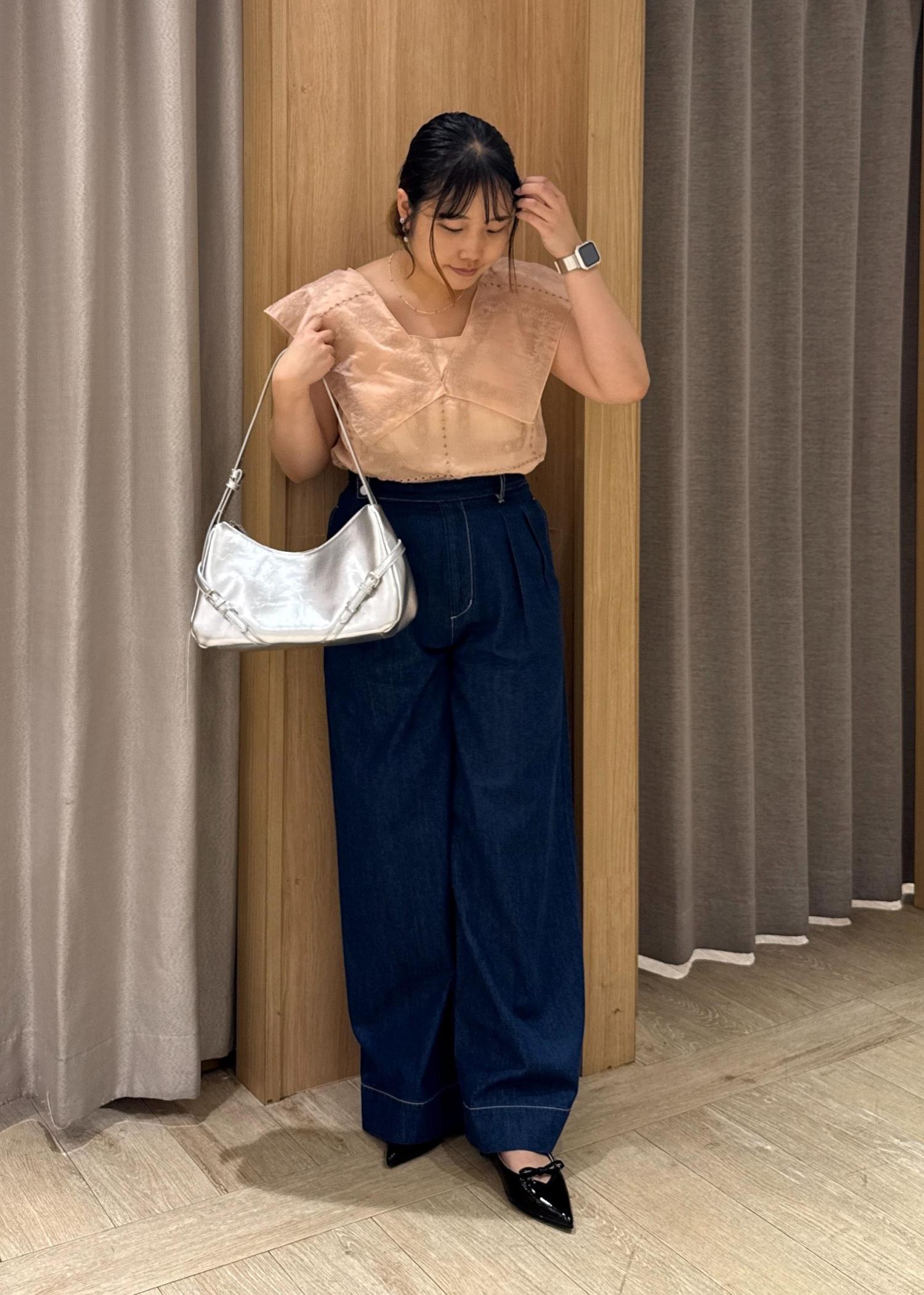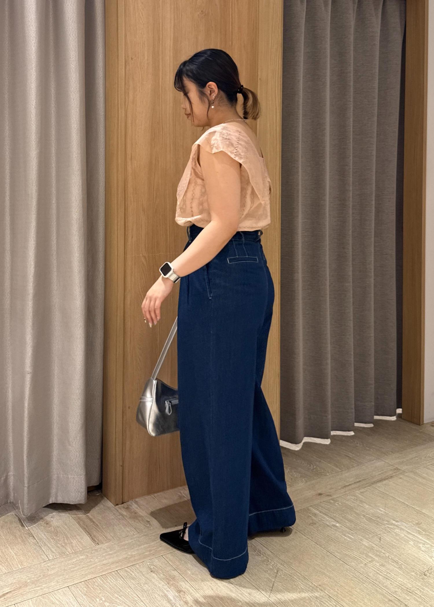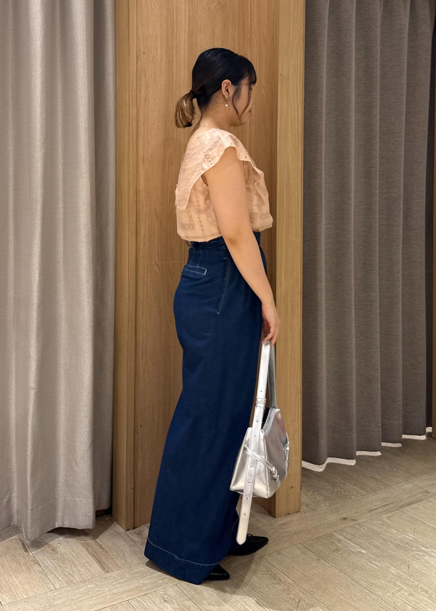 首元の空いてるブラウス、ミュールで抜け感を出し、パンツは暗めの色で落ち着いた印象になるよう合わせました。