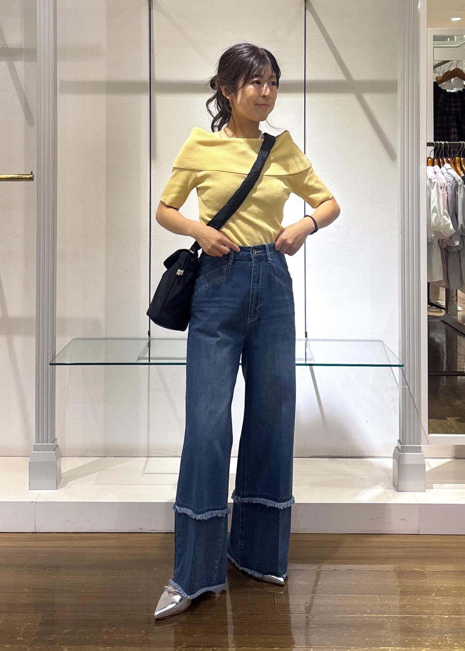 VIS【アンチピリング/UVケア/洗える】オフショルハーフスリーブニットイエロー系 / F¥4,939レビュー身長156cm/F着用。リブ編みでストレッチが効いているオフショル風ニットは一枚で着映え◎シャリ感のある素材なので肌触りもさらっとしていて秋まで着られます♪露出が控えめなオフショル風デザインはお仕事着にもおすすめです!