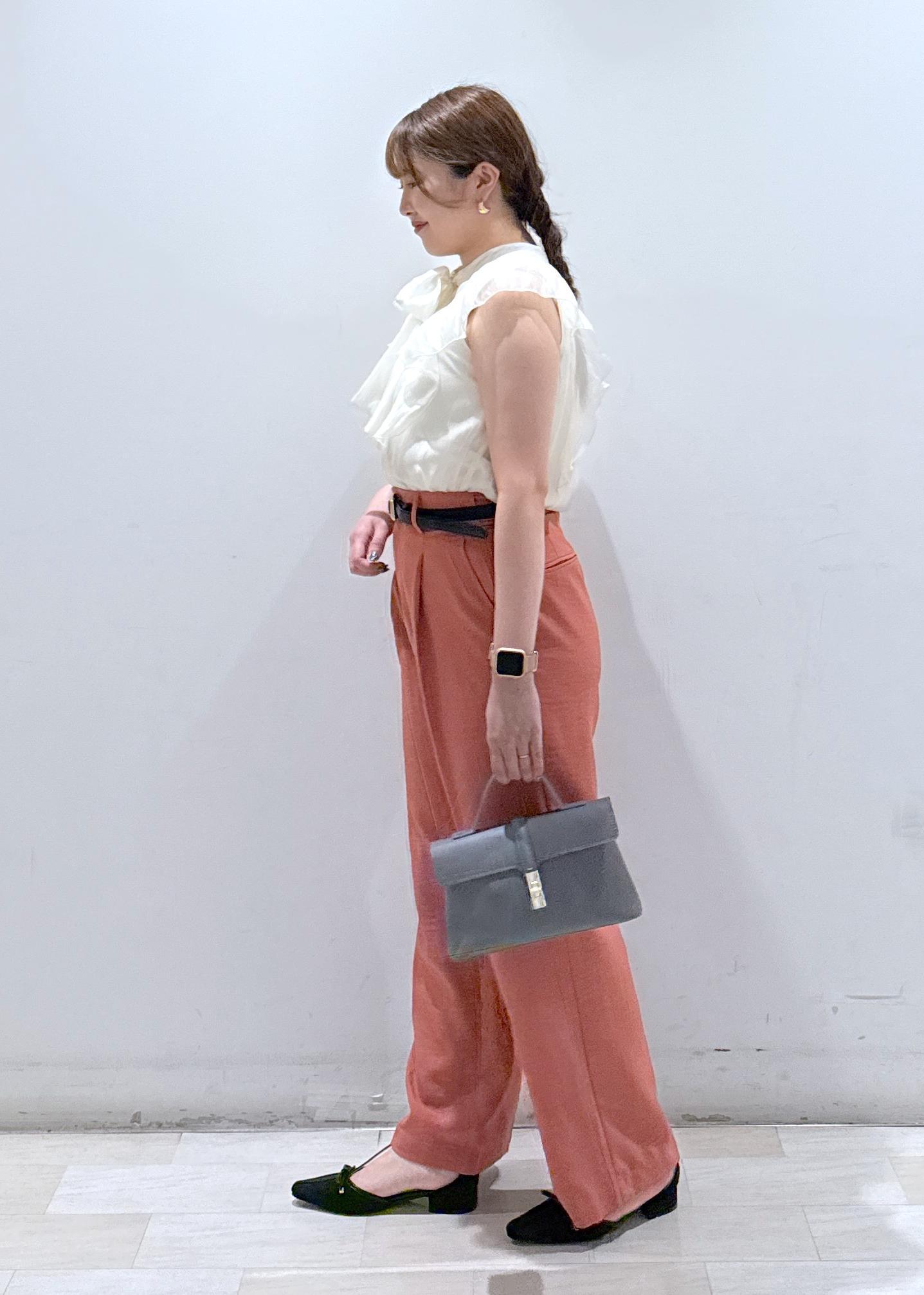 フリルのあるボウタイブラウスにコーラルピンクの美easyのワイドと合わせて、オフィスなどにも使える可愛らしい綺麗めなコーディネートにしてみました。