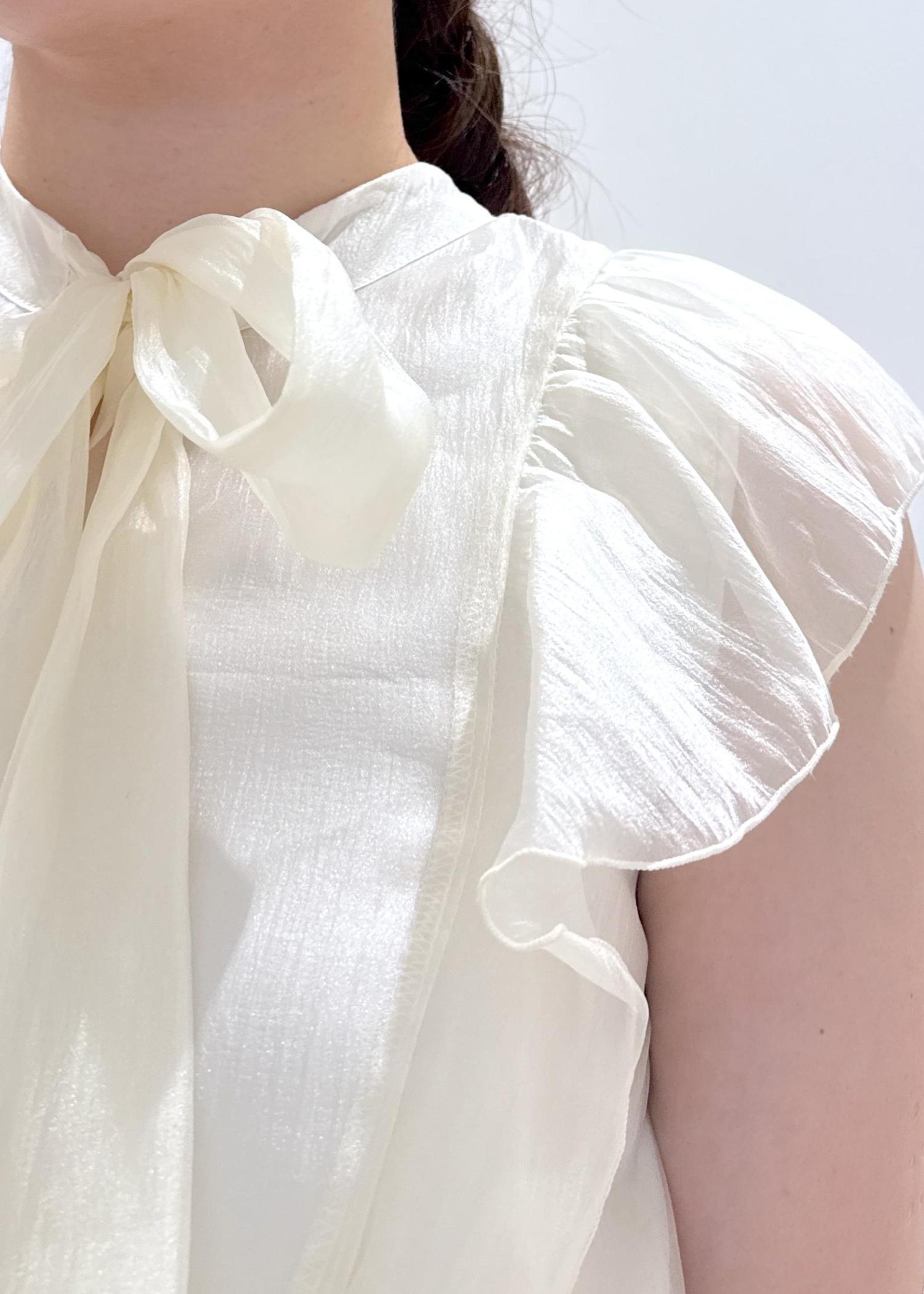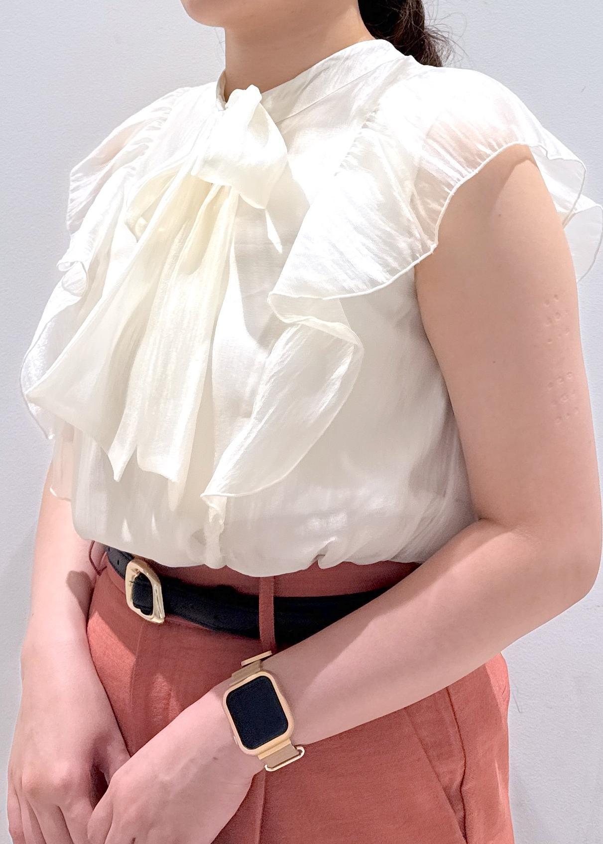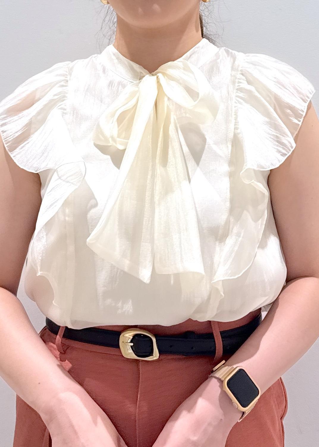 VIS【店頭人気】主役級!華やぎシアーシャイニーボウタイフリルブラウス【前後2WAY】【洗える】キナリ / F¥5,489レビュー気分に合わせて2wayで使用できるフリルブラウス⭐︎サラッとしている素材感なので、とても着やすいです!私は二の腕が特に気になって隠したいのですが、こちらはお袖にフワッとボリュームがあるので程よくカバーできます。個人的にデニムと合わせてカジュアルなスタイリングが好みです。