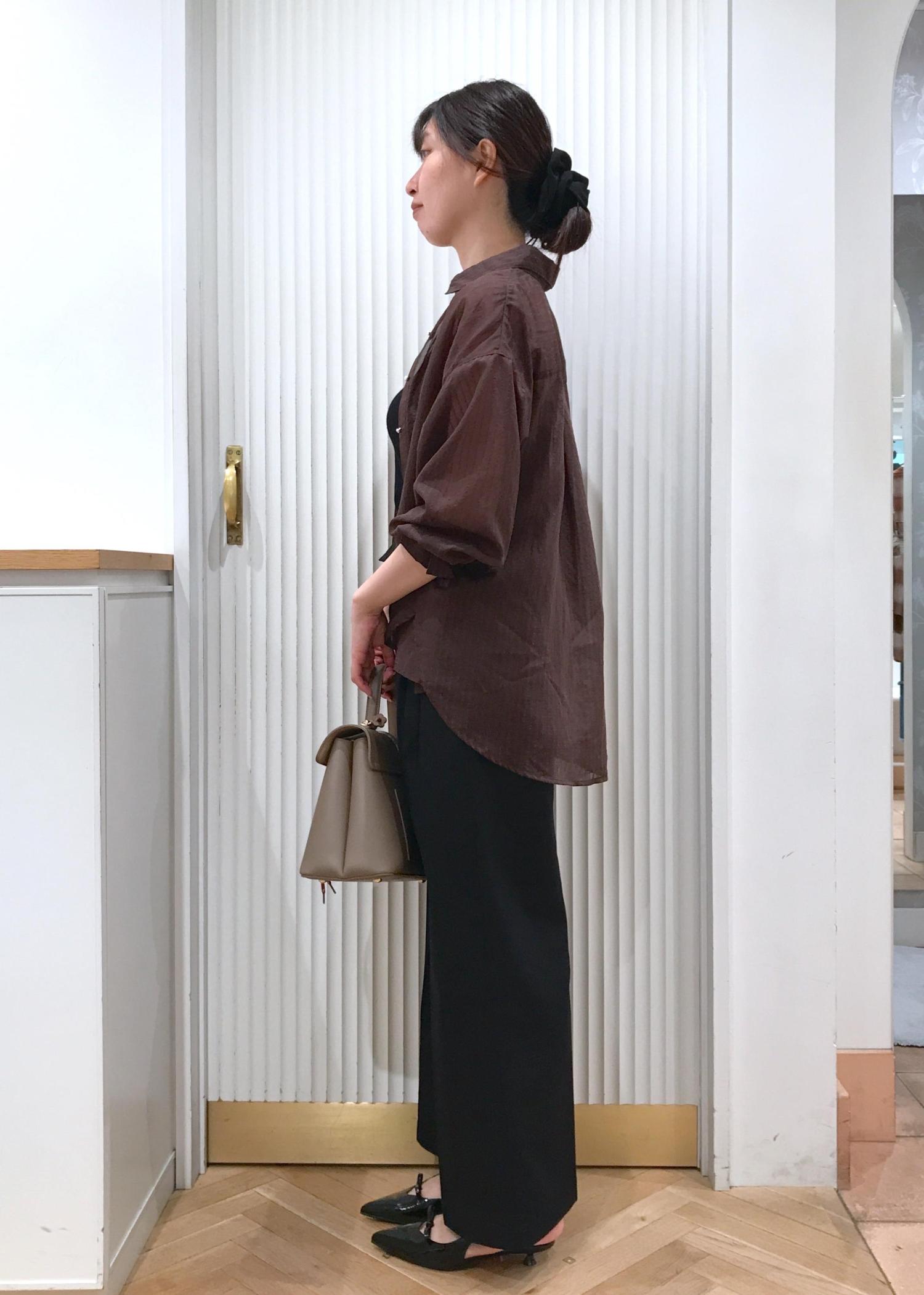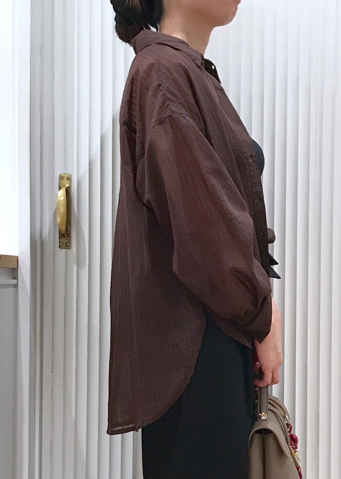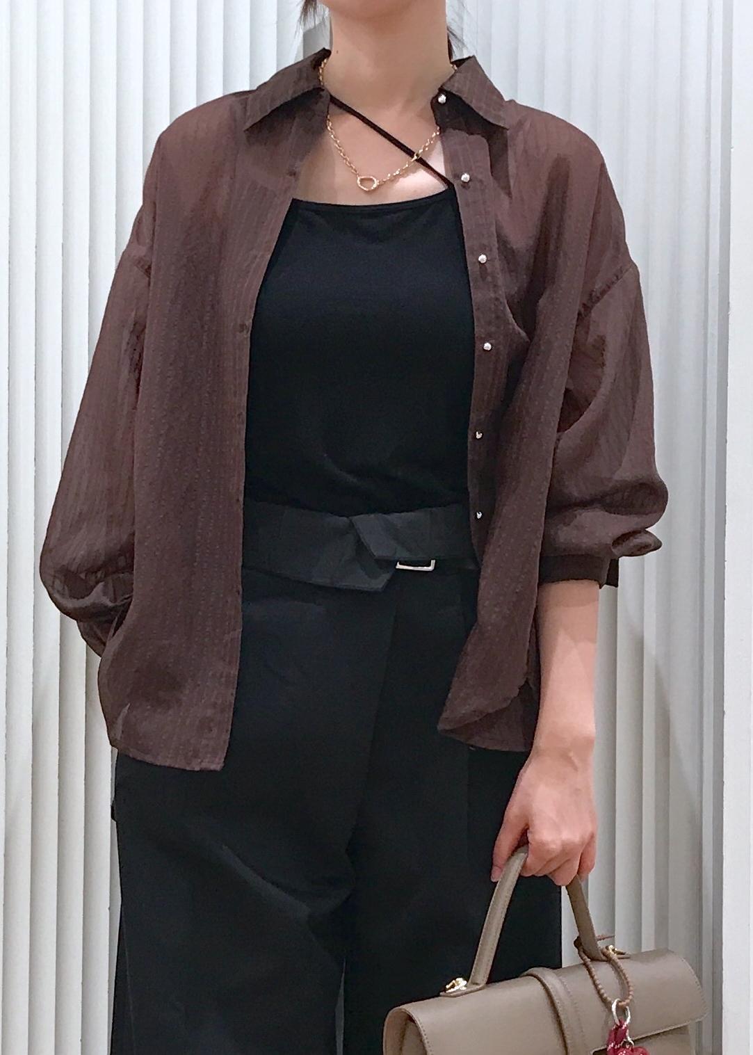 暑い季節が続いても徐々に秋物も欲しくなる季節なので、シアーのシャツをブラウンにすると涼しく秋見え出来るのでおすすめですよ。