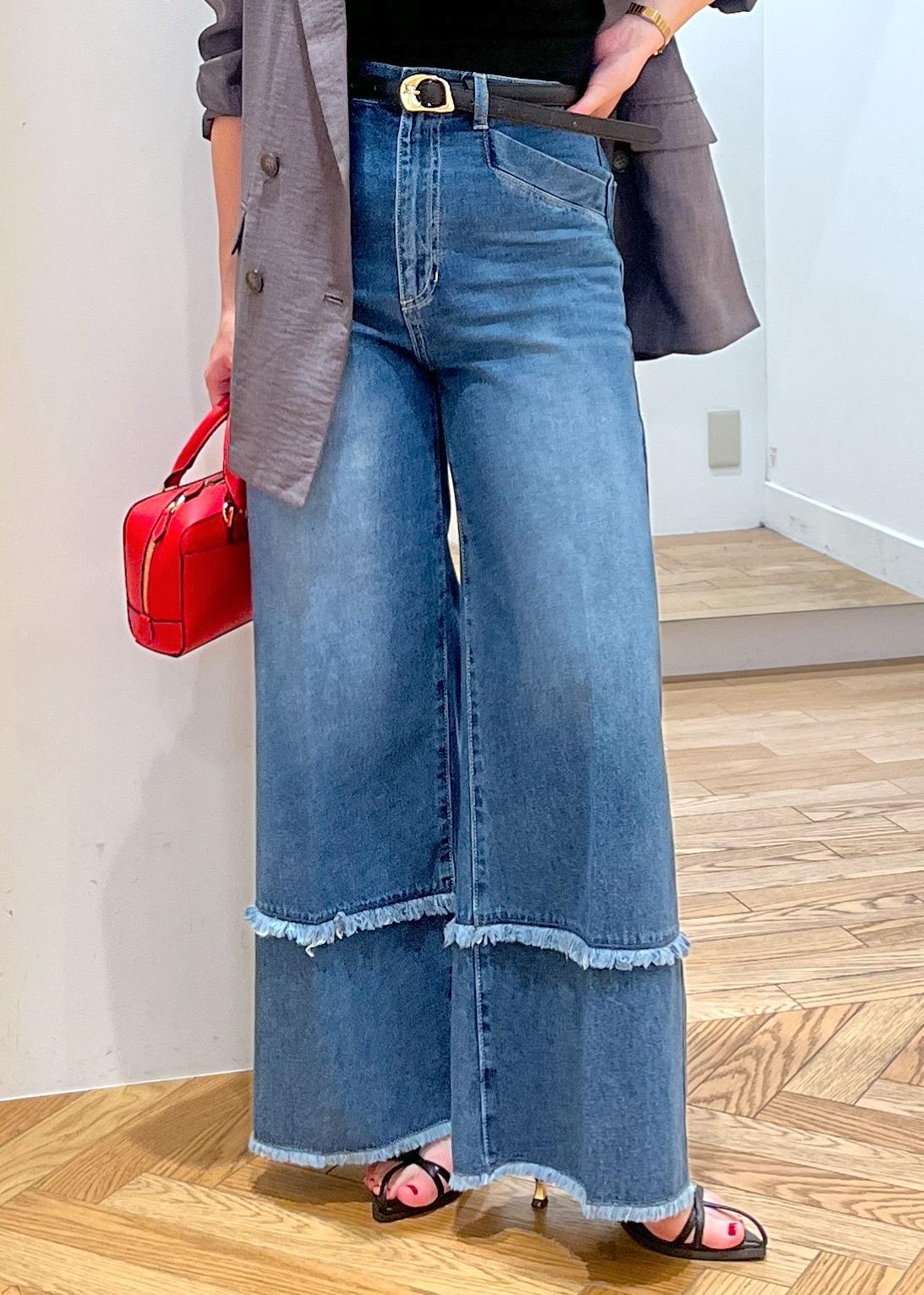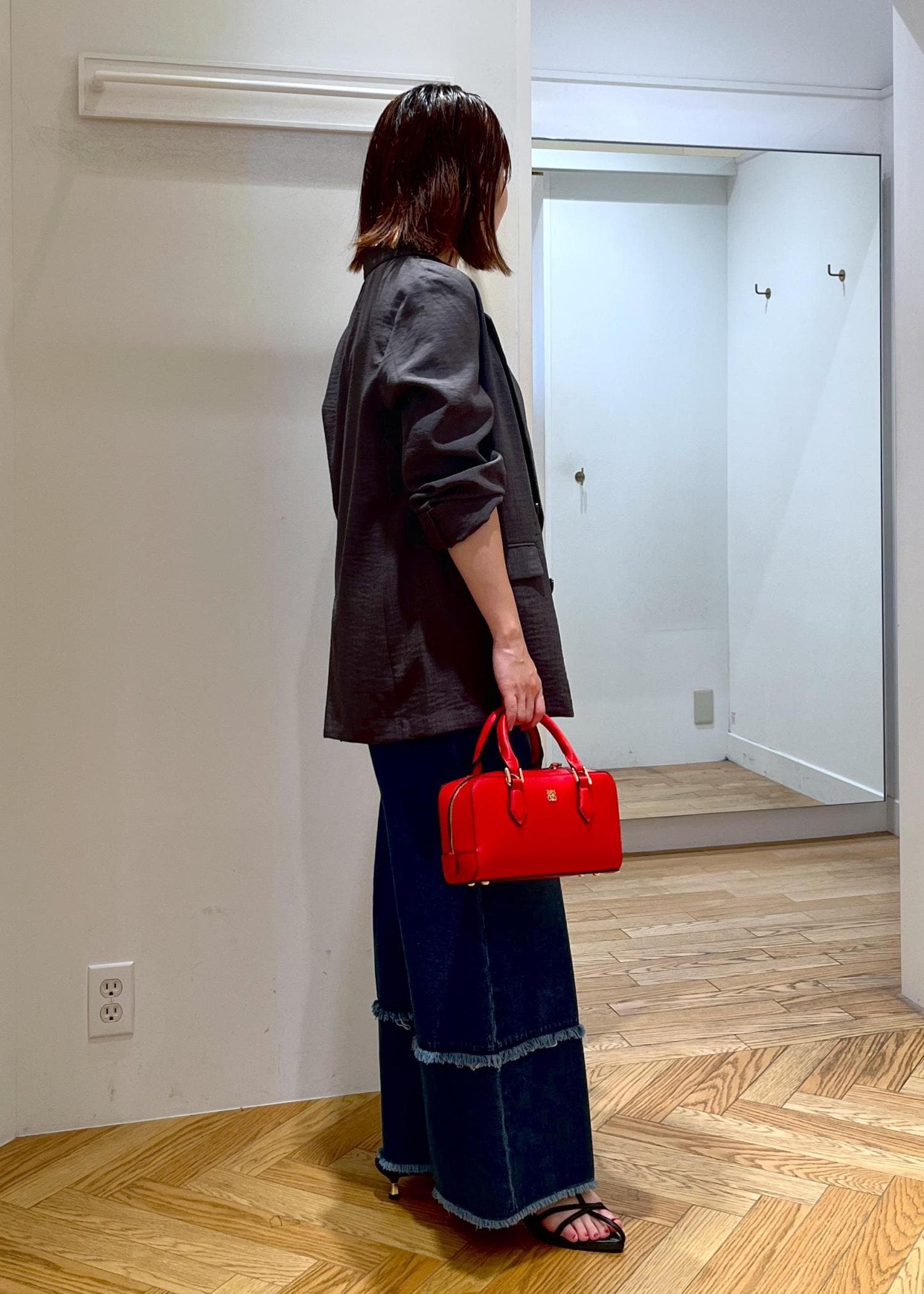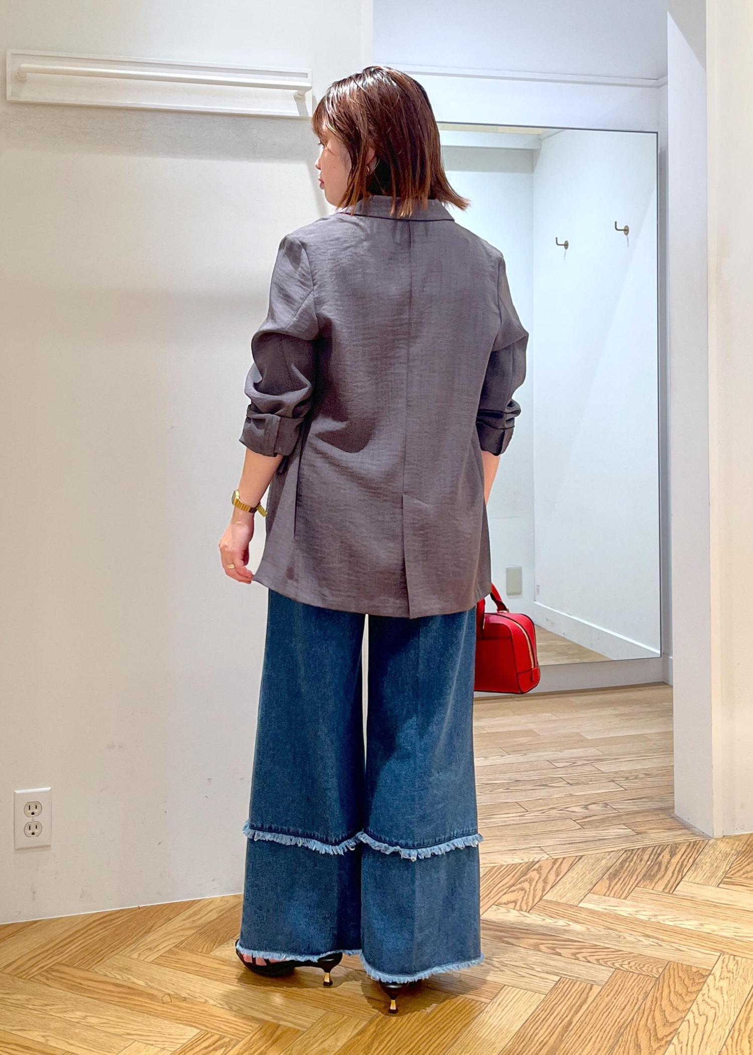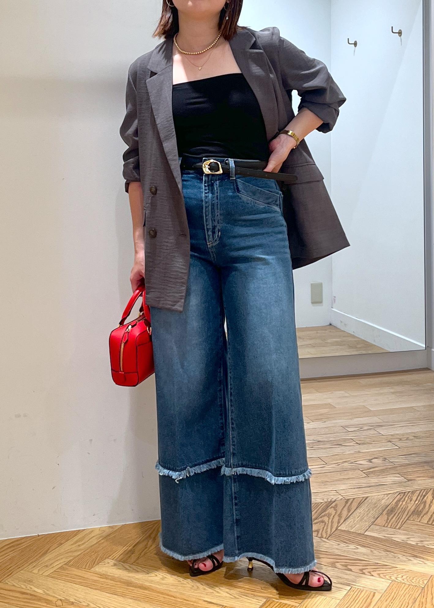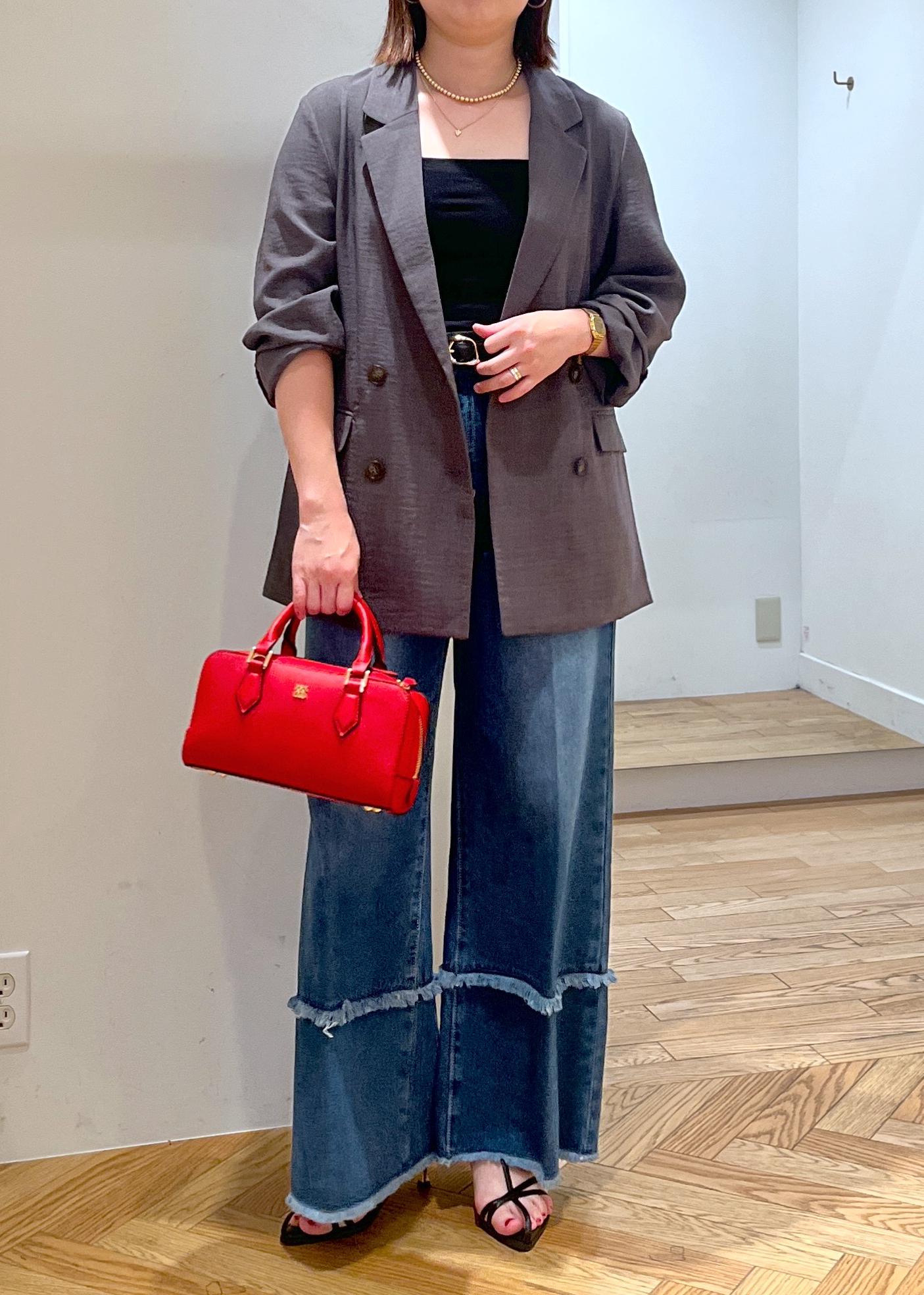 フリンジデザインがかわいいデニムと、レディライクな印象を楽しめる小物を合わせて、大人かっこいいジャケットスタイルにまとめました♡