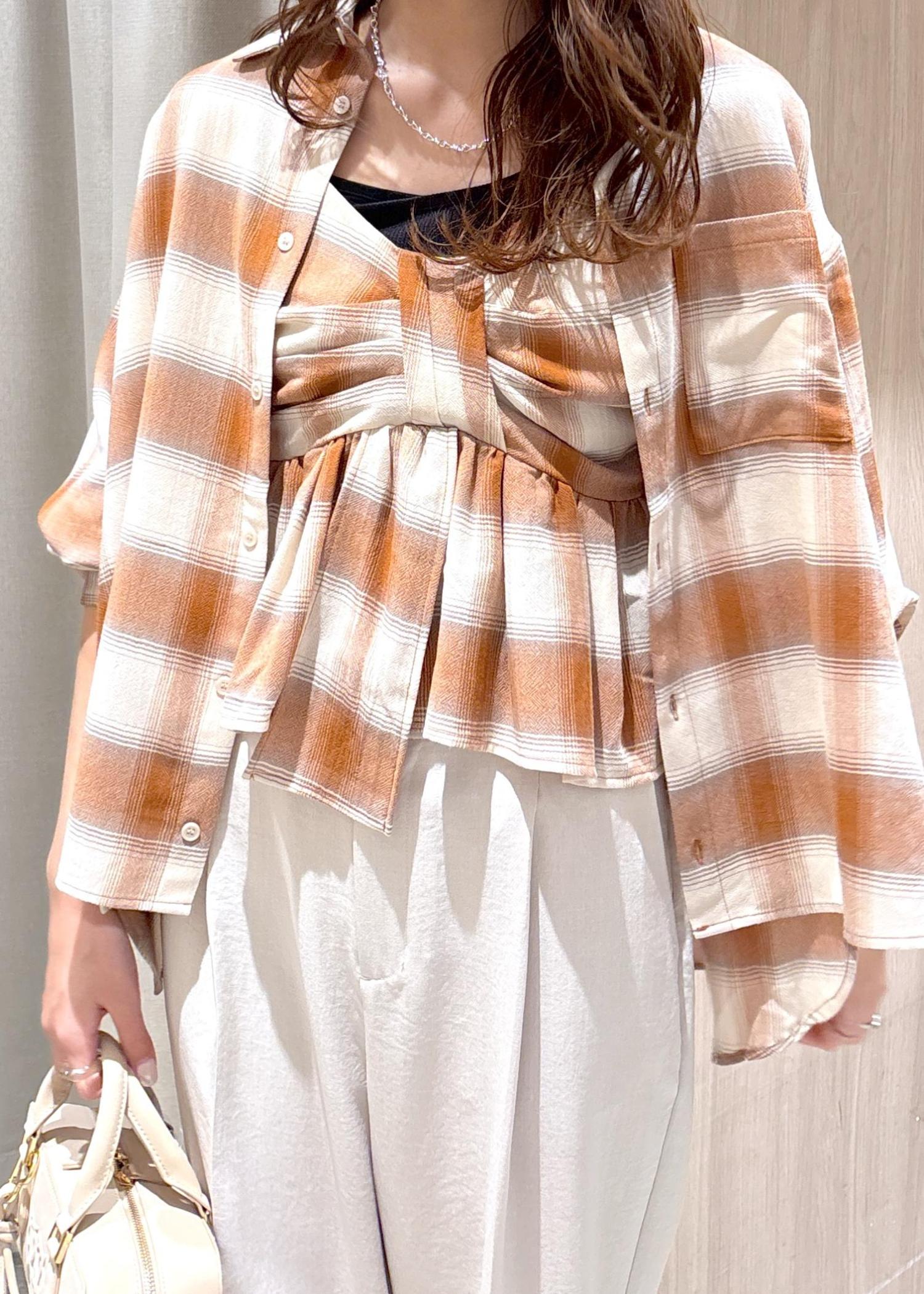 キャメルカラーチェックのビスチェとシャツは甘すぎないカジュアルが簡単につくれます!