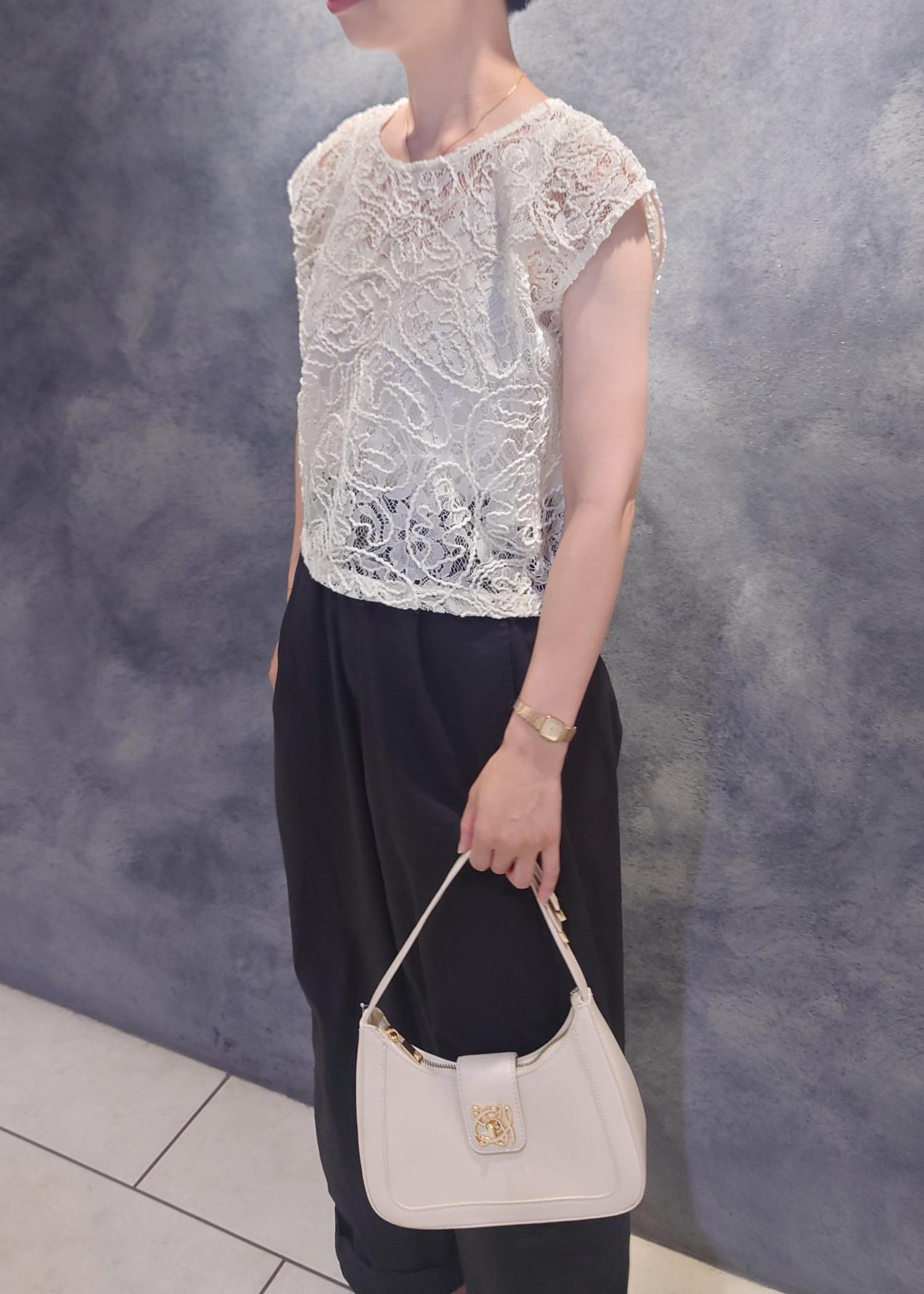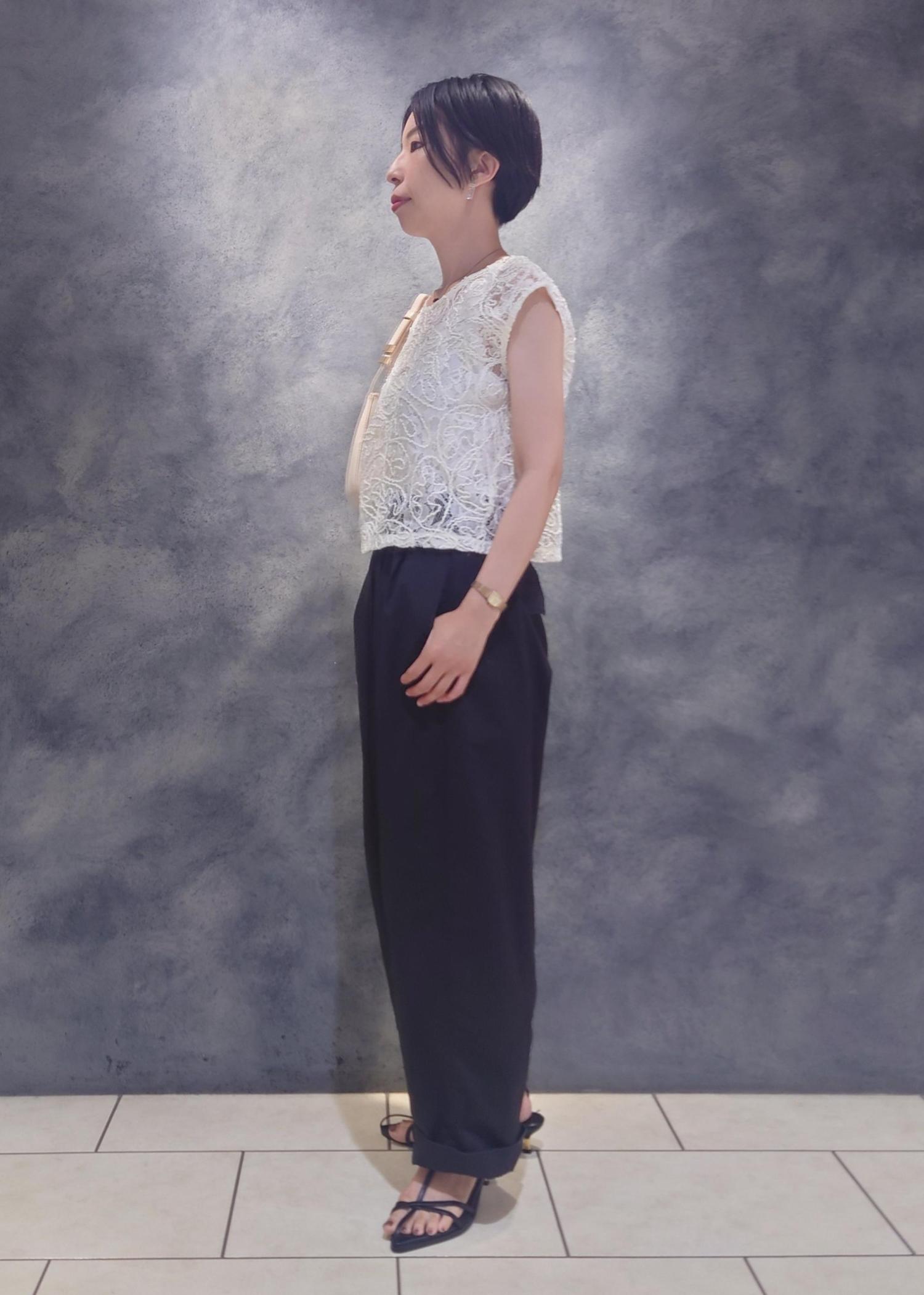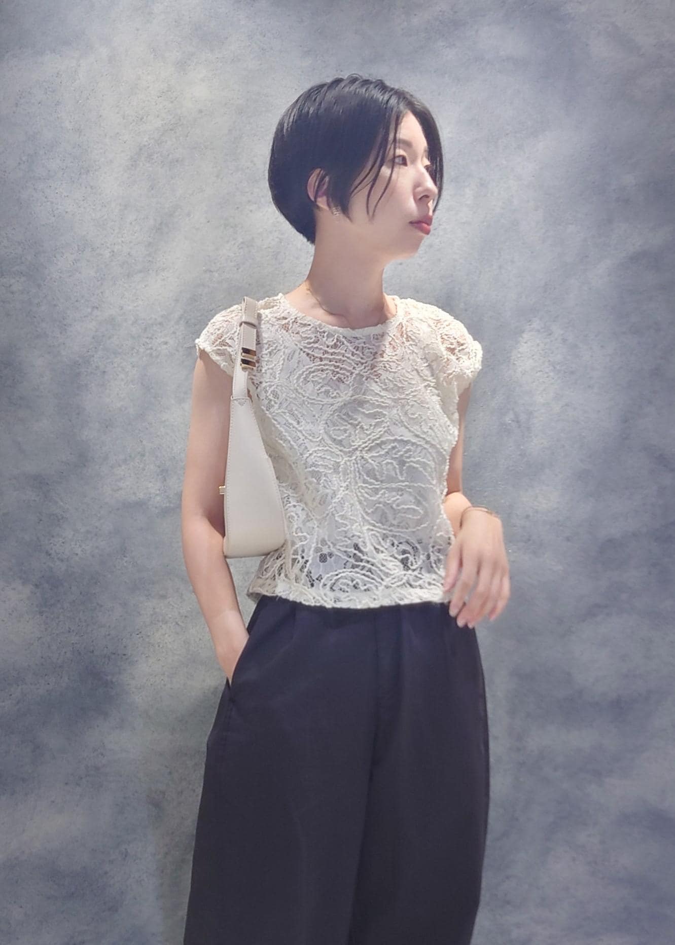 白いレーストップスに黒いパンツを合わせたモードなスタイリングです。