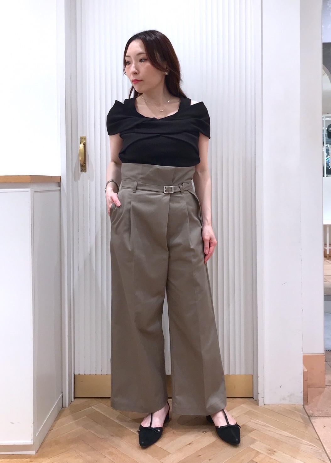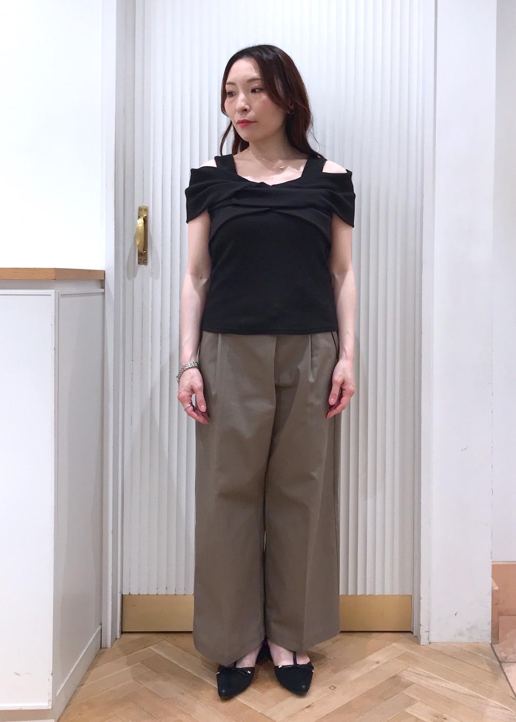 トレンドのオフショルトップスをワイドパンツに合わせて甘さを抑えたスタイリングです。