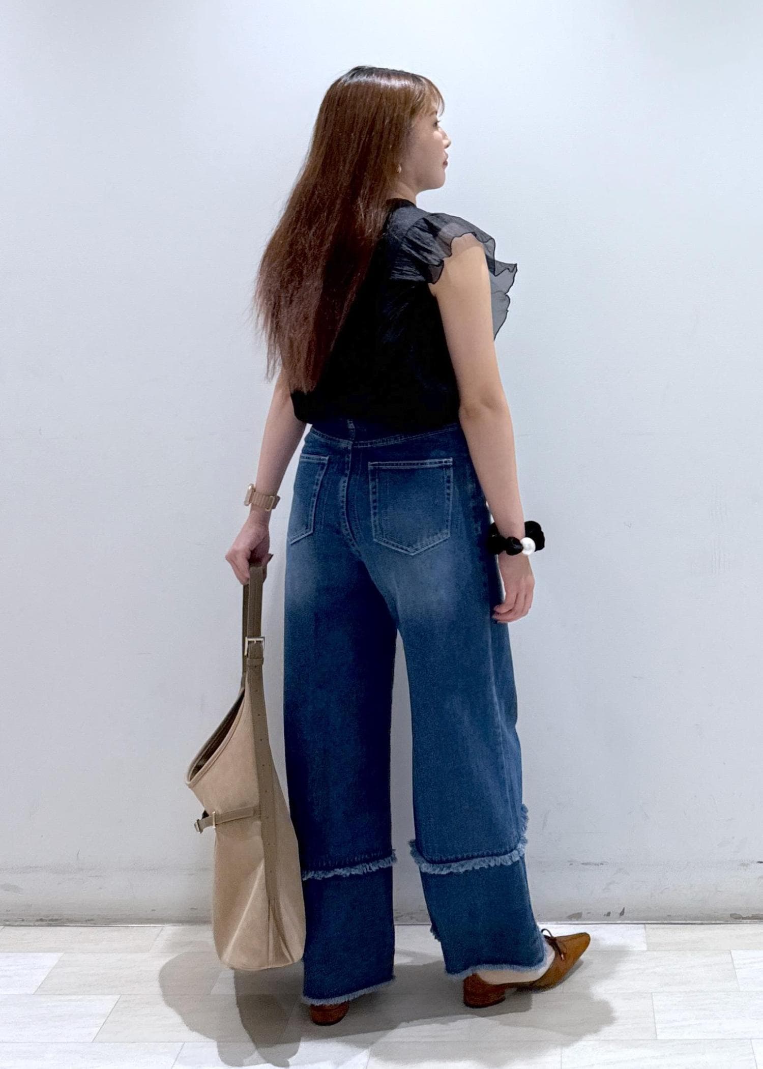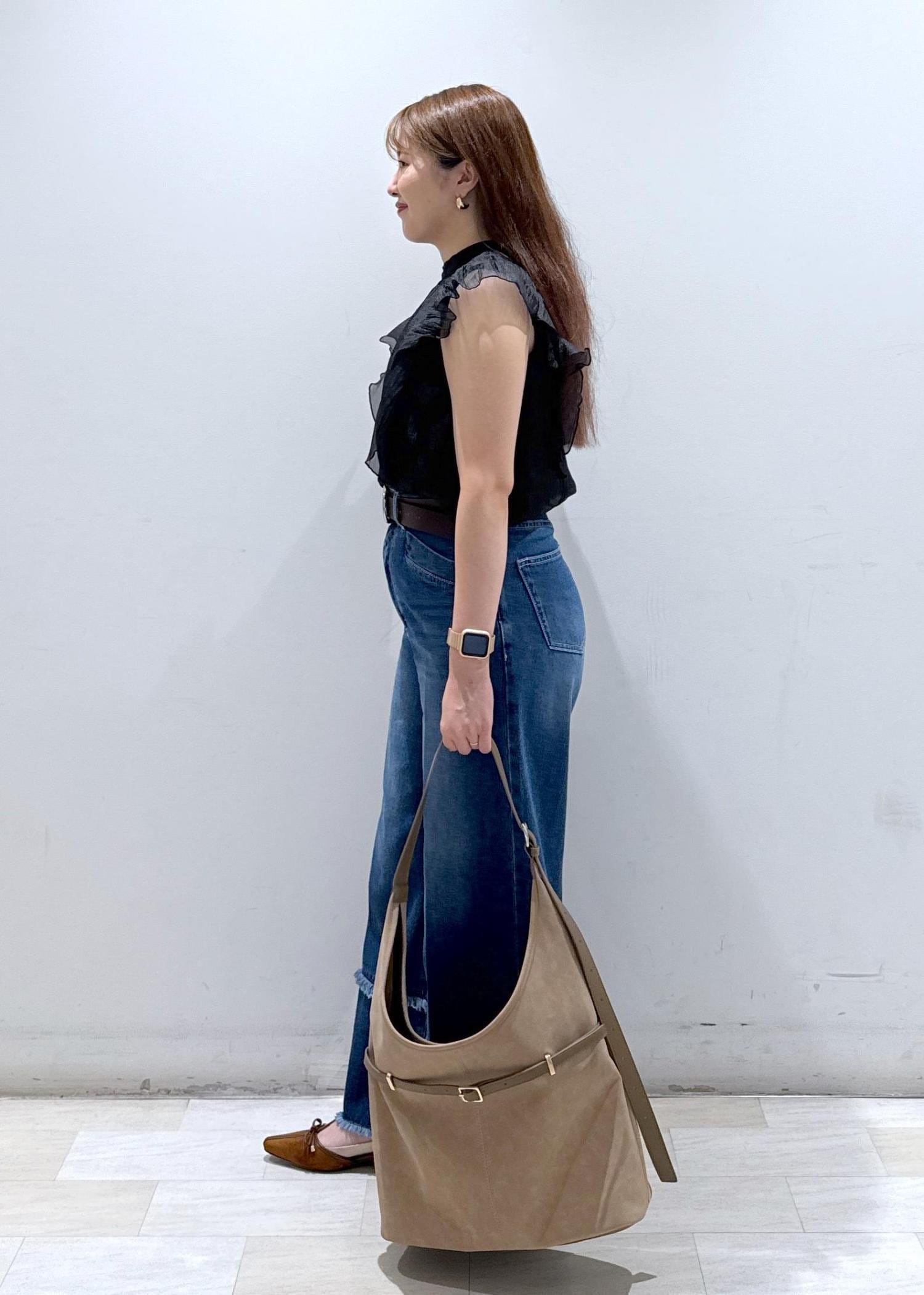 ボウタイのあるブラウスをバッグの後ろ向きにして着用することで、少し甘さを抑えています。カジュアルなコーディネートにしたかったので、フランジのあるデニムを。靴はスッキリとさせたかったので秋を少し意識してブラウンのパンプスと合わせてみました。