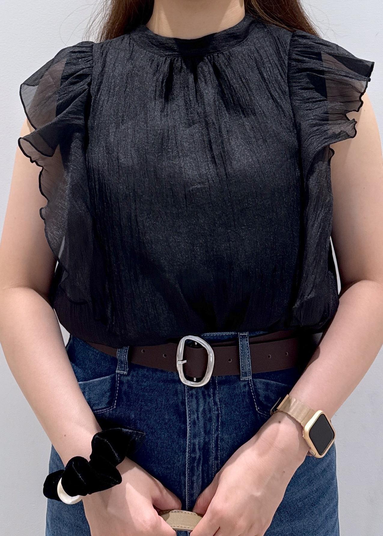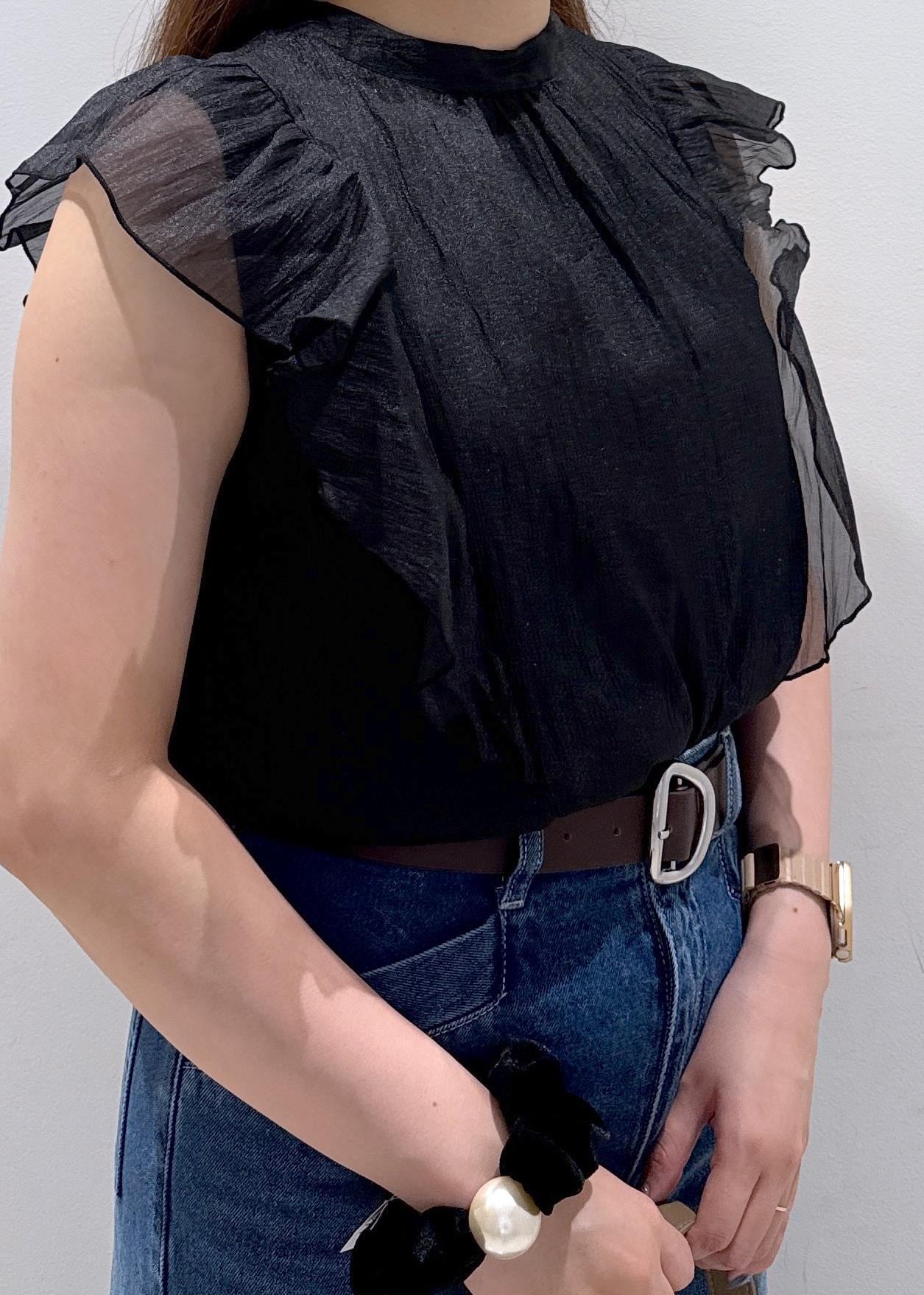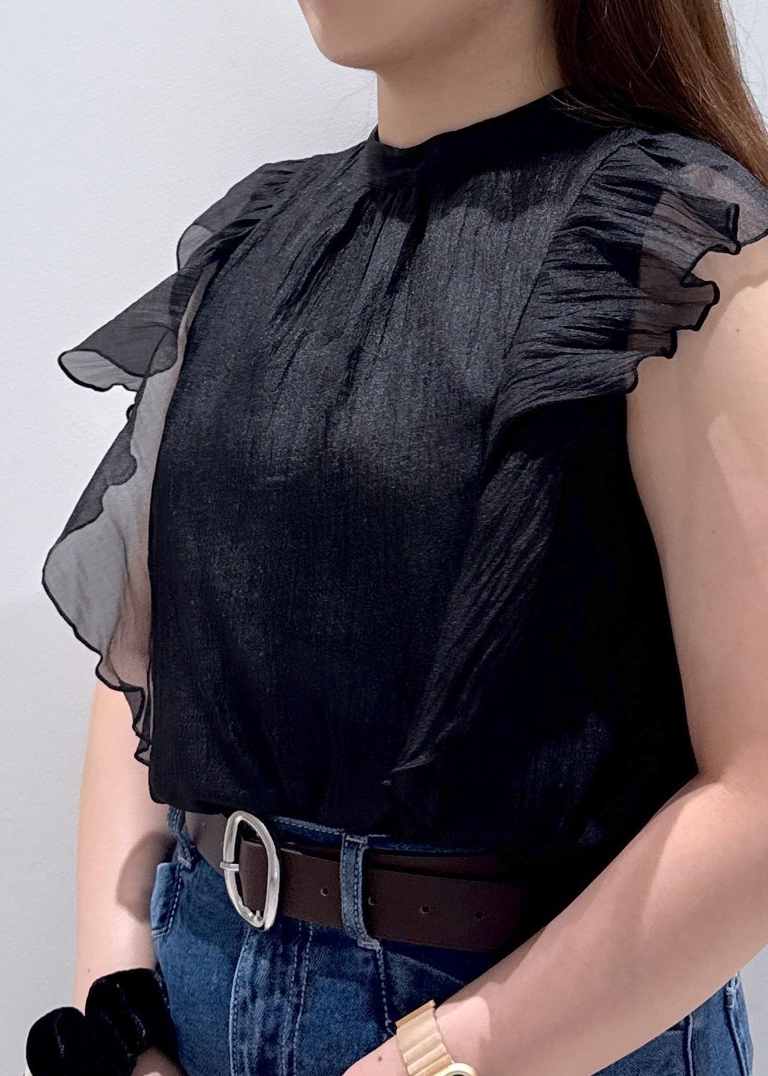 VIS【店頭人気】主役級!華やぎシアーシャイニーボウタイフリルブラウス【前後2WAY】【洗える】ブラック / F¥5,489レビュー気分に合わせて2wayで使用できるフリルブラウス⭐︎サラッとしている素材感なので、とても着やすいです!私は二の腕が特に気になって隠したいのですが、こちらはお袖にフワッとボリュームがあるので程よくカバーできます。個人的にデニムと合わせてカジュアルなスタイリングが好みです。
