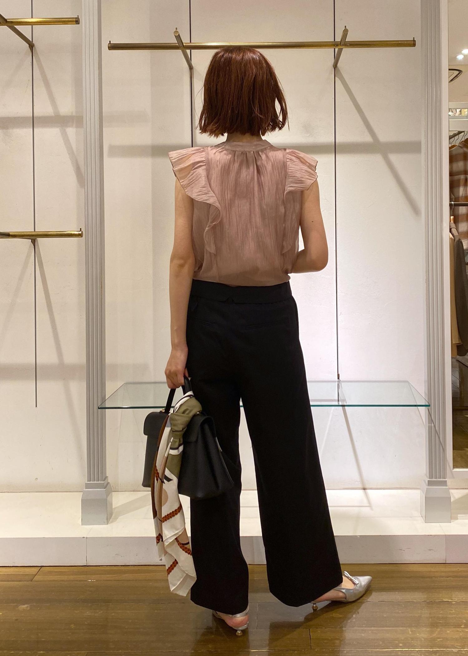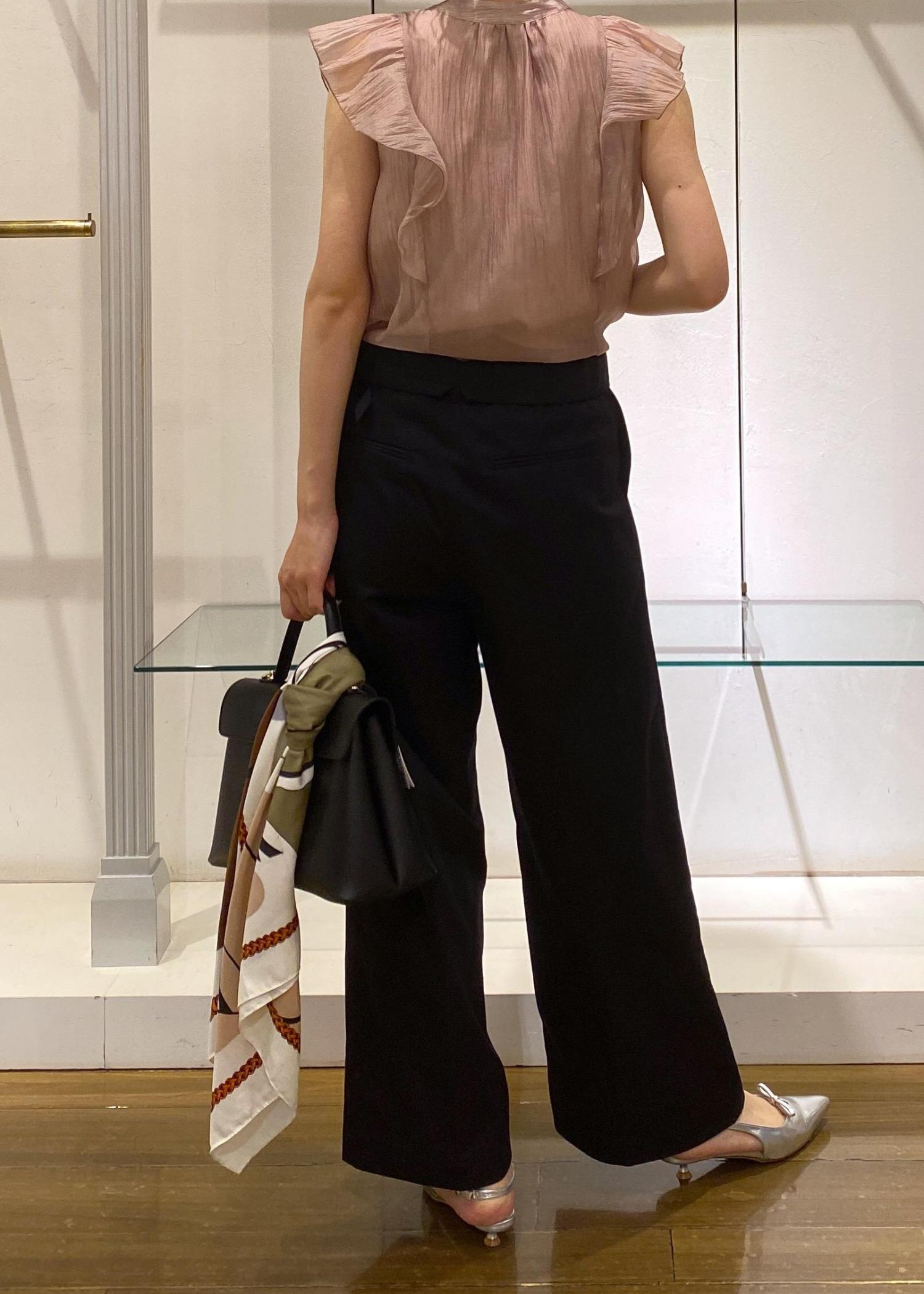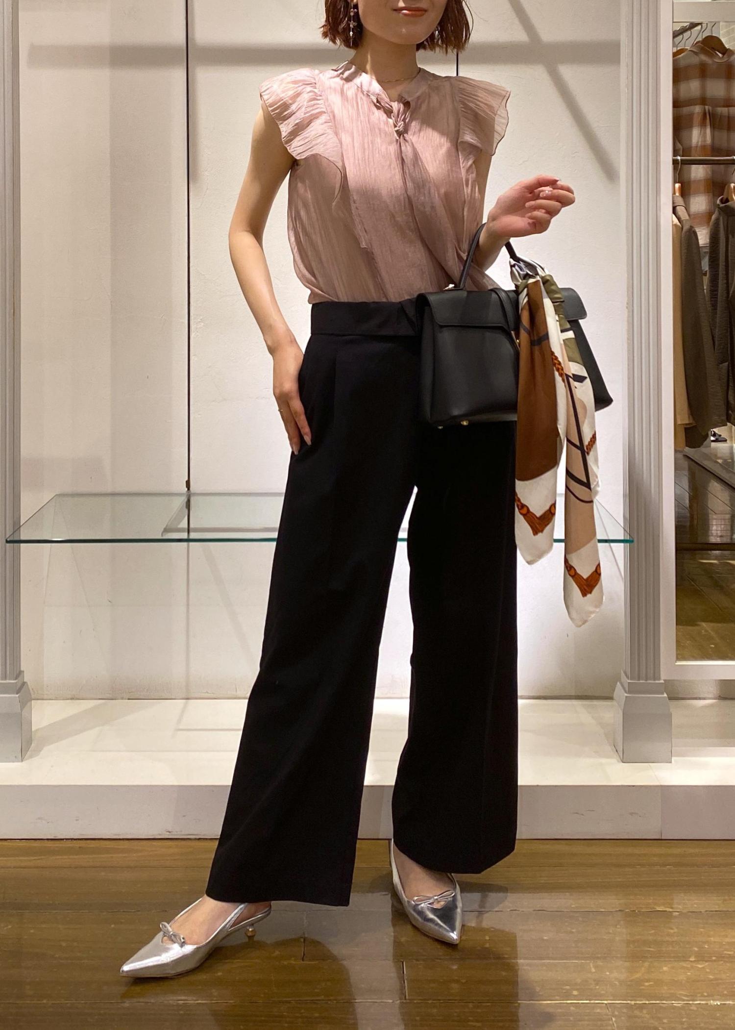 艶感が特徴のボウタイブラウスに、2wayでウエスト部分を楽しめるワイドパンツを合わせたキレイめコーデです!