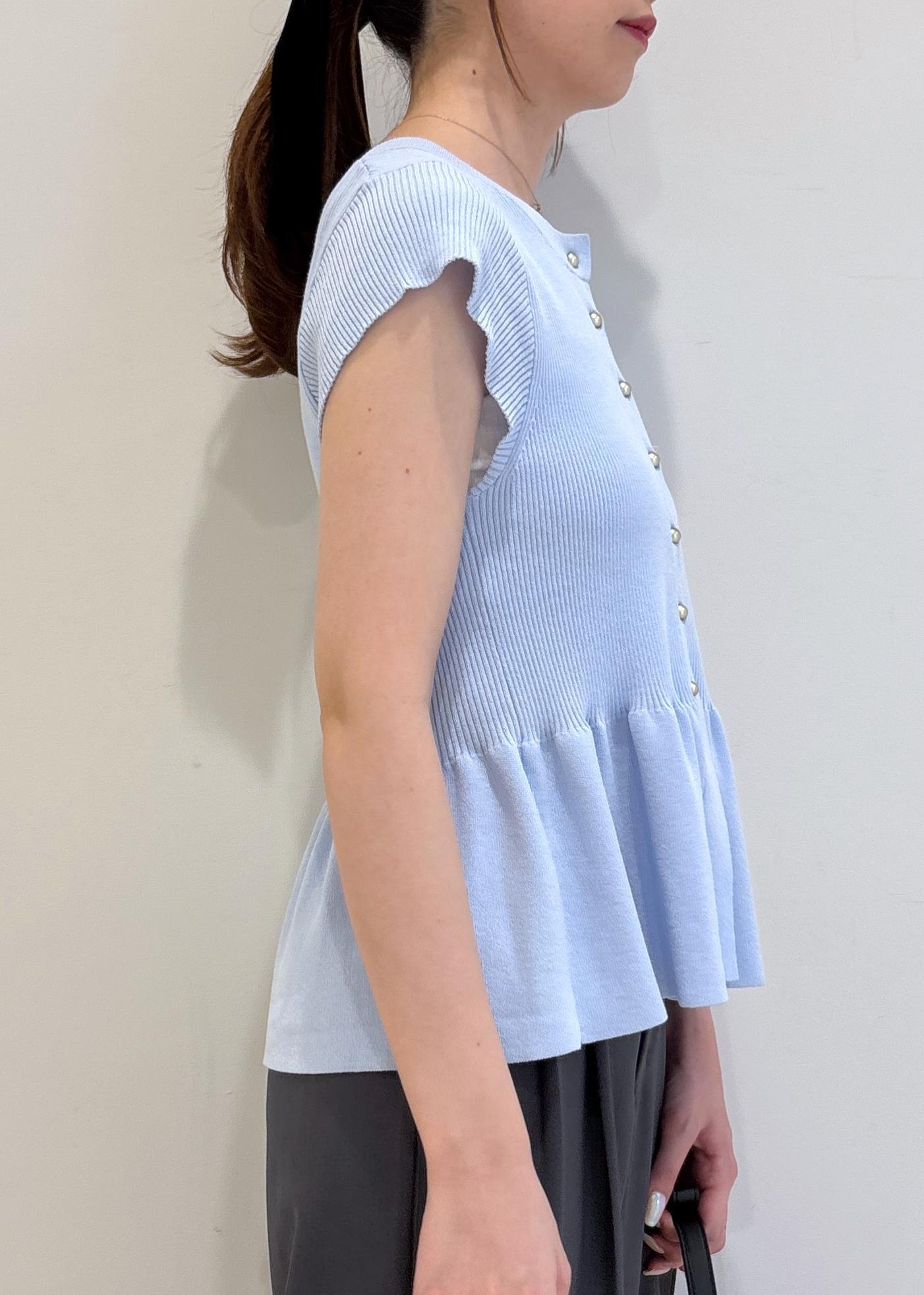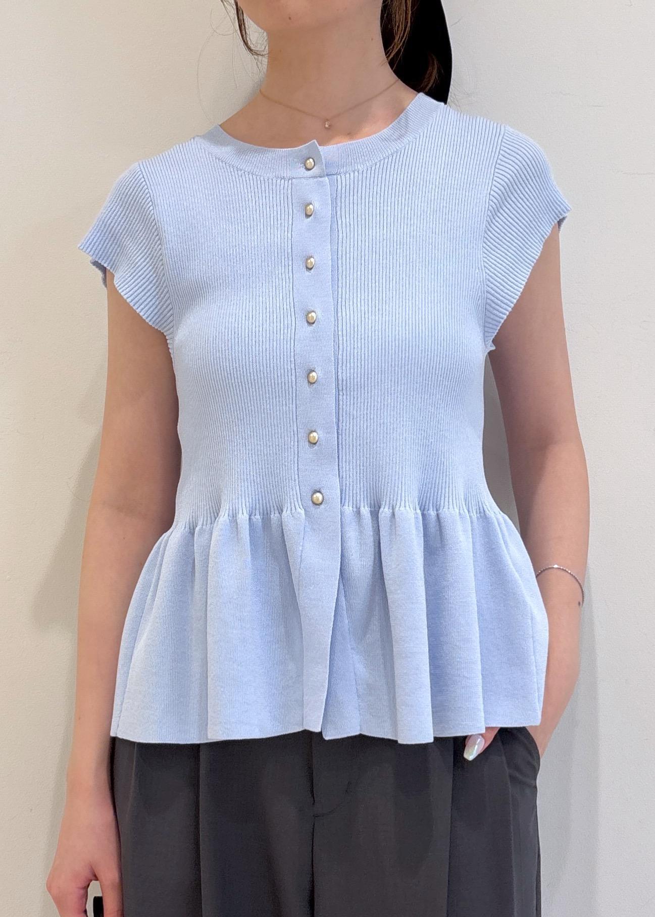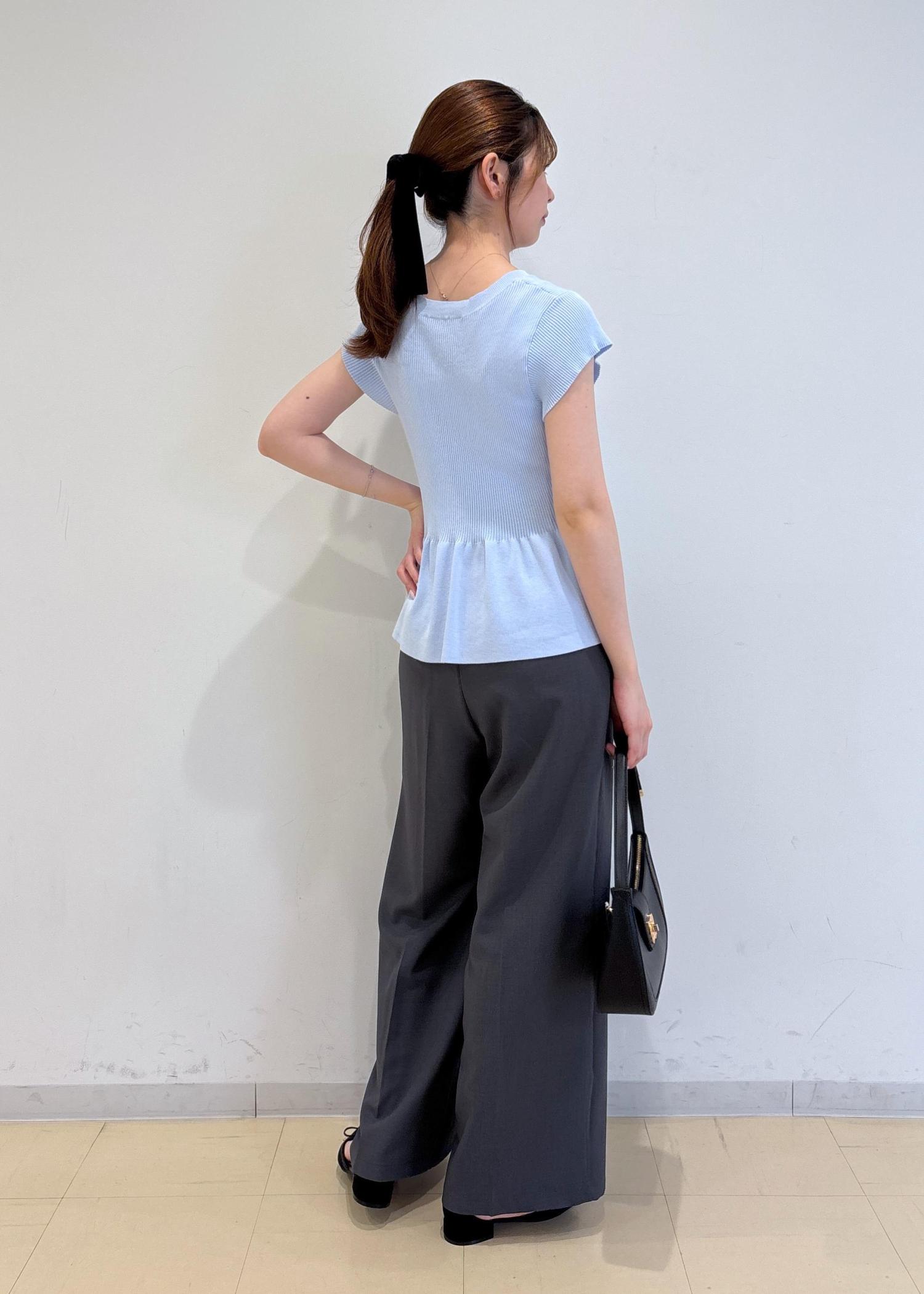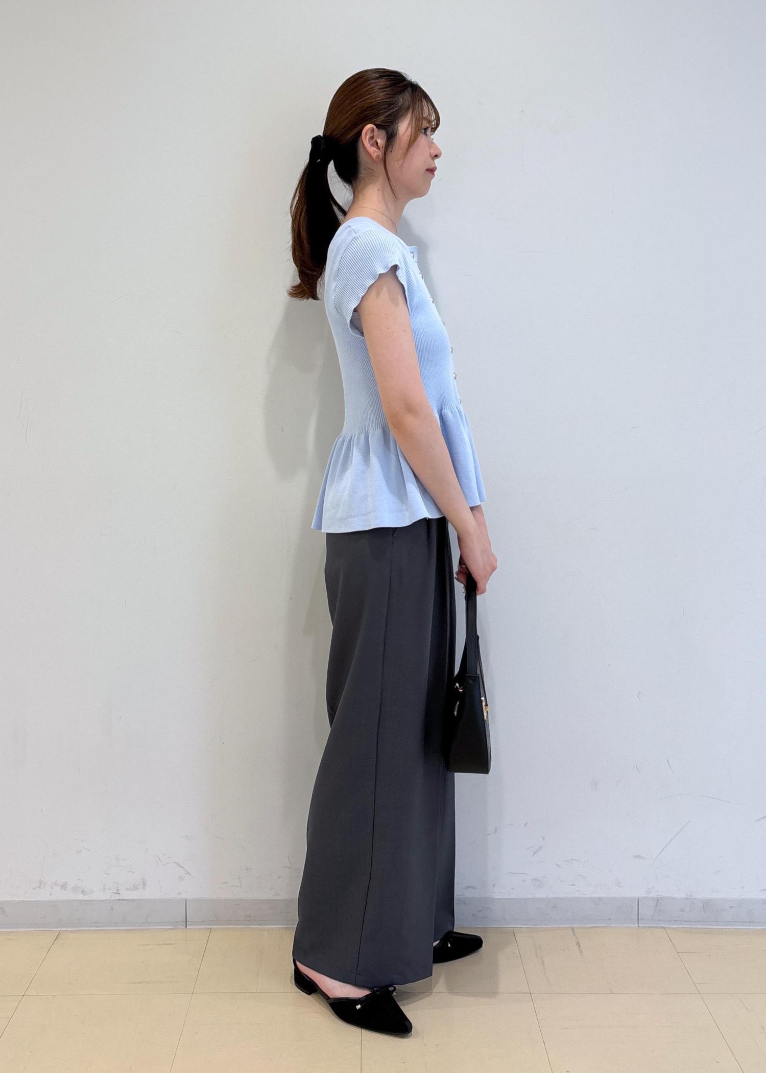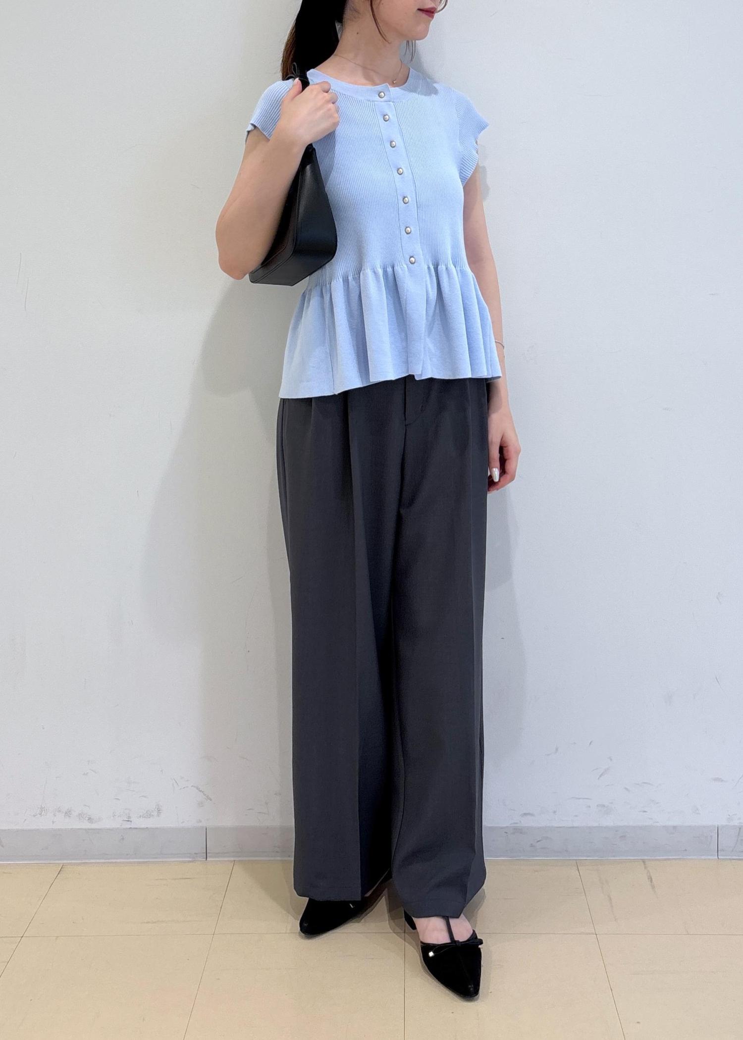 サックスカラーのペプラムカーディガンが目を引くコーディネートです。