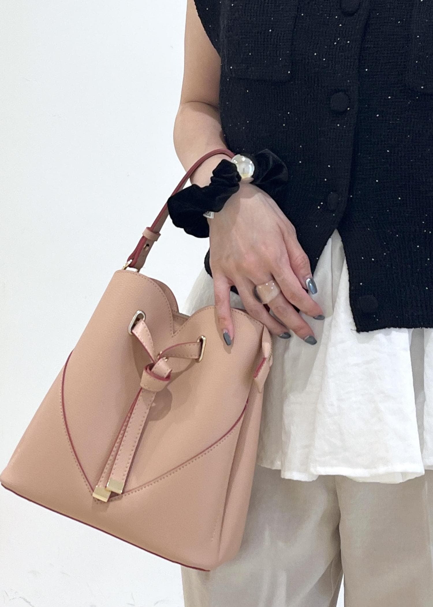 ピンクのハートカットバッグ、高めポニーテールで女性らしさをプラス。