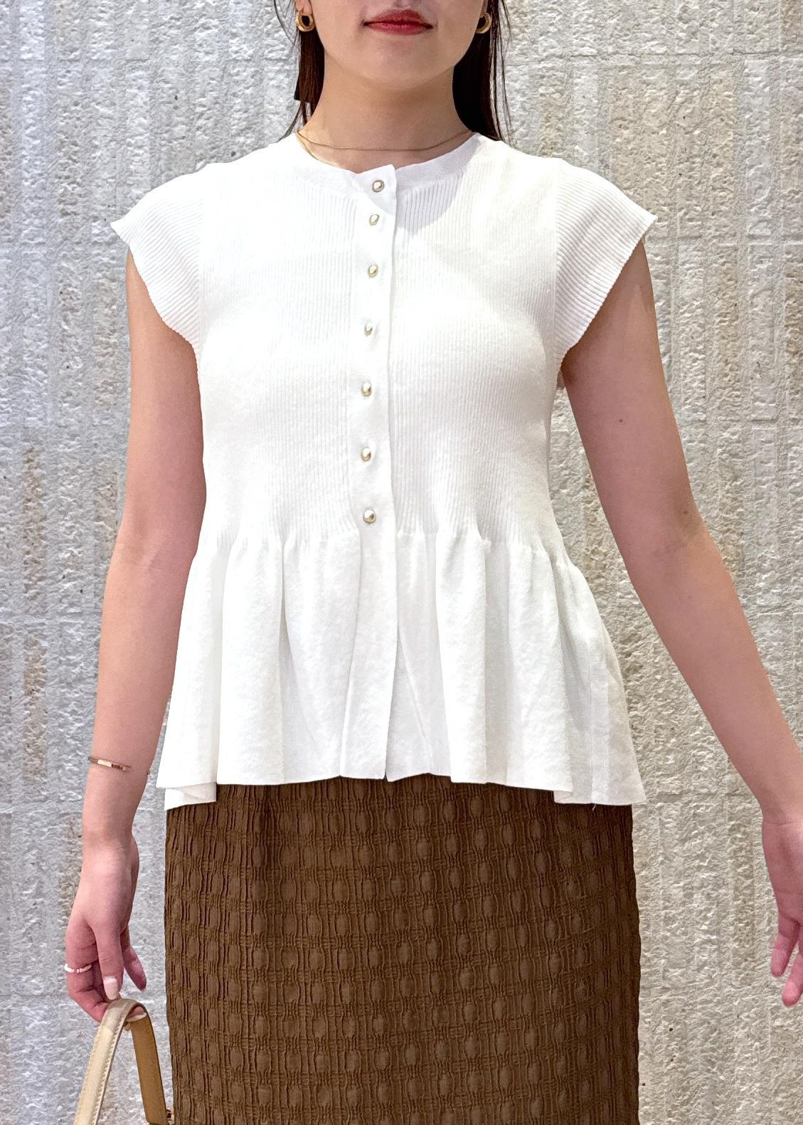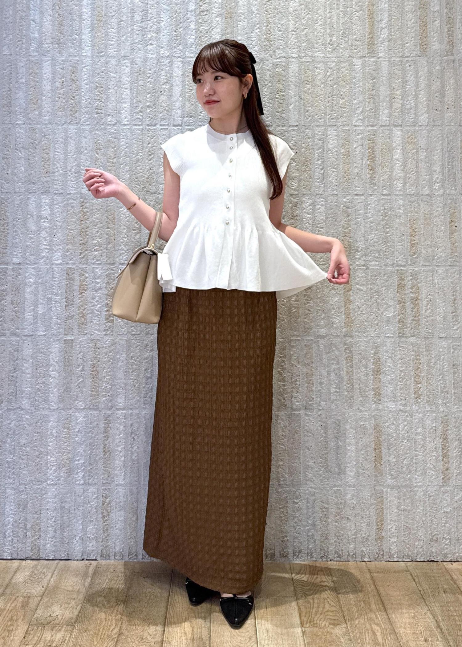 ペプラムデザインのカーディガンをメインに、女性らしいフェミニンな印象に♡