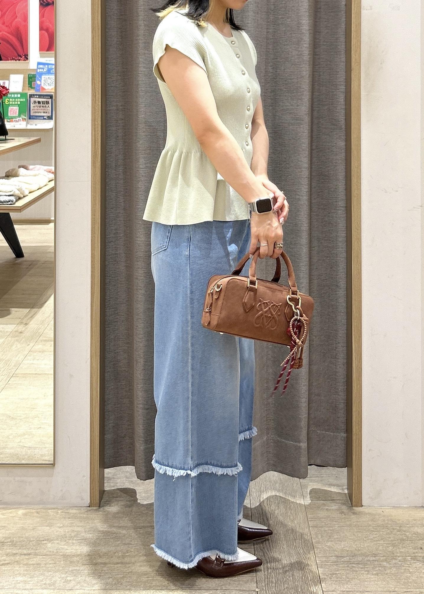 ライトグリーンは柔らかく優しい色味なので、ブラウン系のアイテムとデニムで合わせてナチュラルな印象に◎