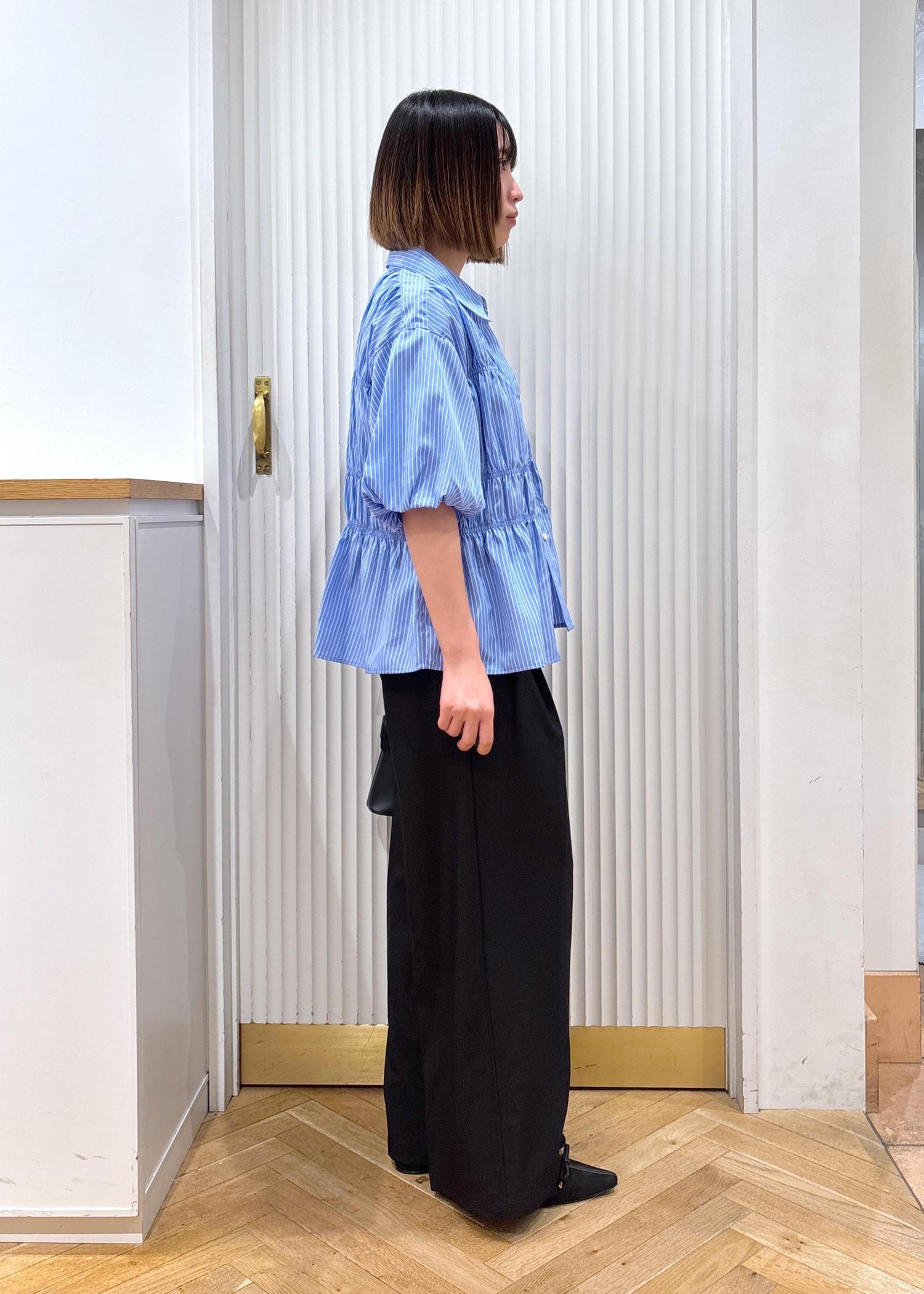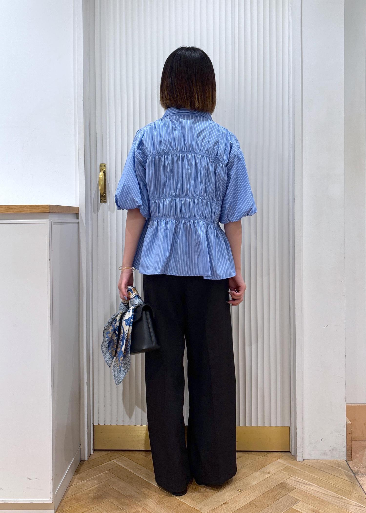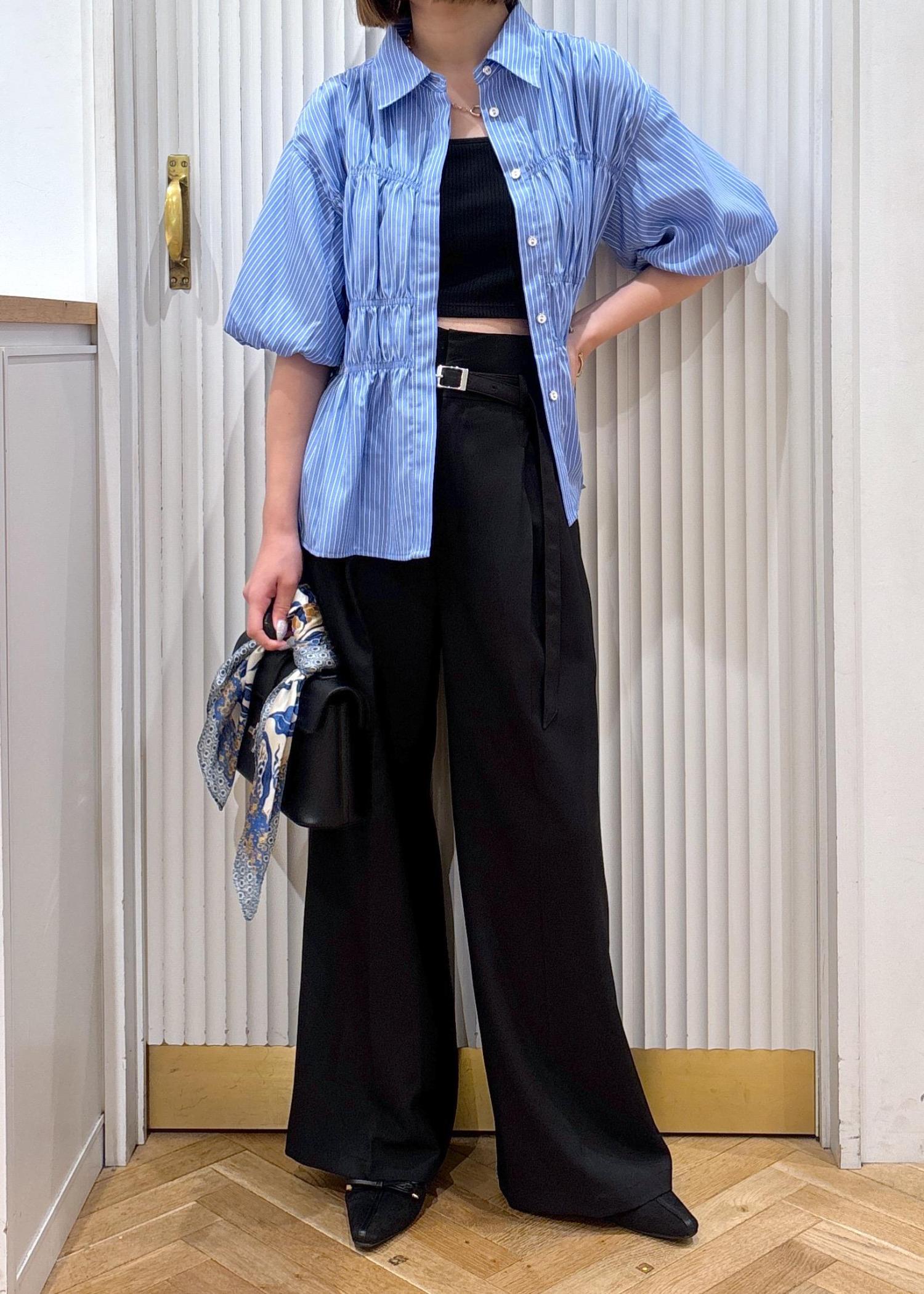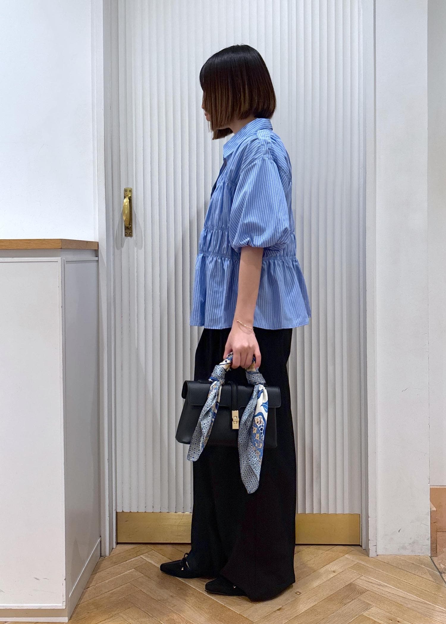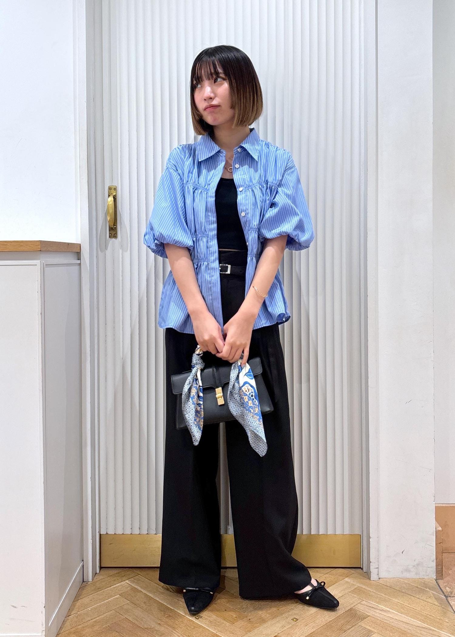 着丈長めのブラウスは脚が短く見えがちですが前をあけてハイウエストのパンツを合わせることで腰位置が高く見え、お尻周りはカバーしつつ正面から見た脚長効果がアップします!