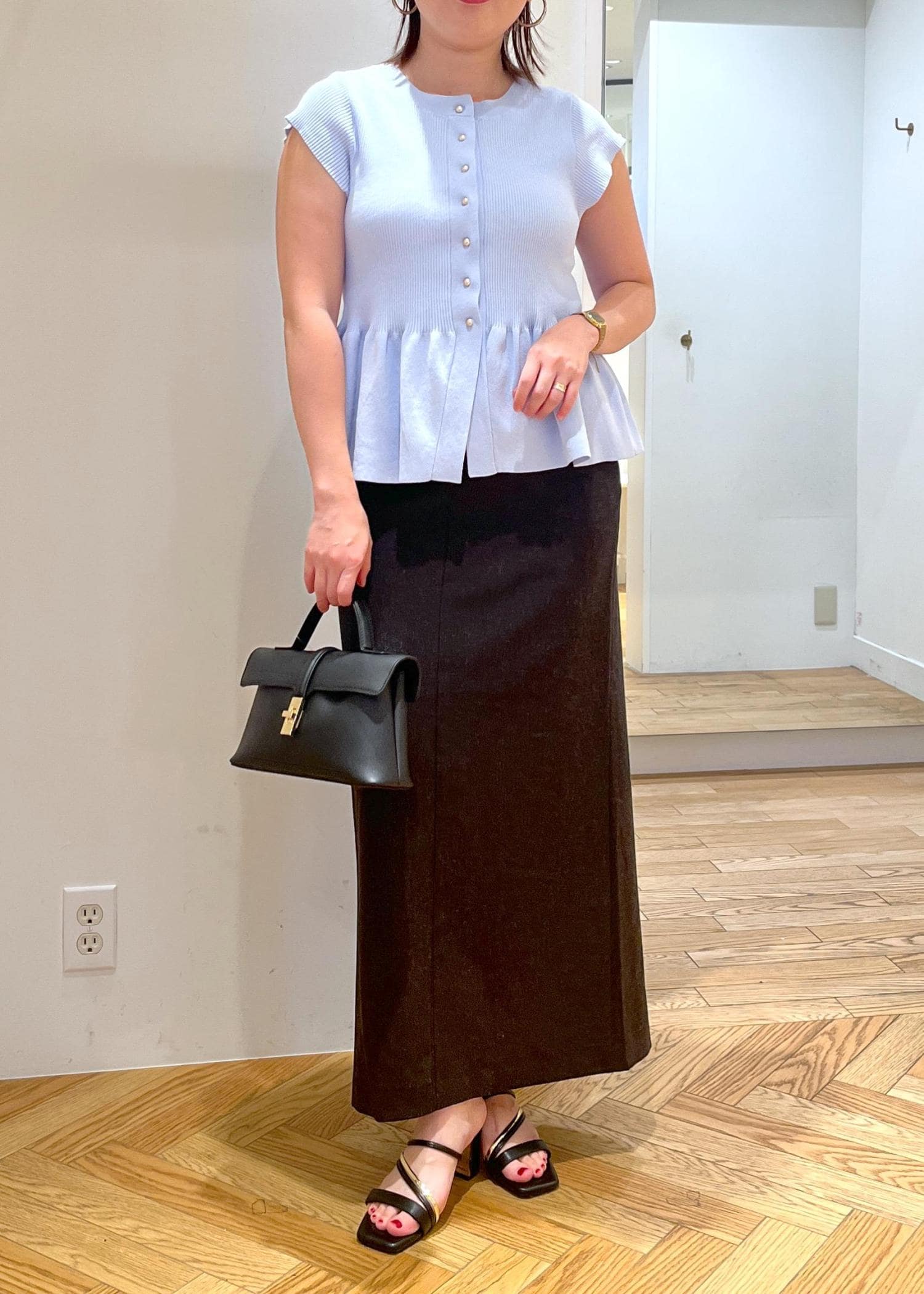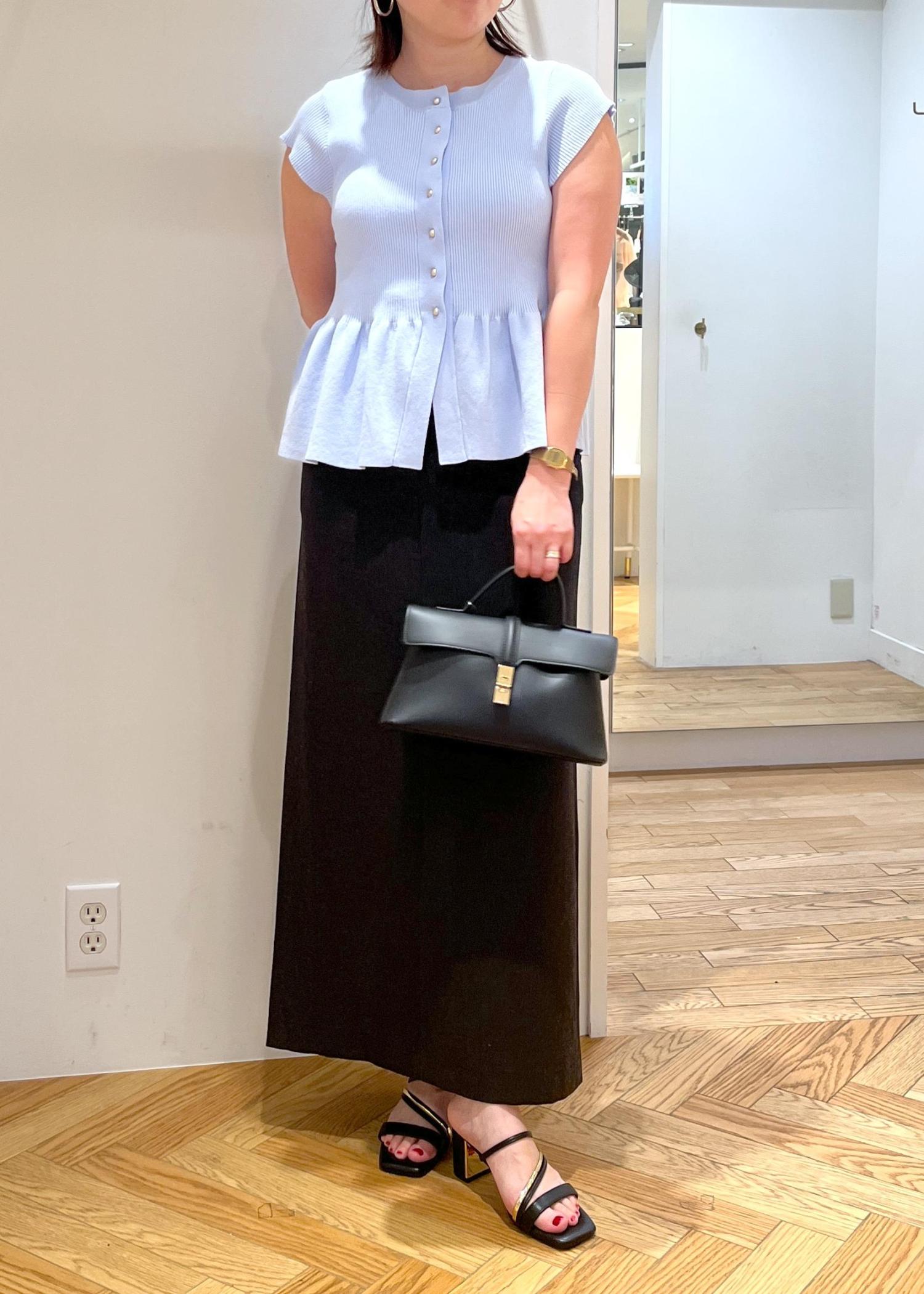 爽やかなブルー系のカーディガンに、スカート&小物はブラック系を合わせて、涼しげだけど大人なきちんと感も楽しめるコーディネートです。
