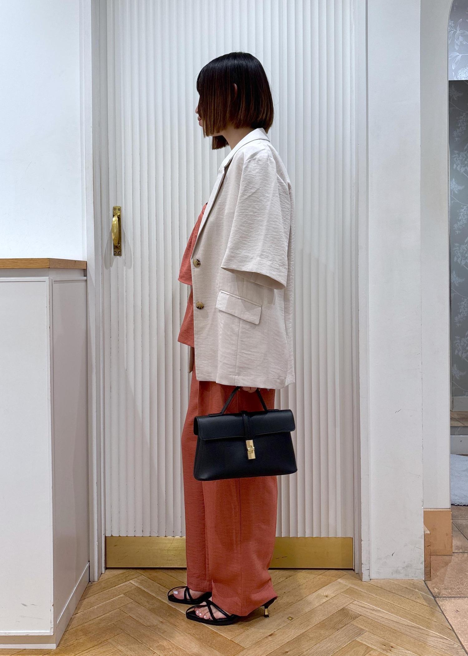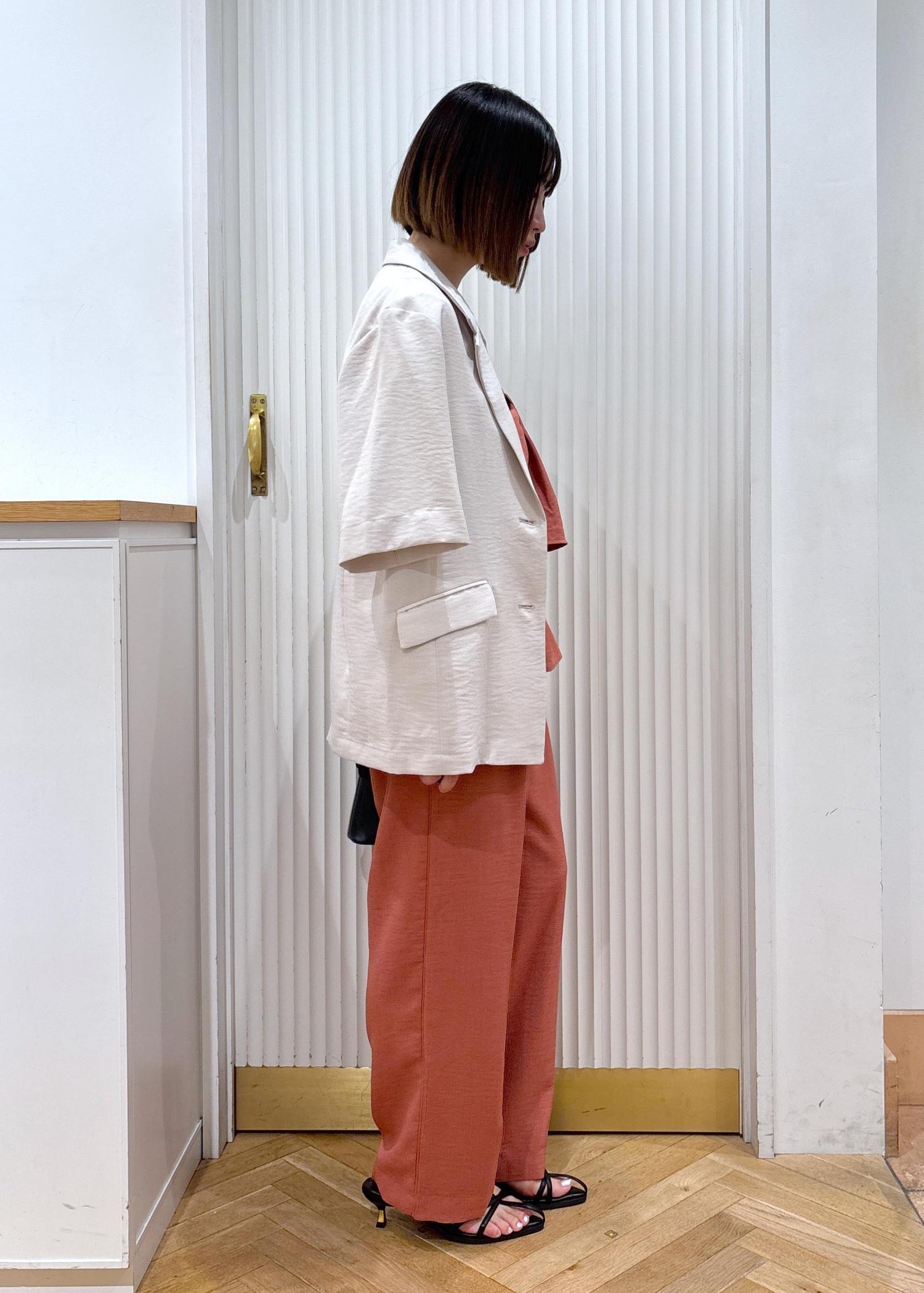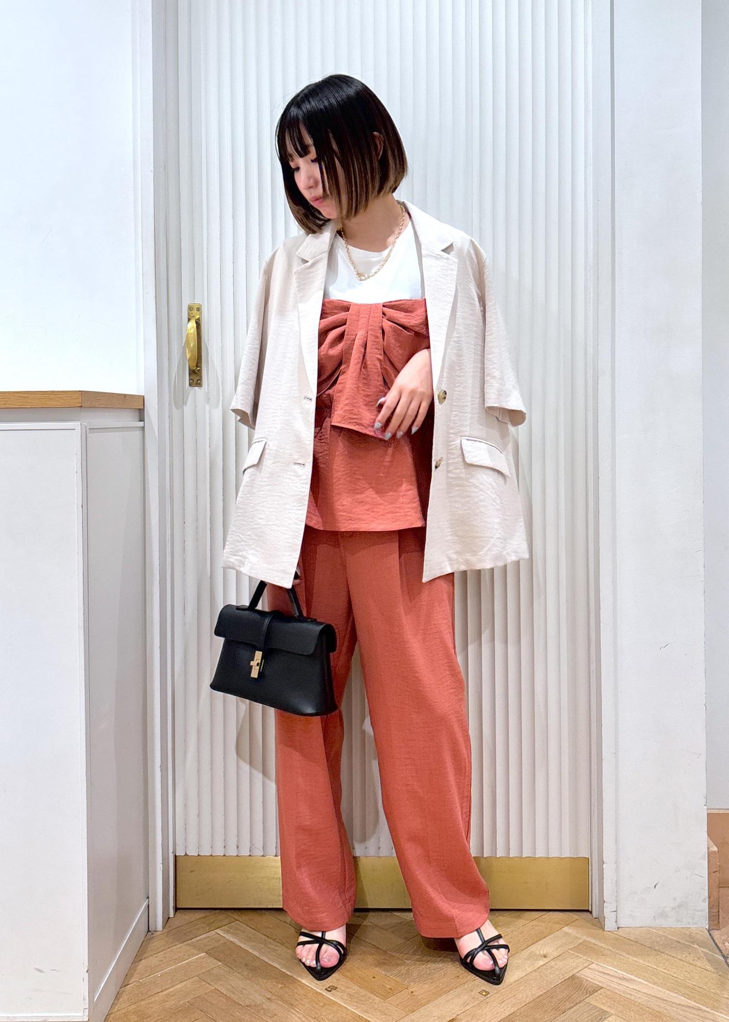 大人気リネンライクシリーズの新色オレンジを着用してみました。発色が強めだったので白のジャケットで色を柔らかくし、小物を黒にすることでうるさくなりすぎないカラー物のコーディネートになっています!