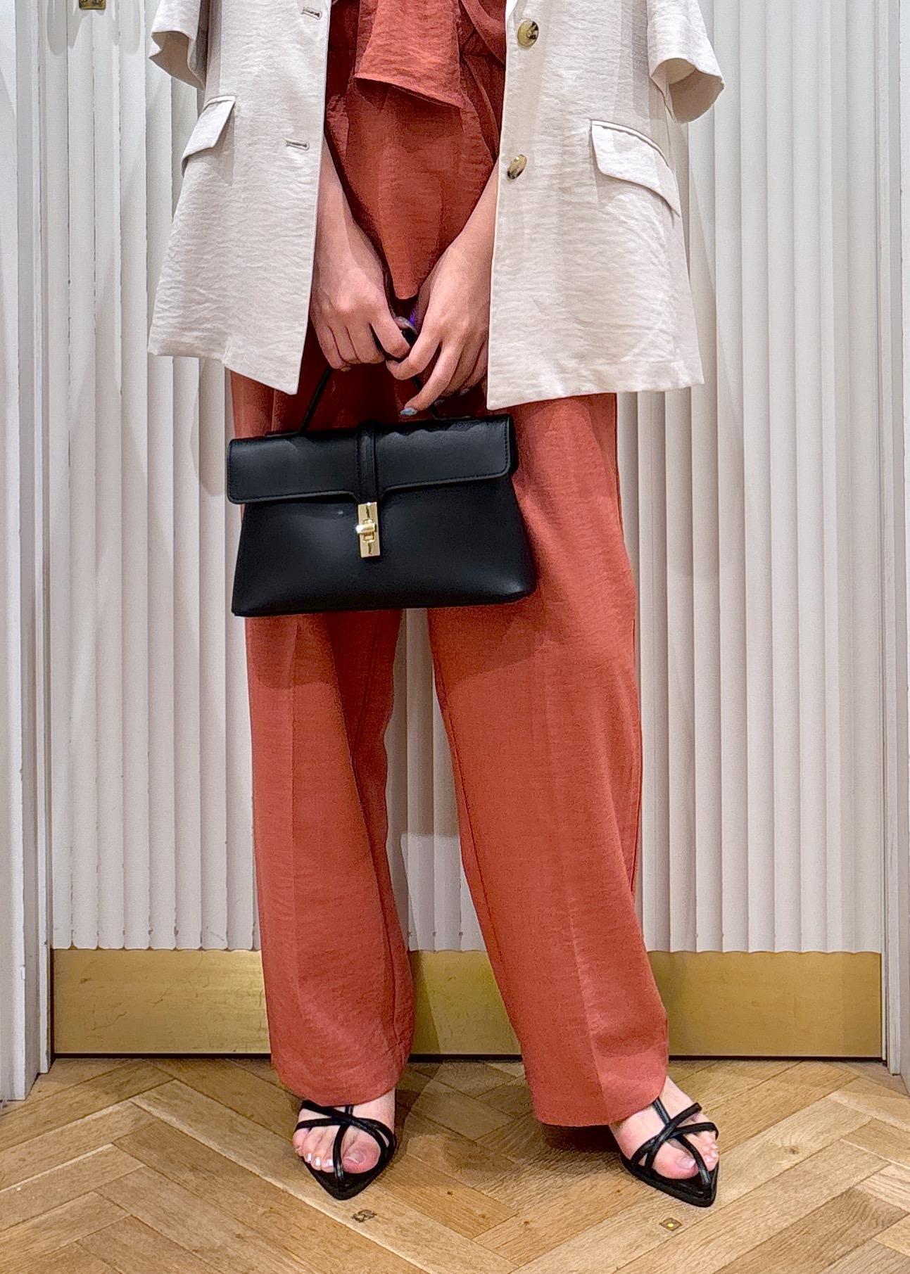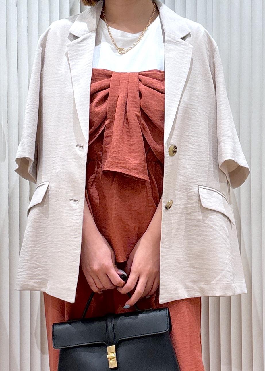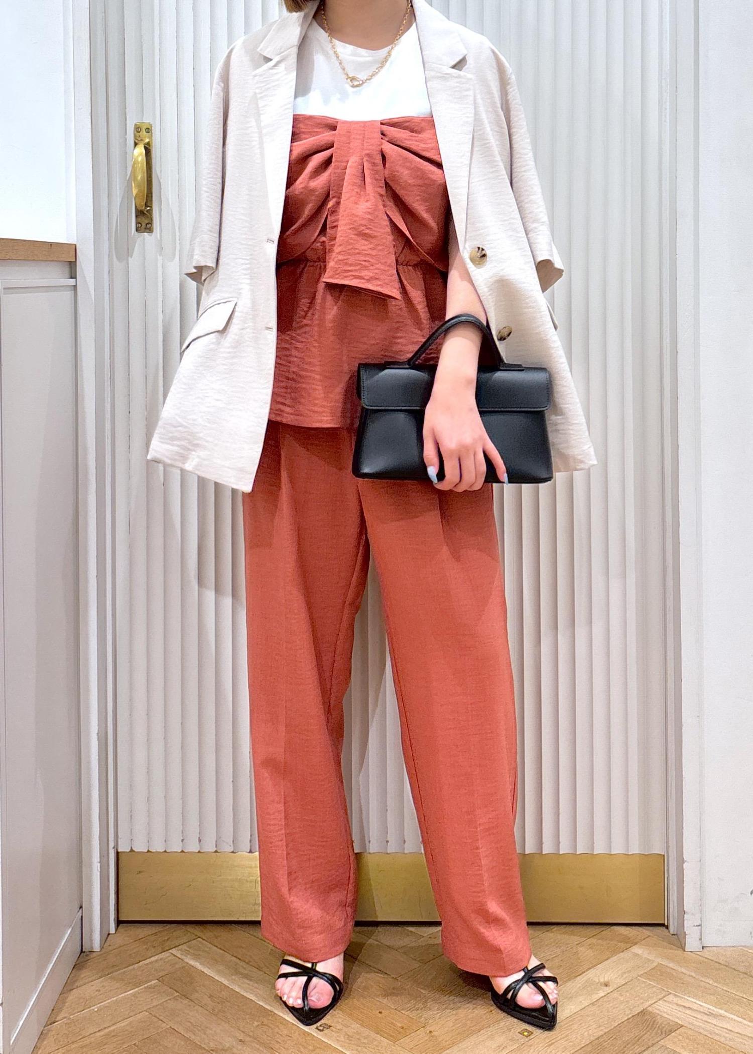 大人気リネンライクシリーズの新色オレンジを着用してみました。発色が強めだったので白のジャケットで色を柔らかくし、小物を黒にすることでうるさくなりすぎないカラー物のコーディネートになっています!