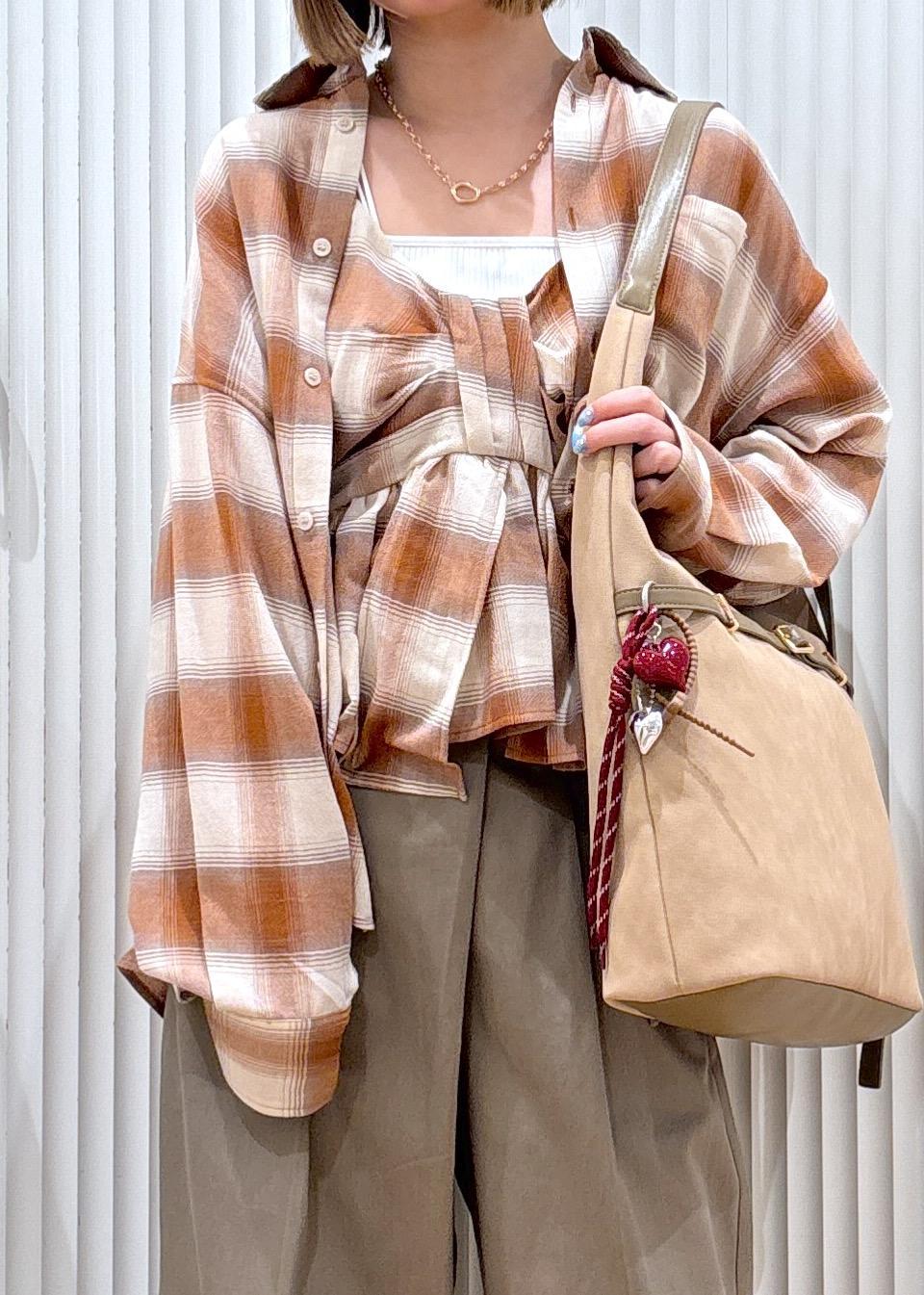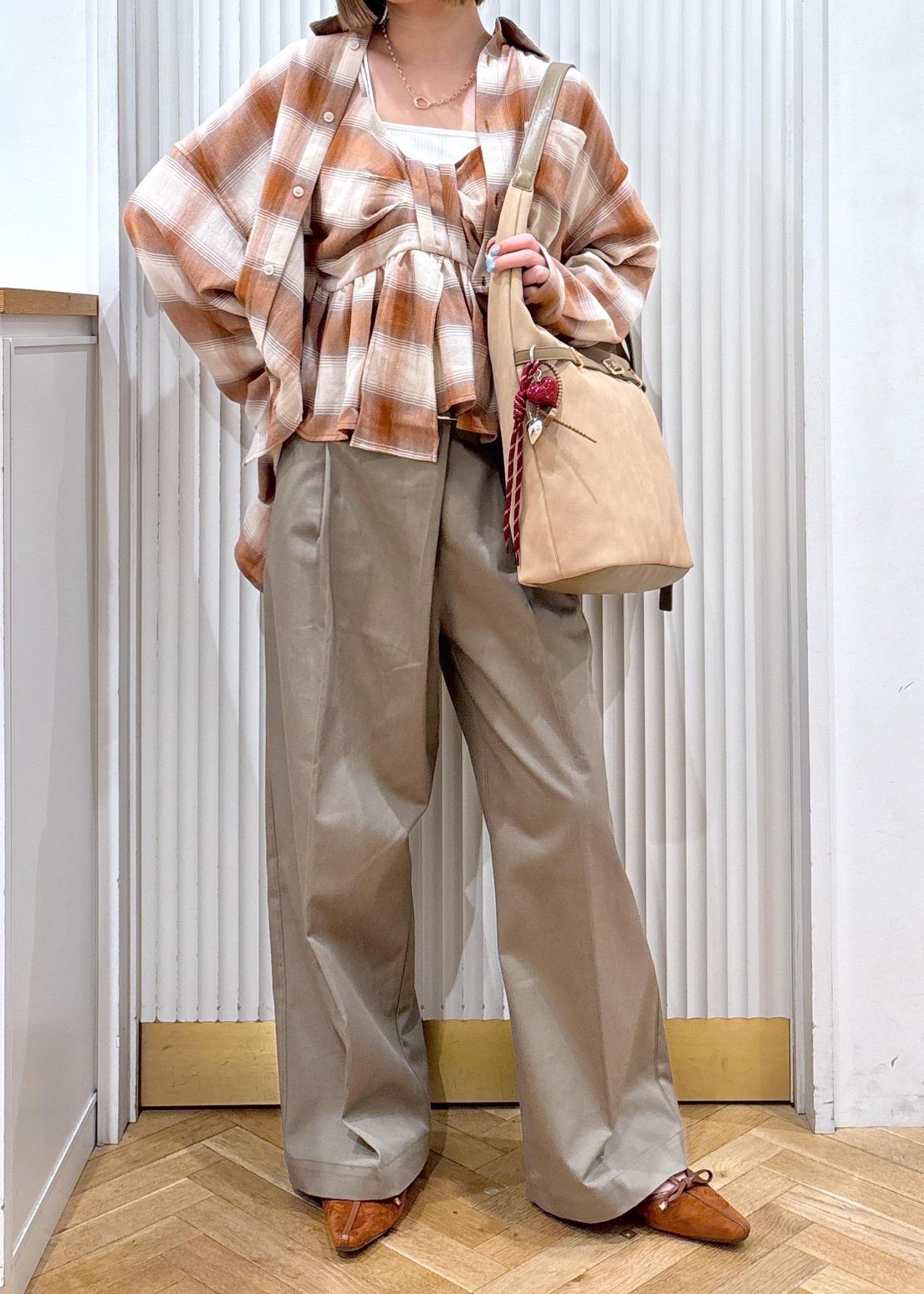 チェックのブラウスとビスチェにカーキのパンツで秋らしさのあるコーディネートです。小物もブラウンにすることでコーディネート全体が秋らしくなります!